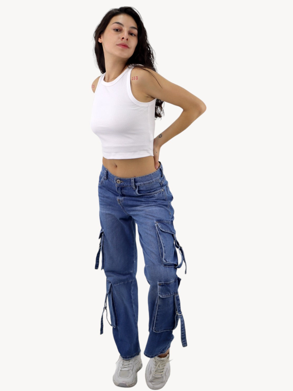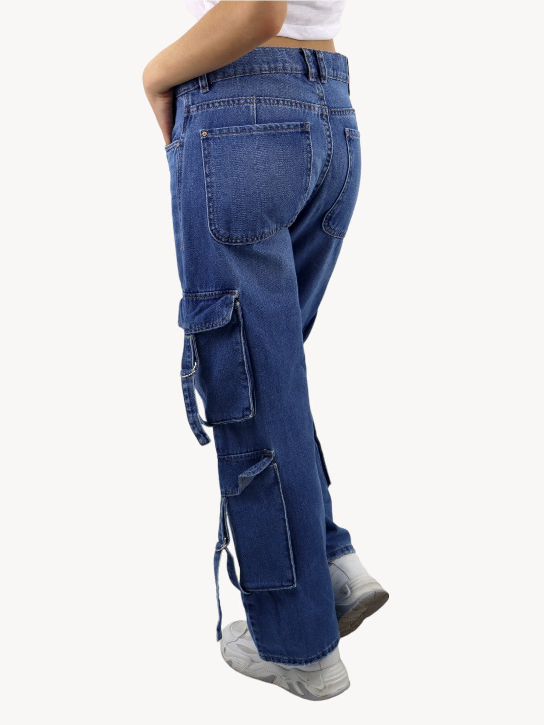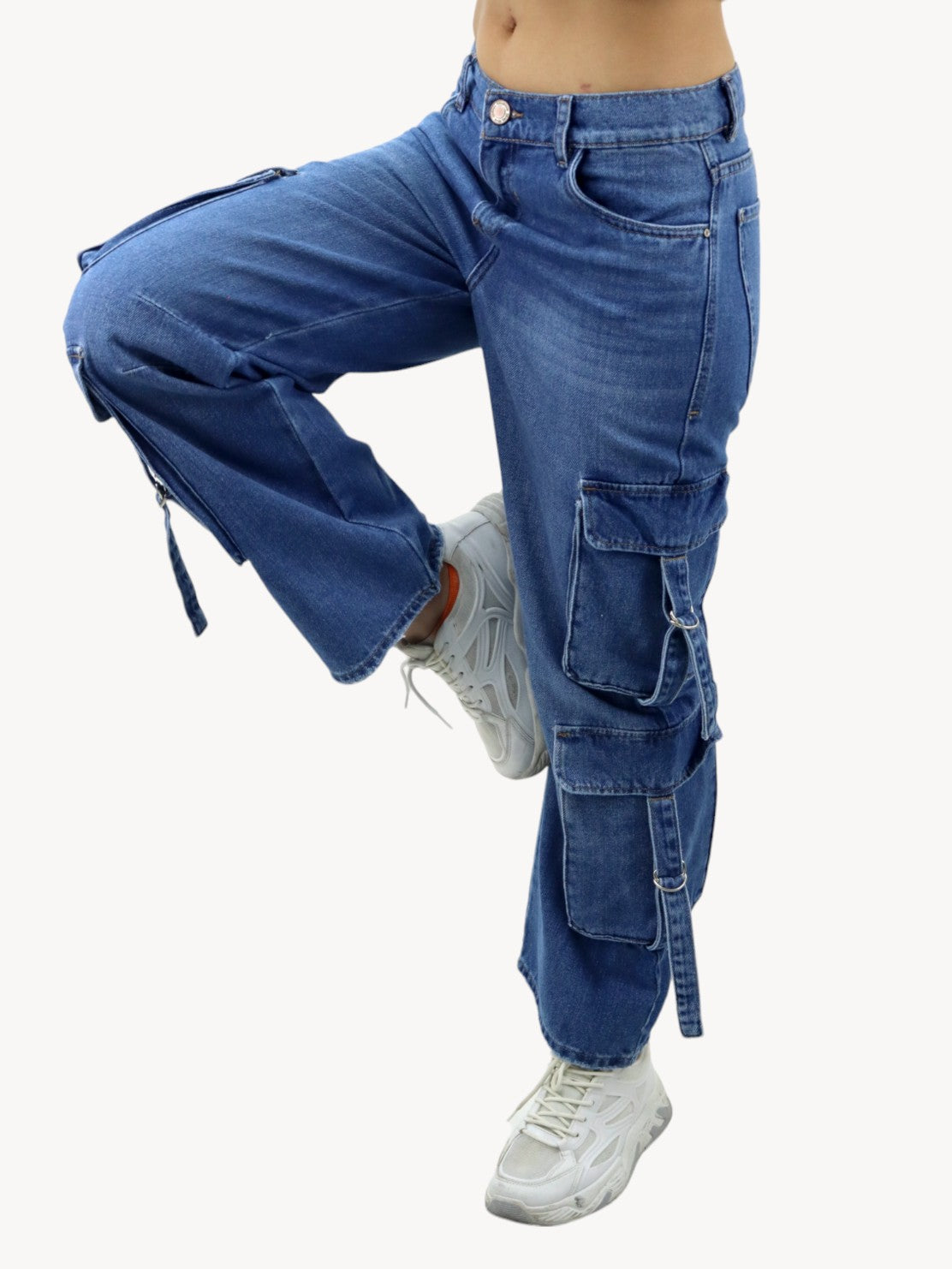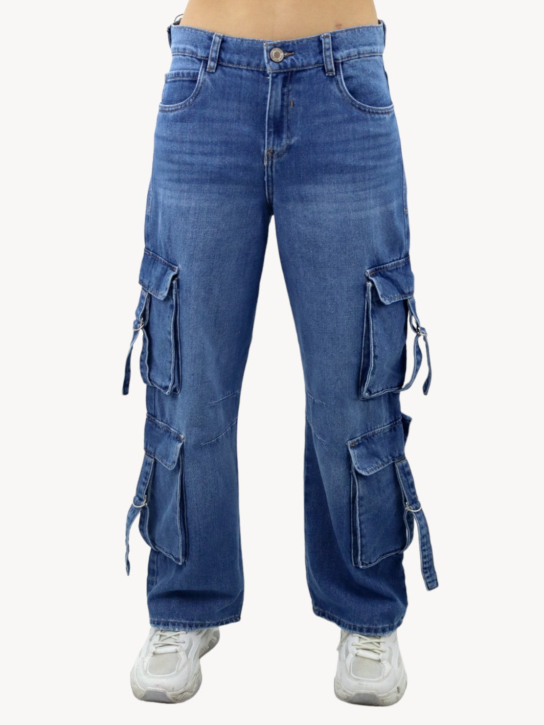 Jeans cargo tiro medio de color azul medio, con bolsas delanteras/traseras. Cierre de botón y cremallera
