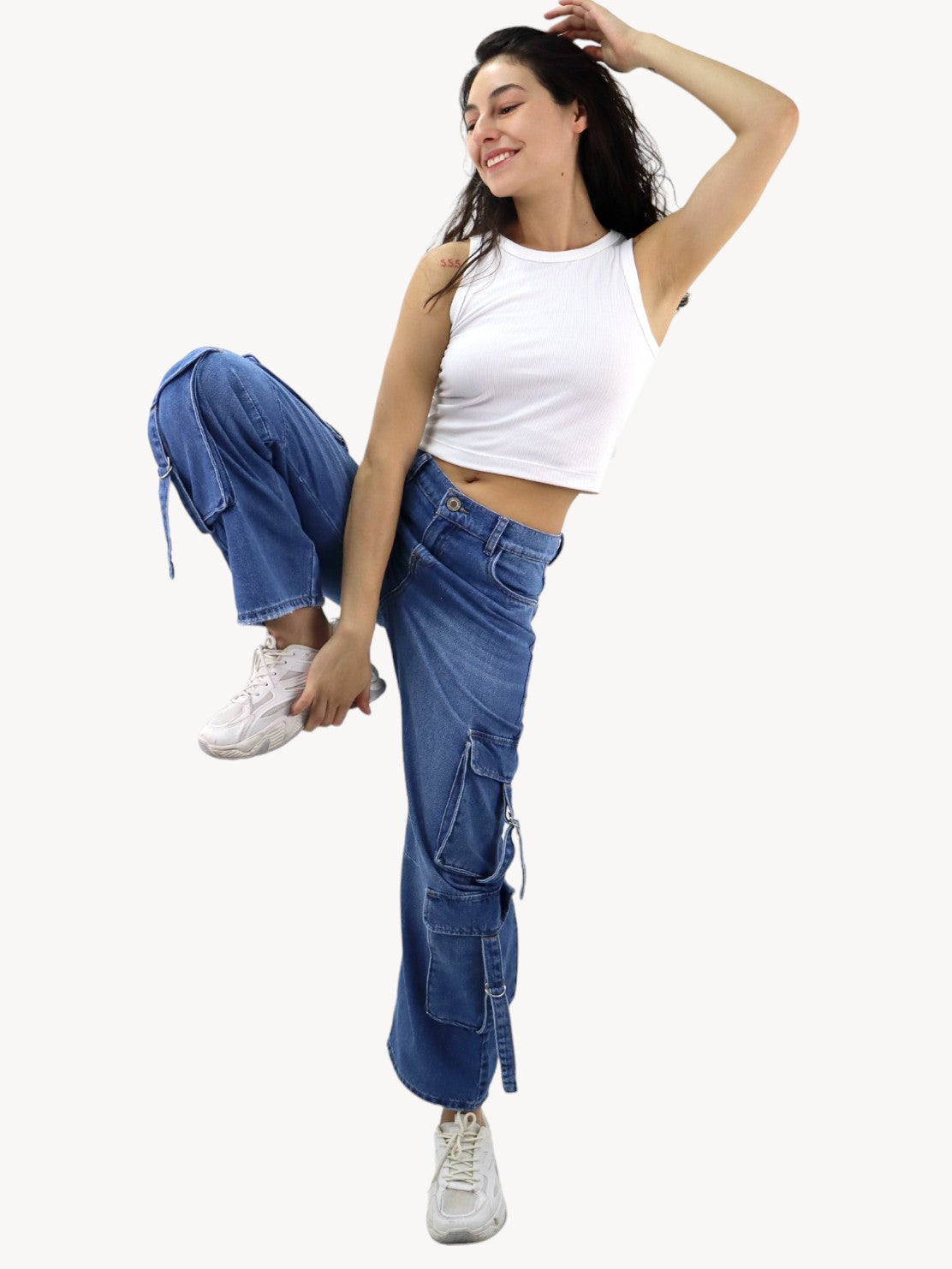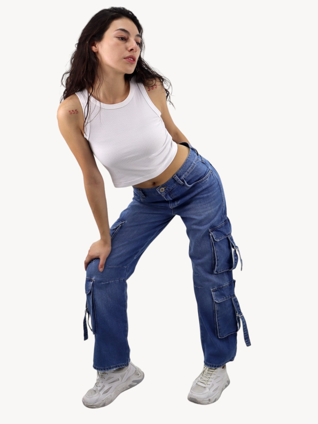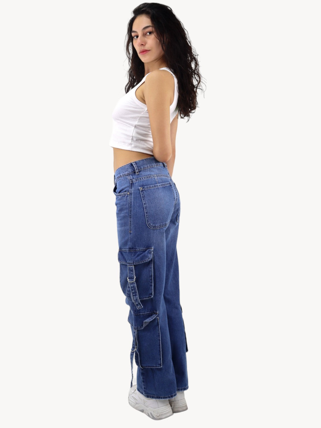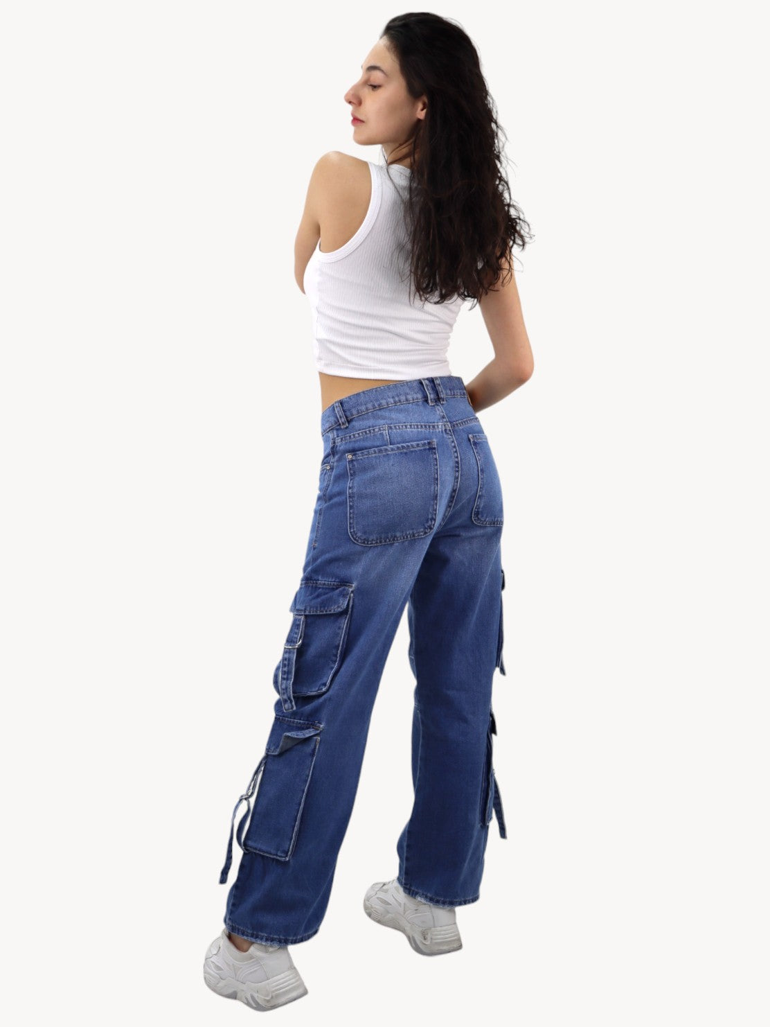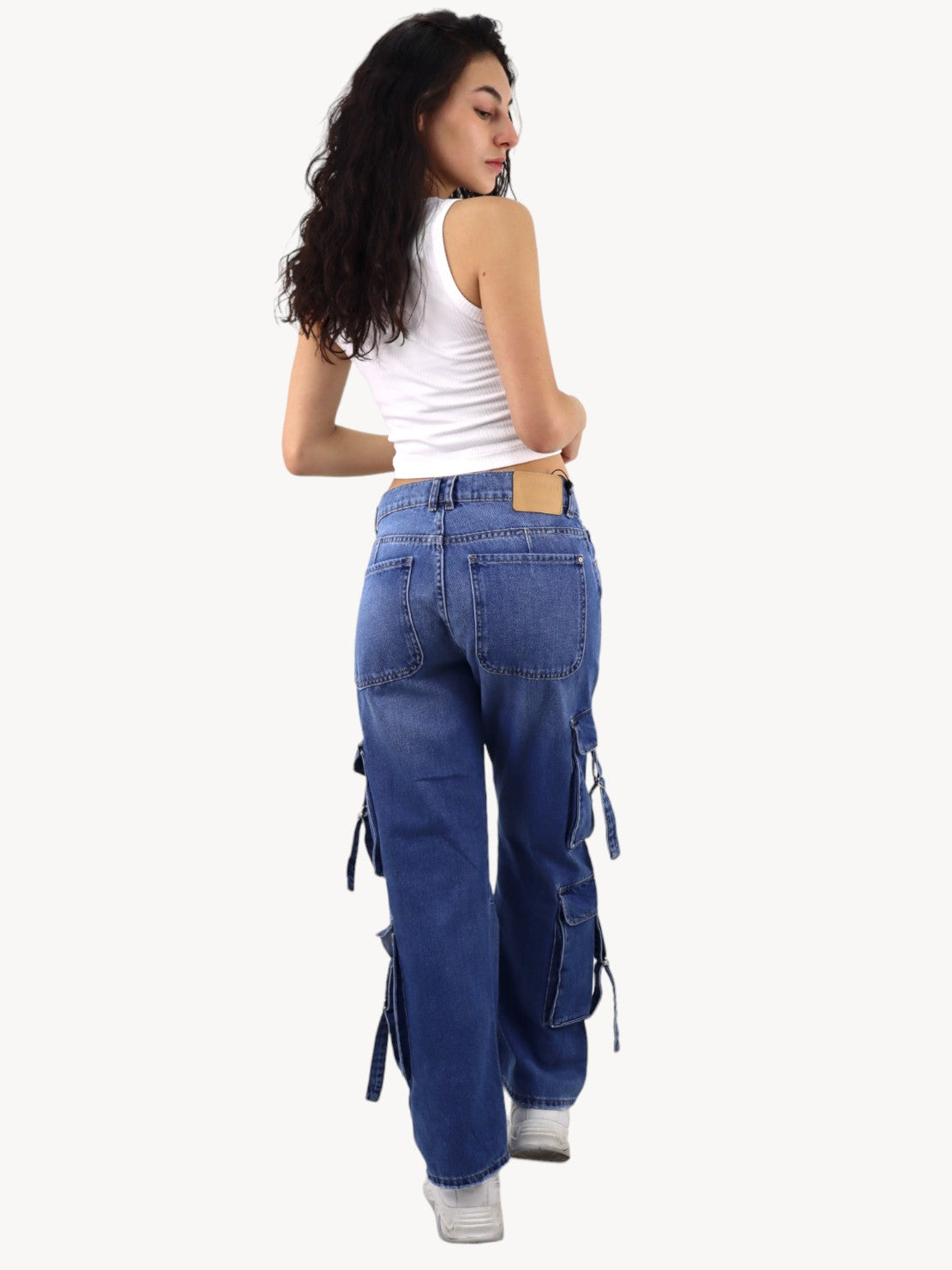 Jeans cargo tiro medio de color azul medio, con bolsas delanteras/traseras. Cierre de botón y cremallera