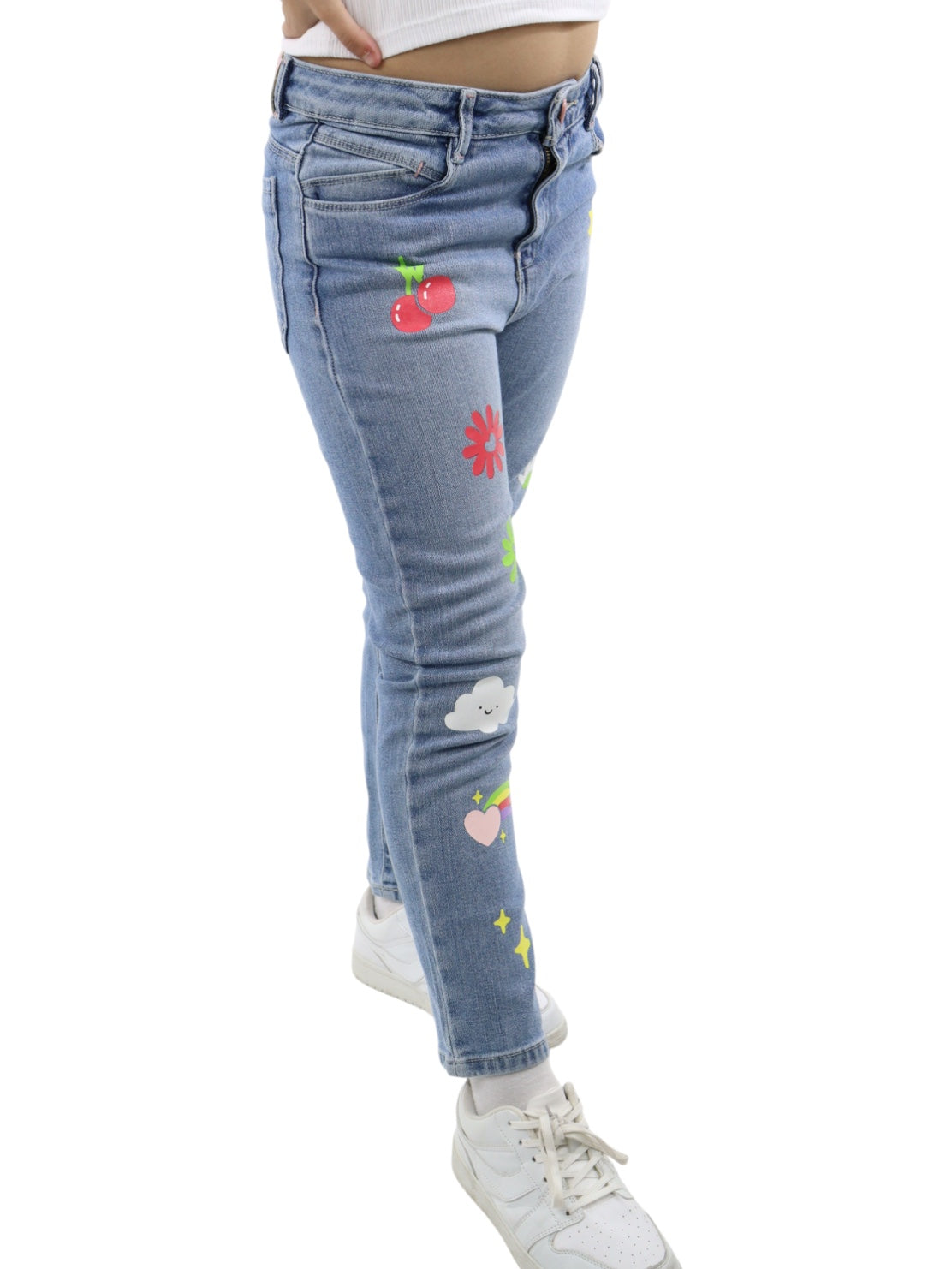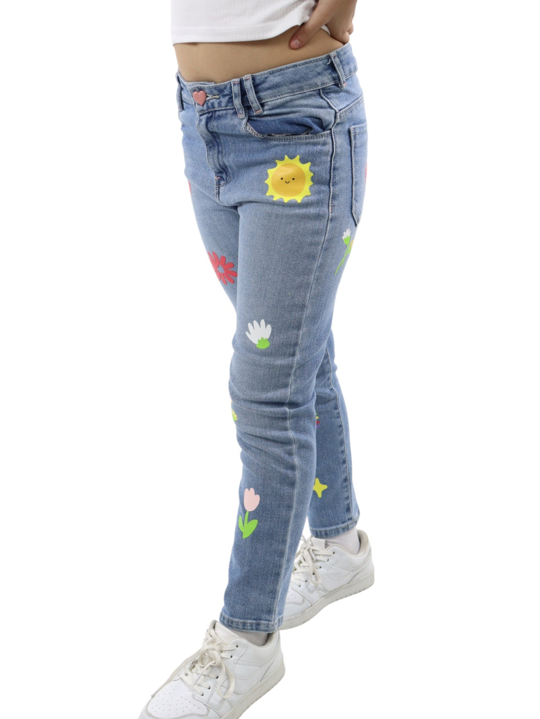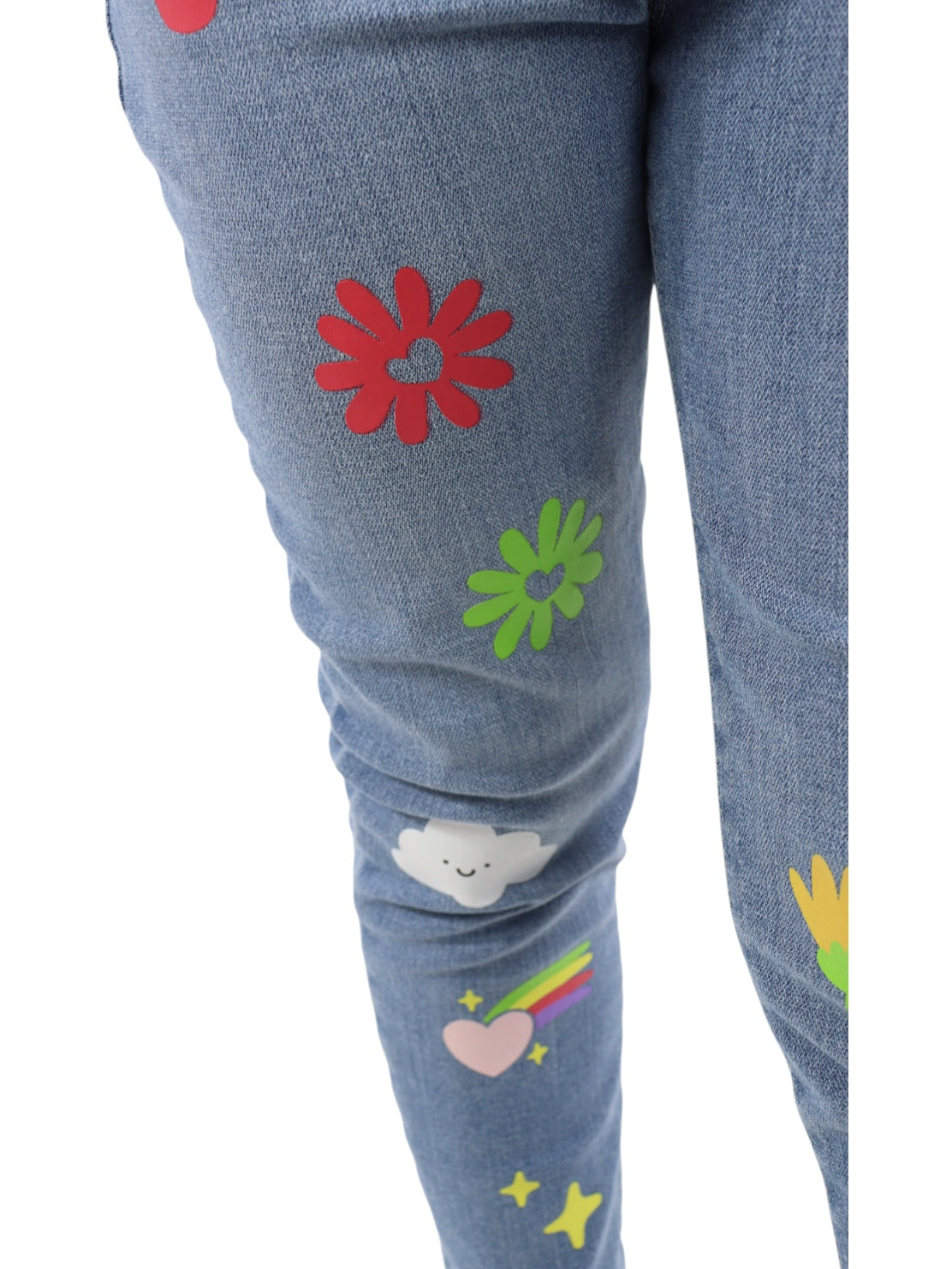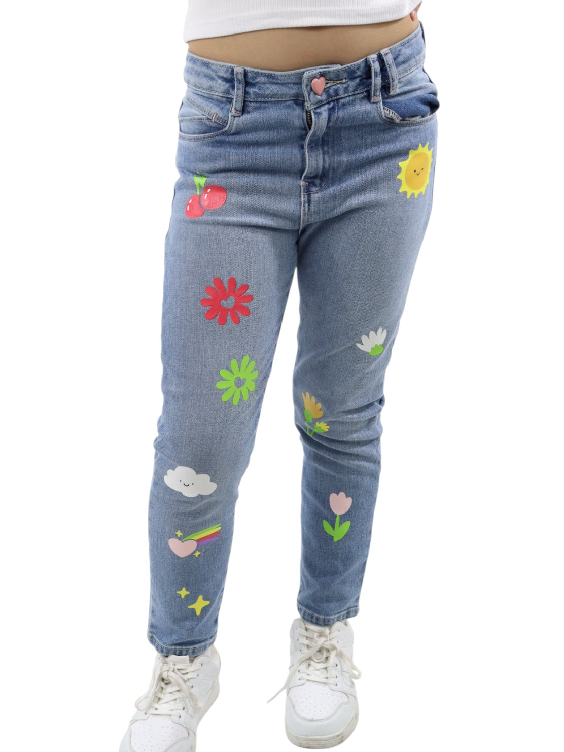 Jeans mom clasic de talle alto, con bolsillos en la parte delantera y trasera, cierre de botón y cremallera. Lavado azul medio con estampado