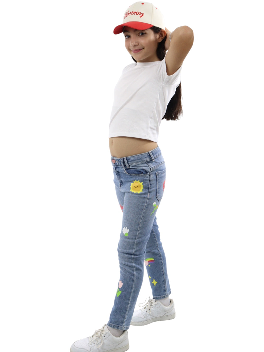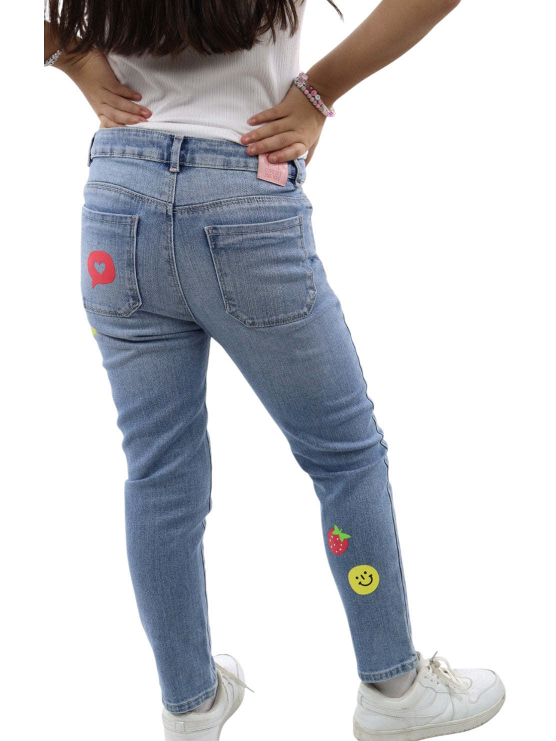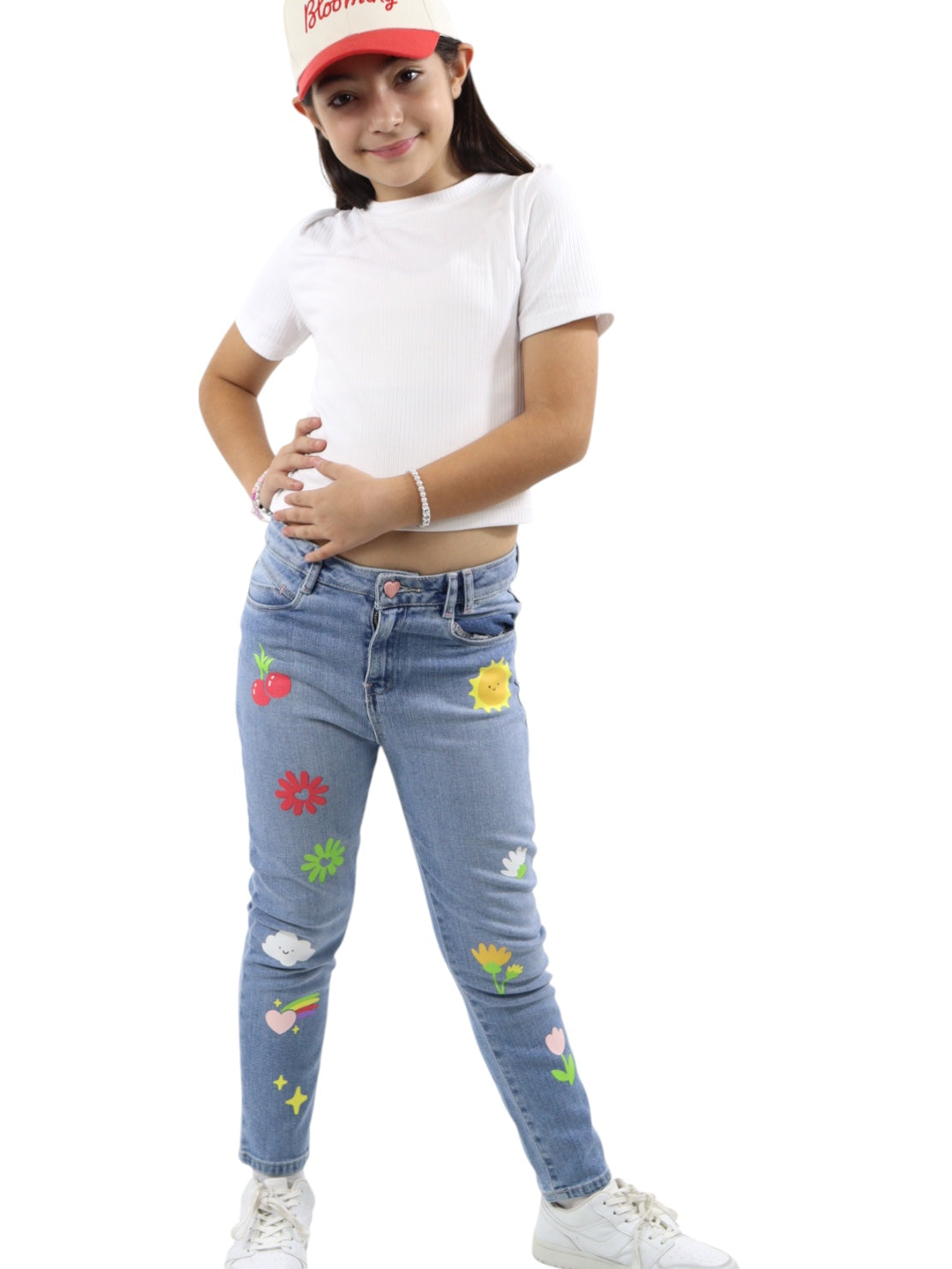 Jeans mom clasic de talle alto, con bolsillos en la parte delantera y trasera, cierre de botón y cremallera. Lavado azul medio con estampado