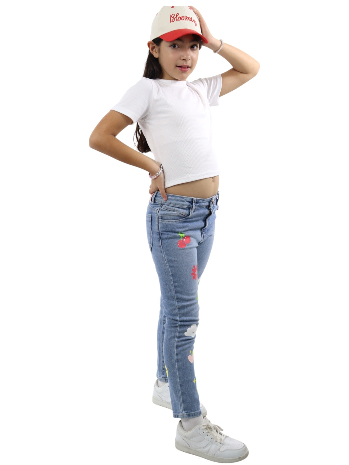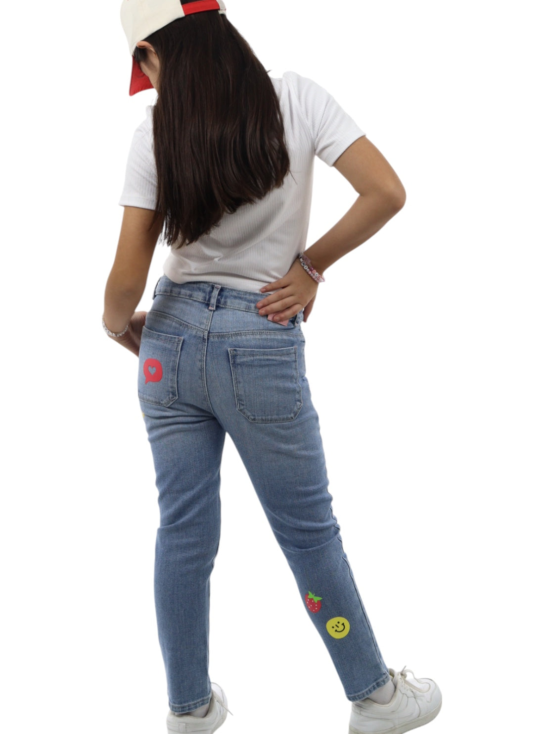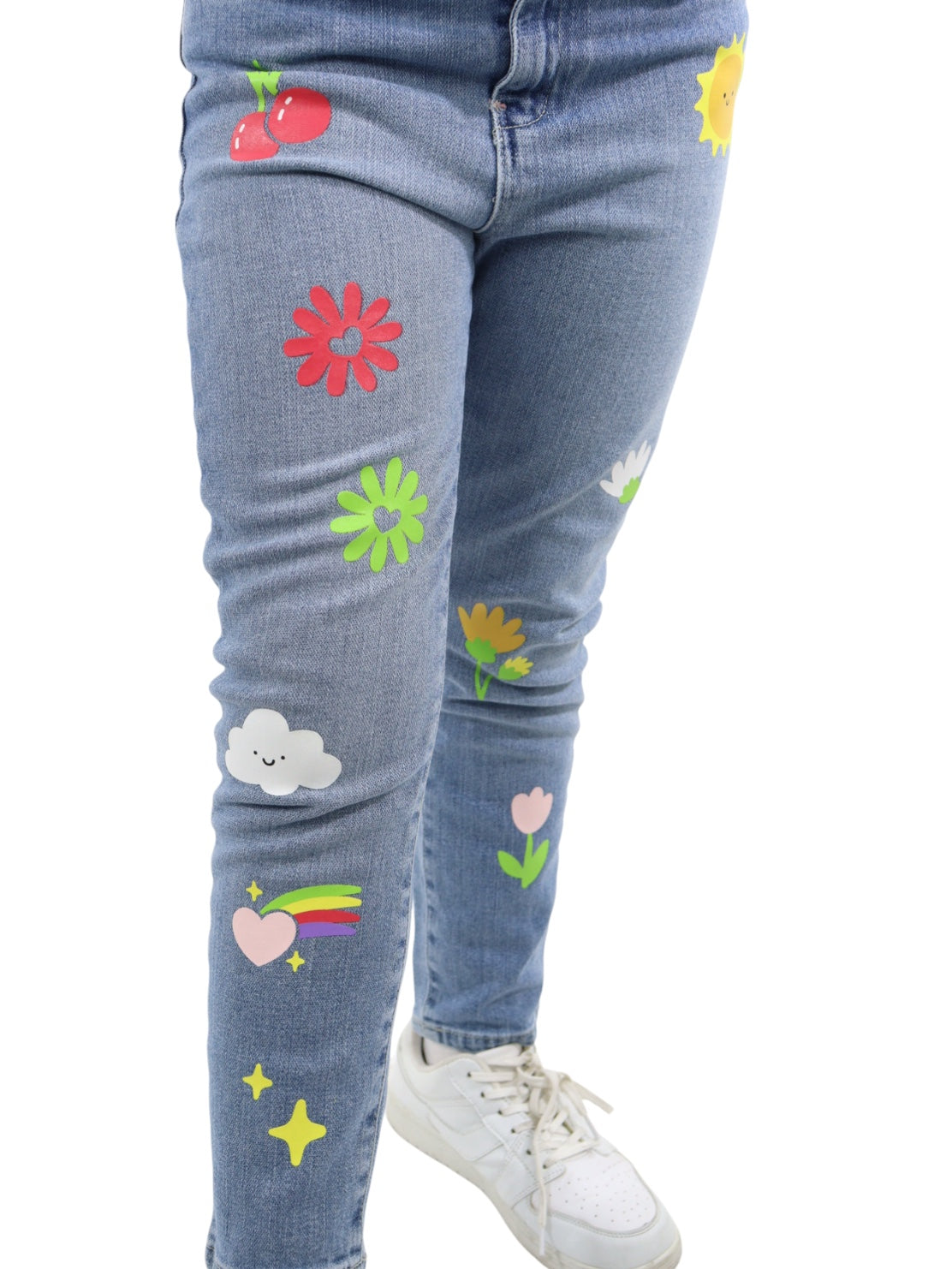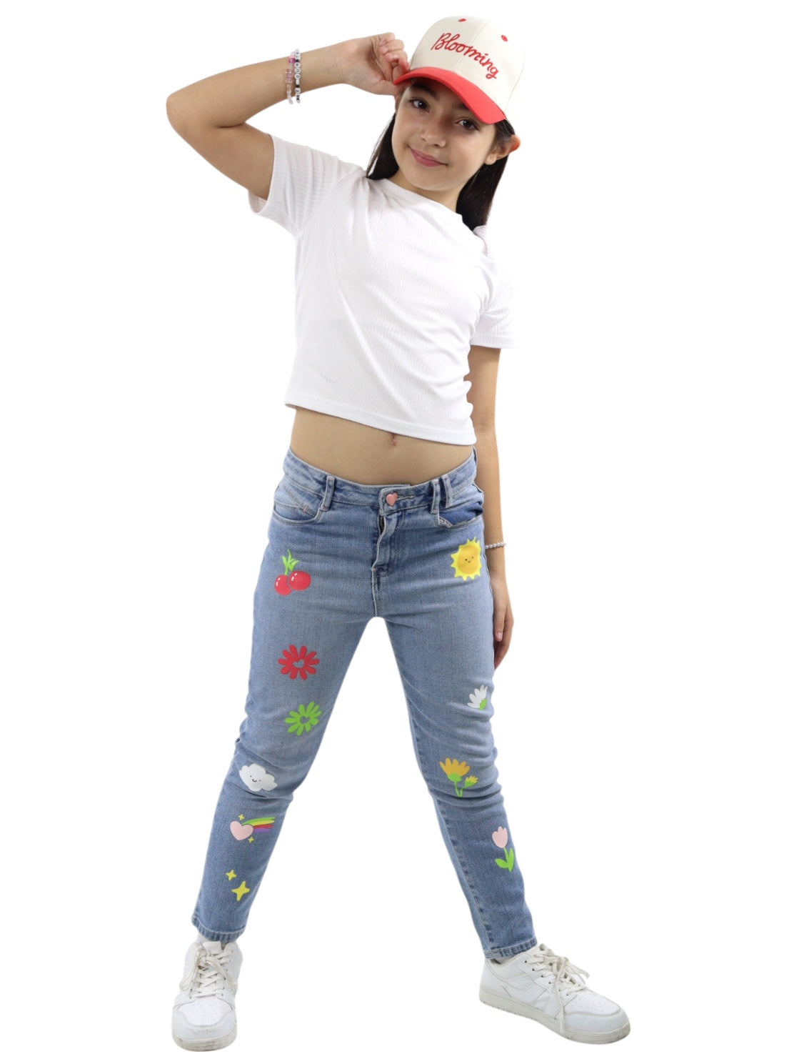Jeans mom clasic de talle alto, con bolsillos en la parte delantera y trasera, cierre de botón y cremallera. Lavado azul medio con estampado