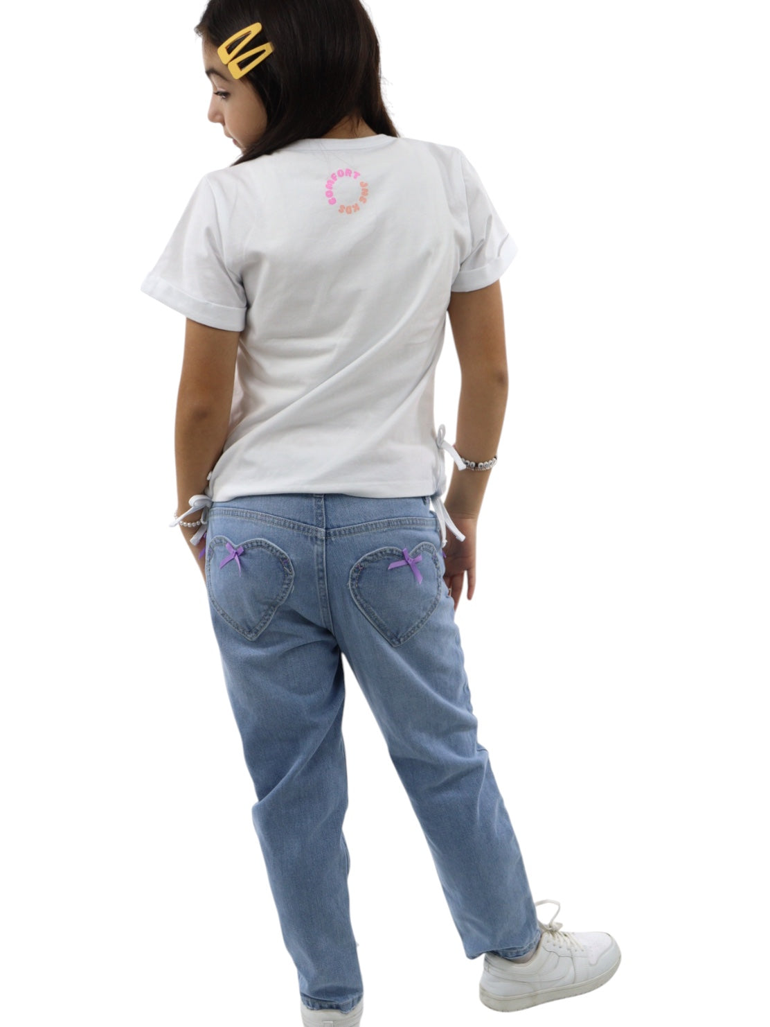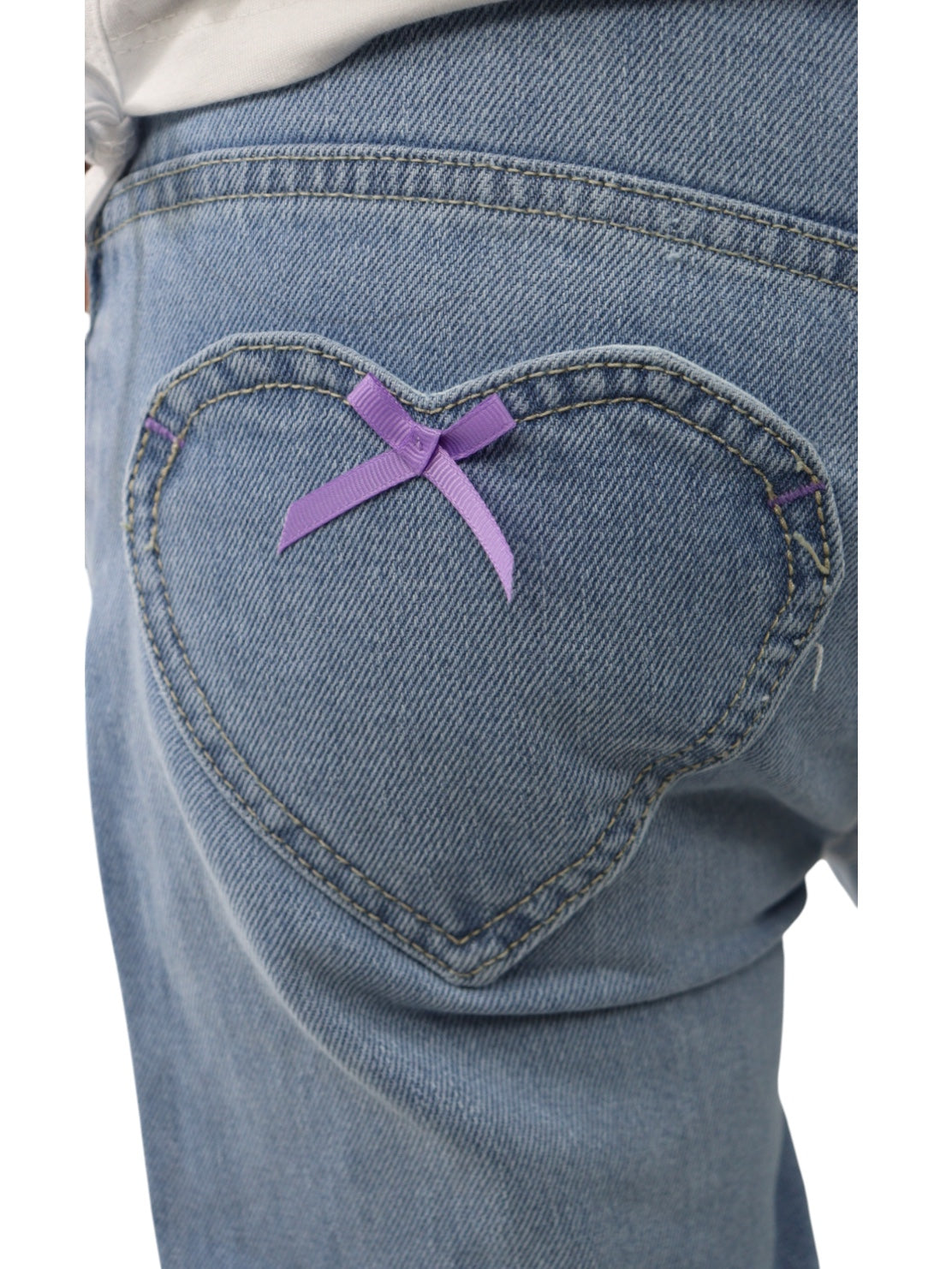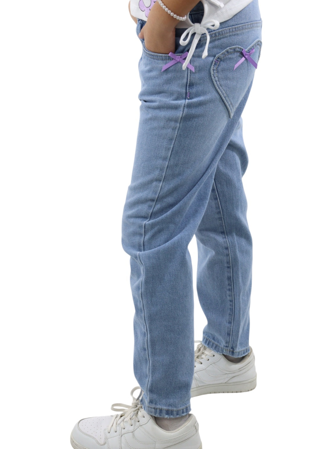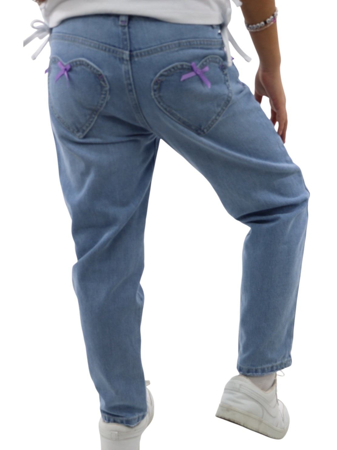 Jeans mom clasic de talle alto, con bolsillos en la parte delantera y trasera en forma de corazón, cierre de botón y cremallera. Lavado azul medio