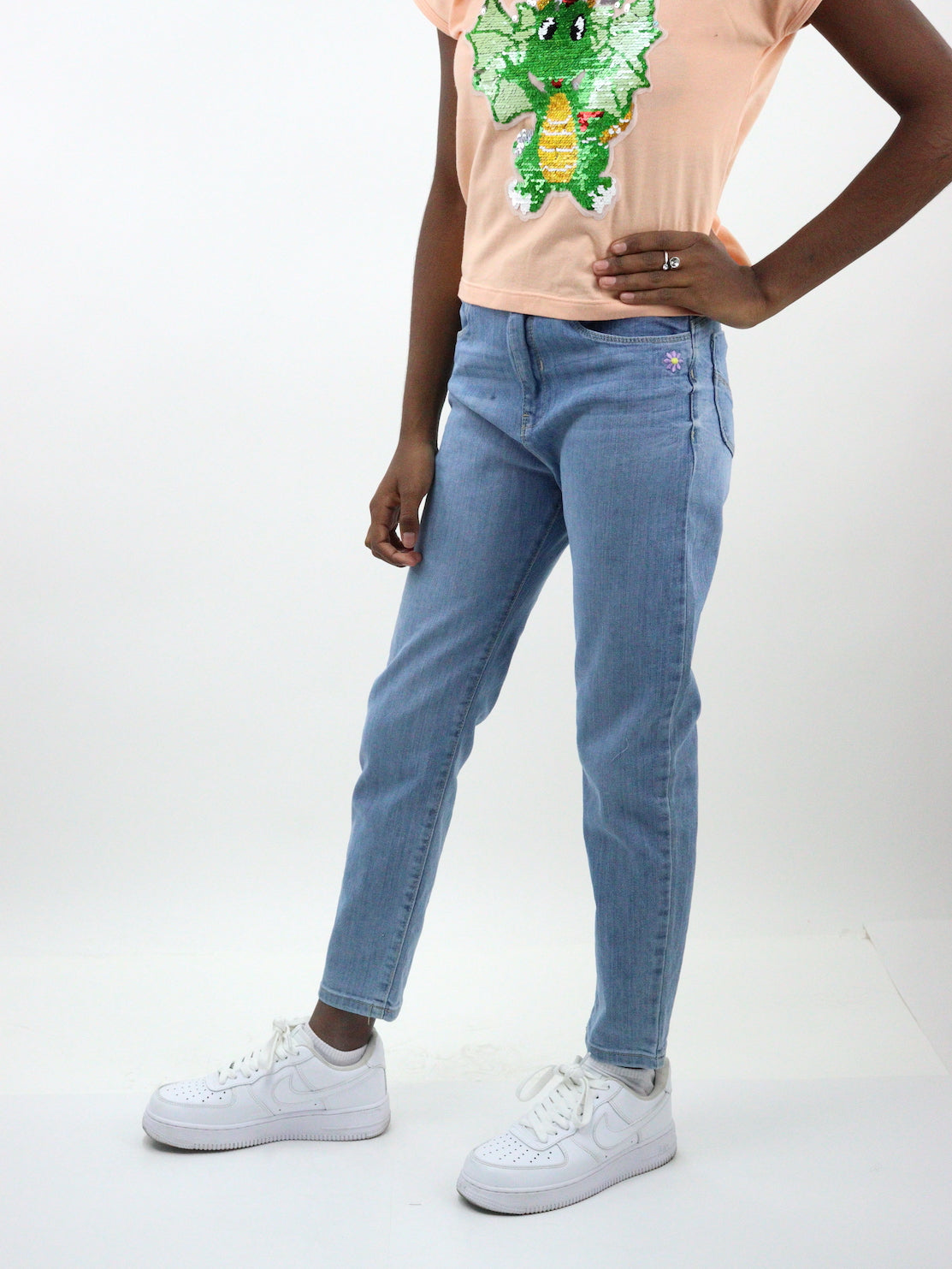 Jeans mom clasic con bordado floral de color azul claro, con bolsas delanteras/traseras. Cierre de botón y cremallera.