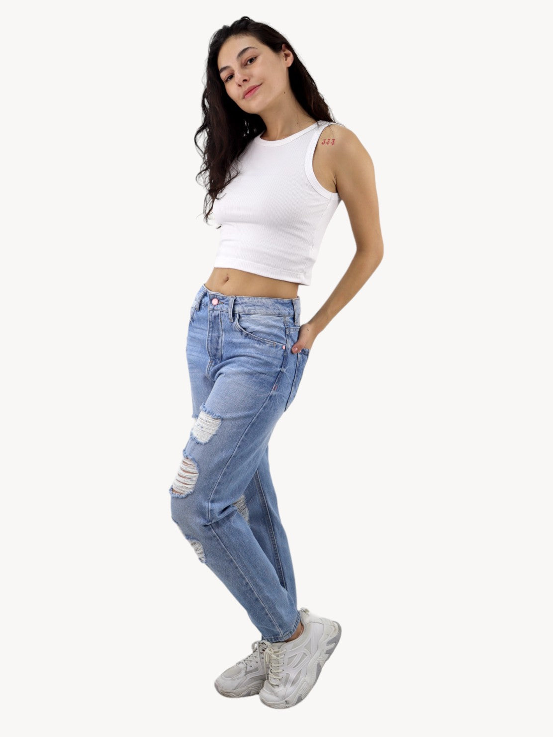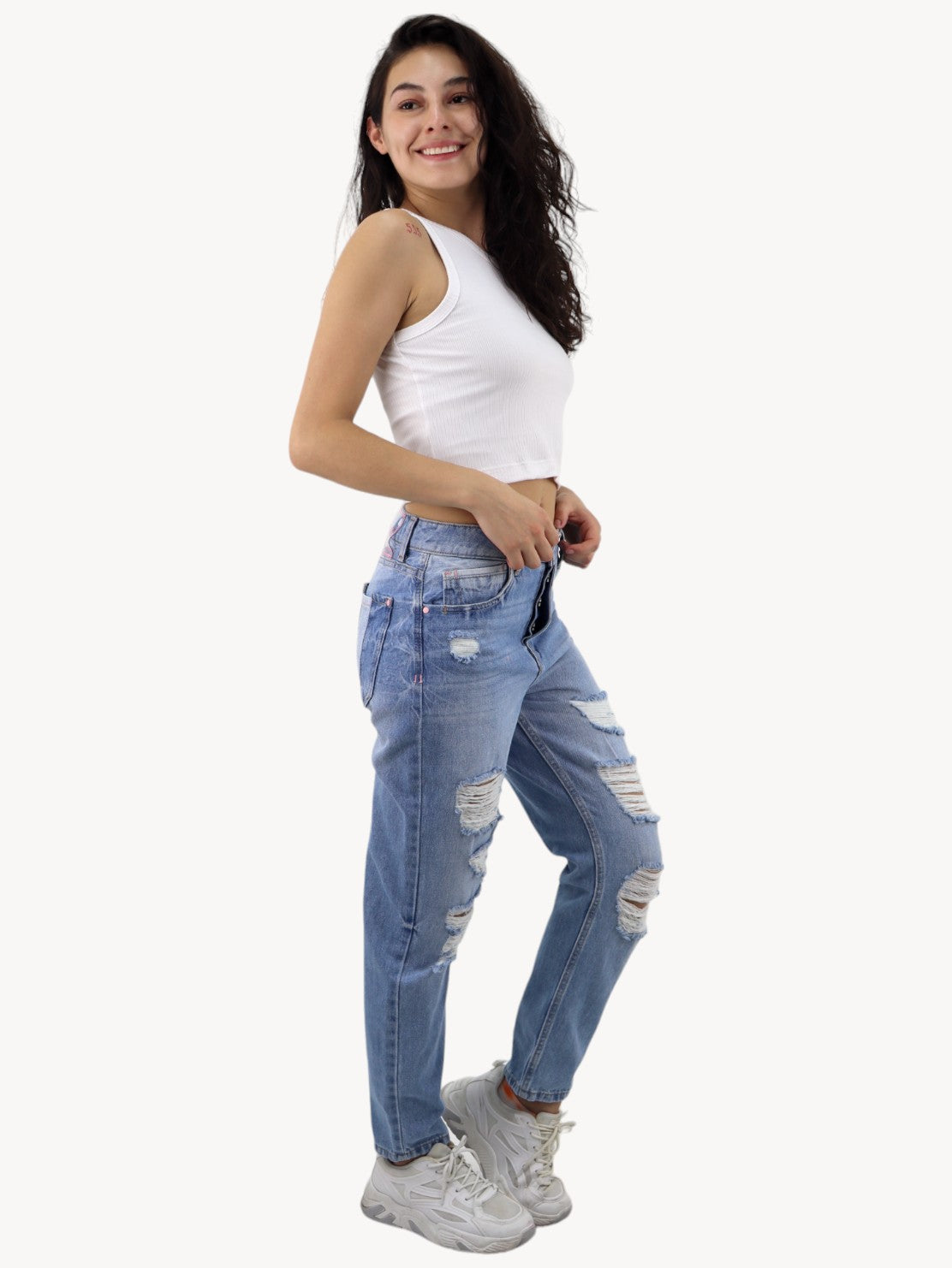 Jeans mom clasic de mezclilla rígida color azul claro con destrucción, con bolsas delanteras/traseras. Cierre de botón y cremallera