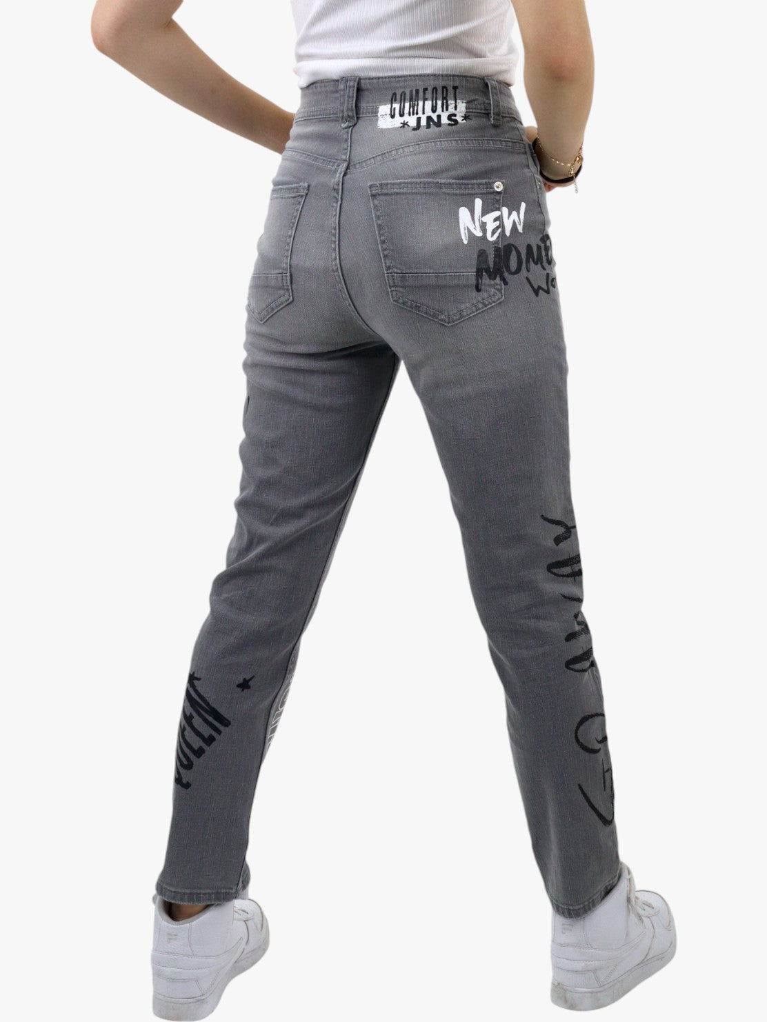 Jeans mom clasic de mezclilla stretch color gris con estampado, con bolsas delanteras/traseras. Cierre de botón y cremallera