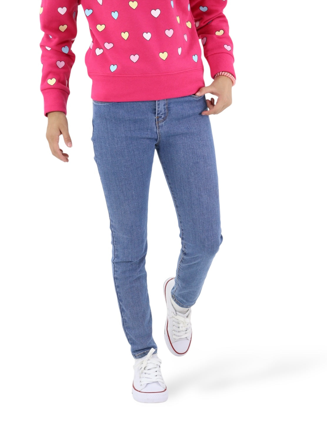 Jeans skinny de talle alto, con bolsillos en la parte delantera y trasera, cierre de botón y cremallera, pierna ajustada. Lavado azul oscuro con bordados, ligeramente ensuciado, aspecto sucio.
