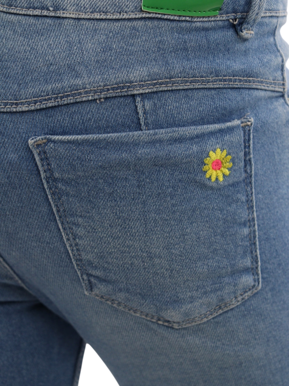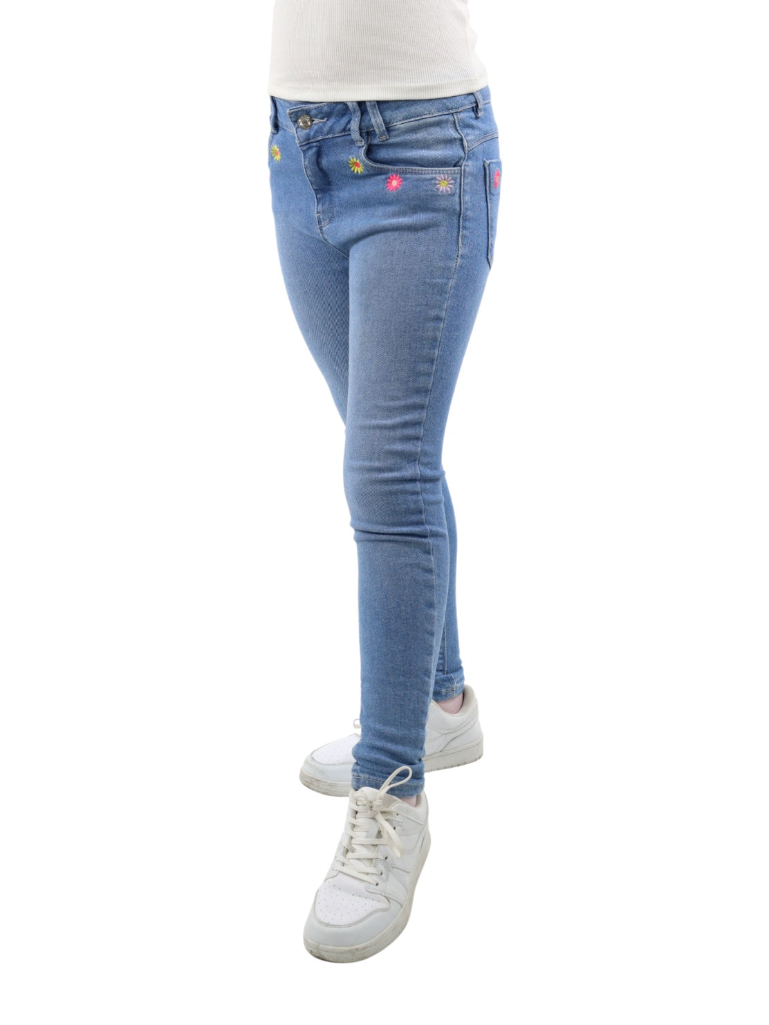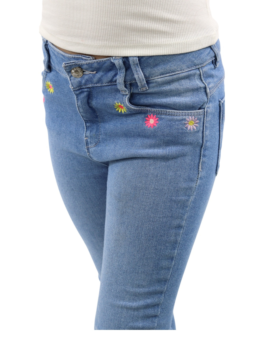 Jeans skinny de talle alto, con bolsillos en la parte delantera y trasera, cierre de botón y cremallera, pierna ajustada. Lavado azul medio con bordado floral