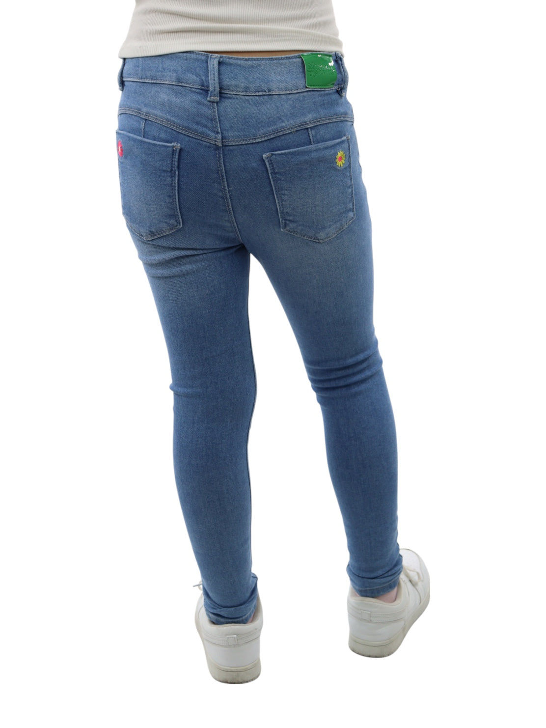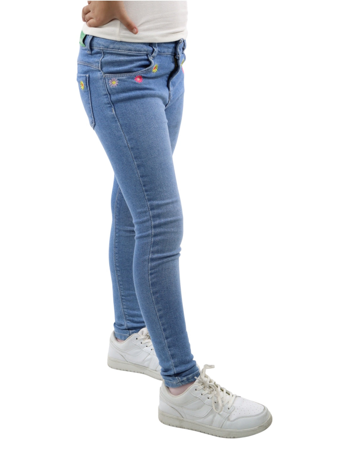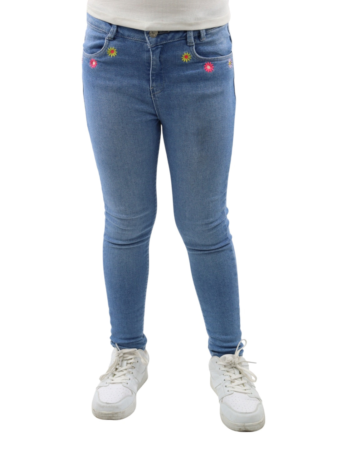 Jeans skinny de talle alto, con bolsillos en la parte delantera y trasera, cierre de botón y cremallera, pierna ajustada. Lavado azul medio con bordado floral