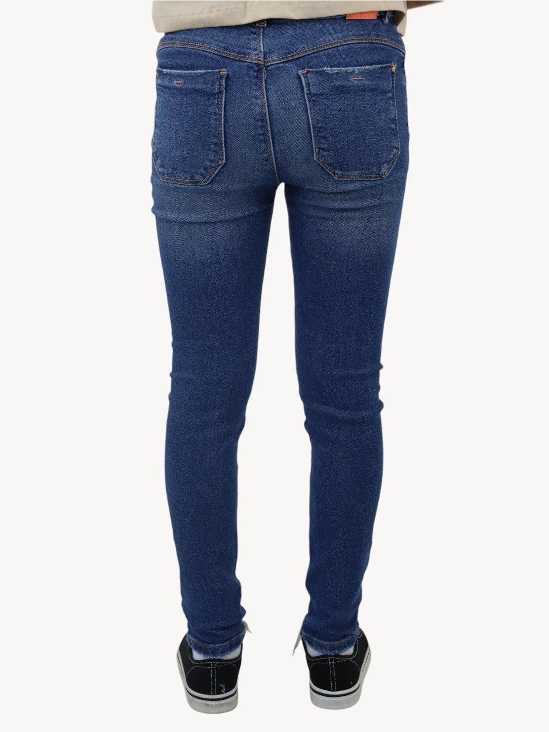 Jeans skinny de mezclilla stretch color azul medio con destrucción y colgante decorativo