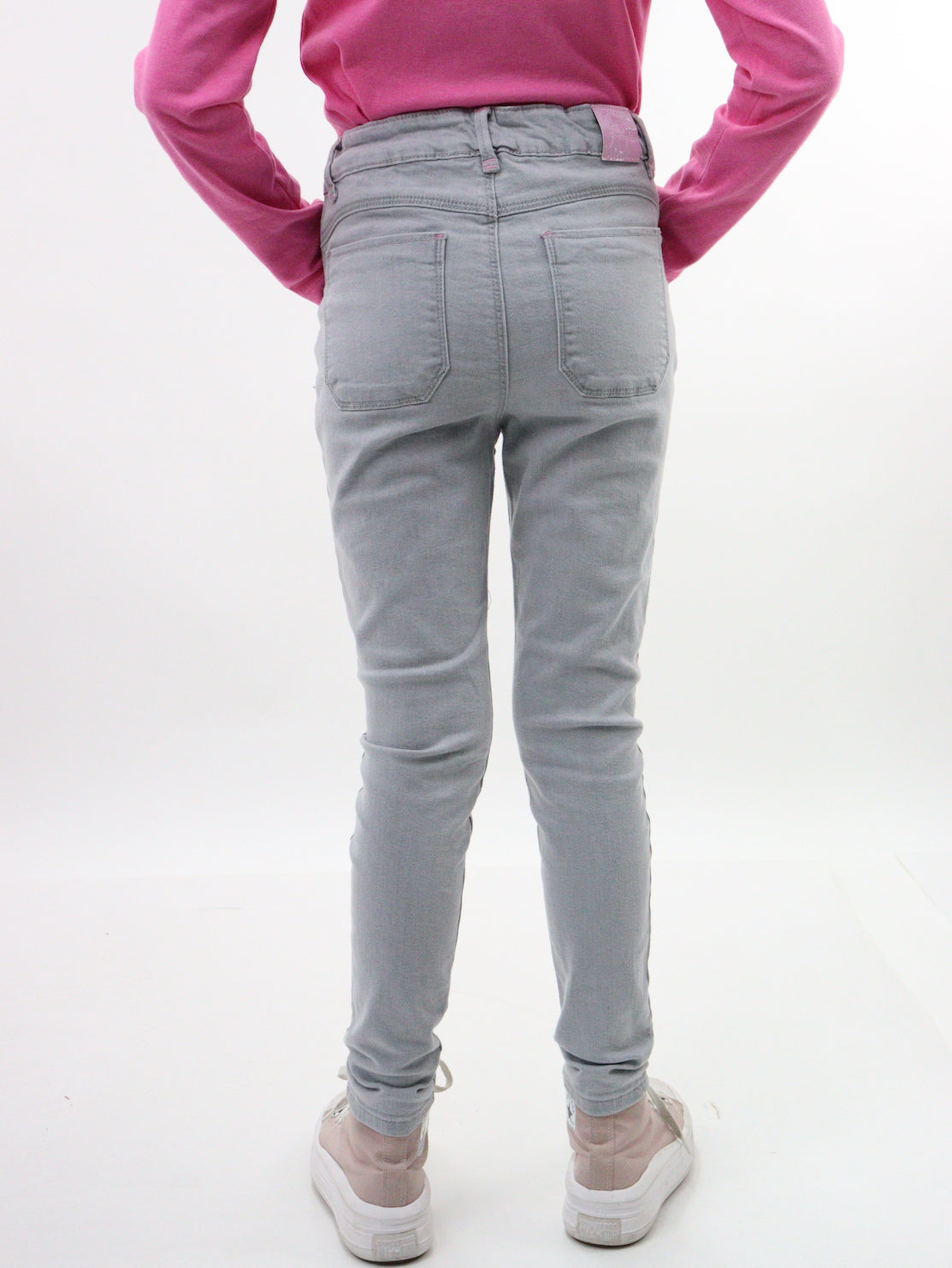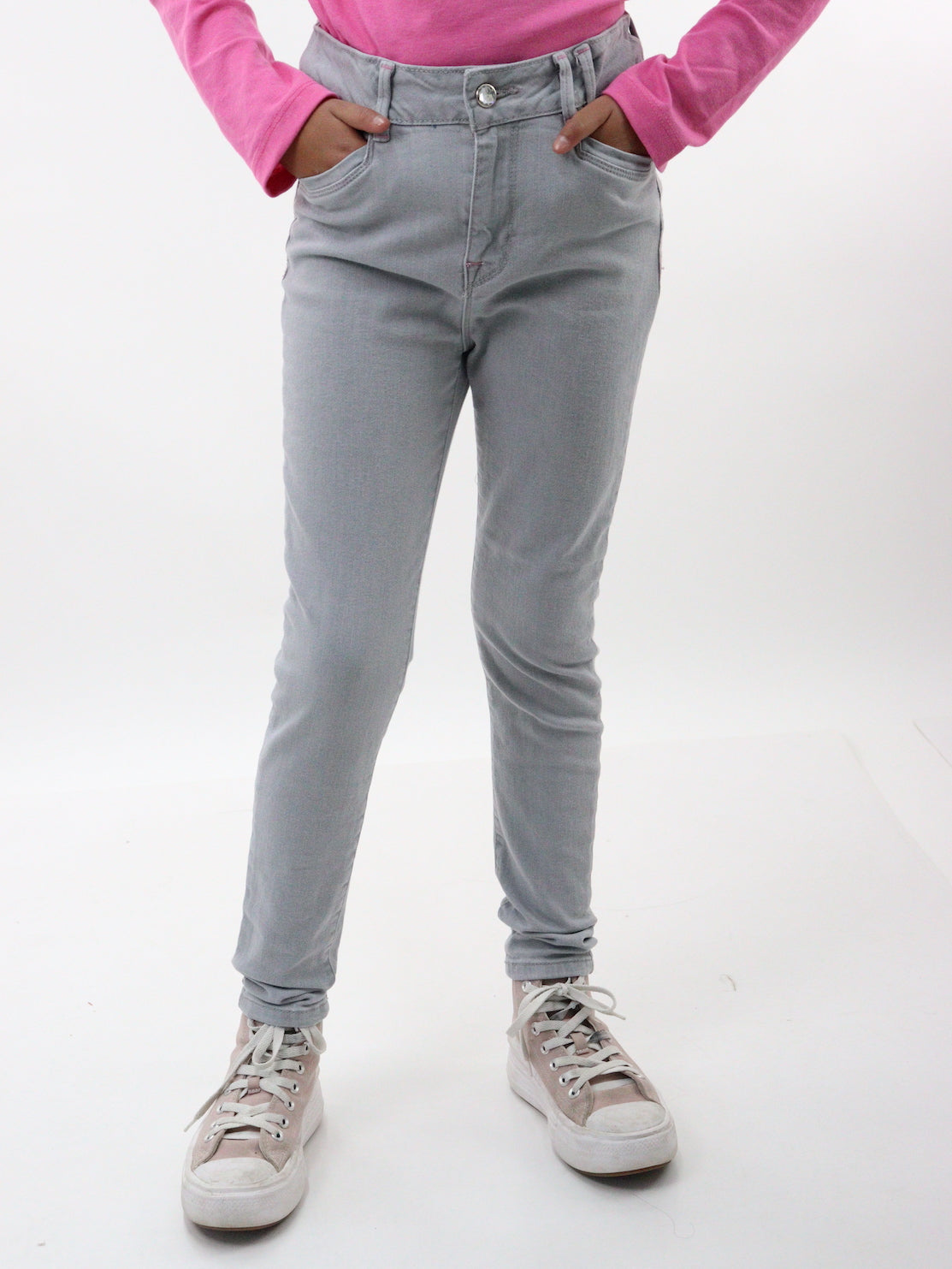 Jeans skinny de mezclilla stretch color gris, con bolsas delanteras/traseras. Cierre de botón y cremallera.