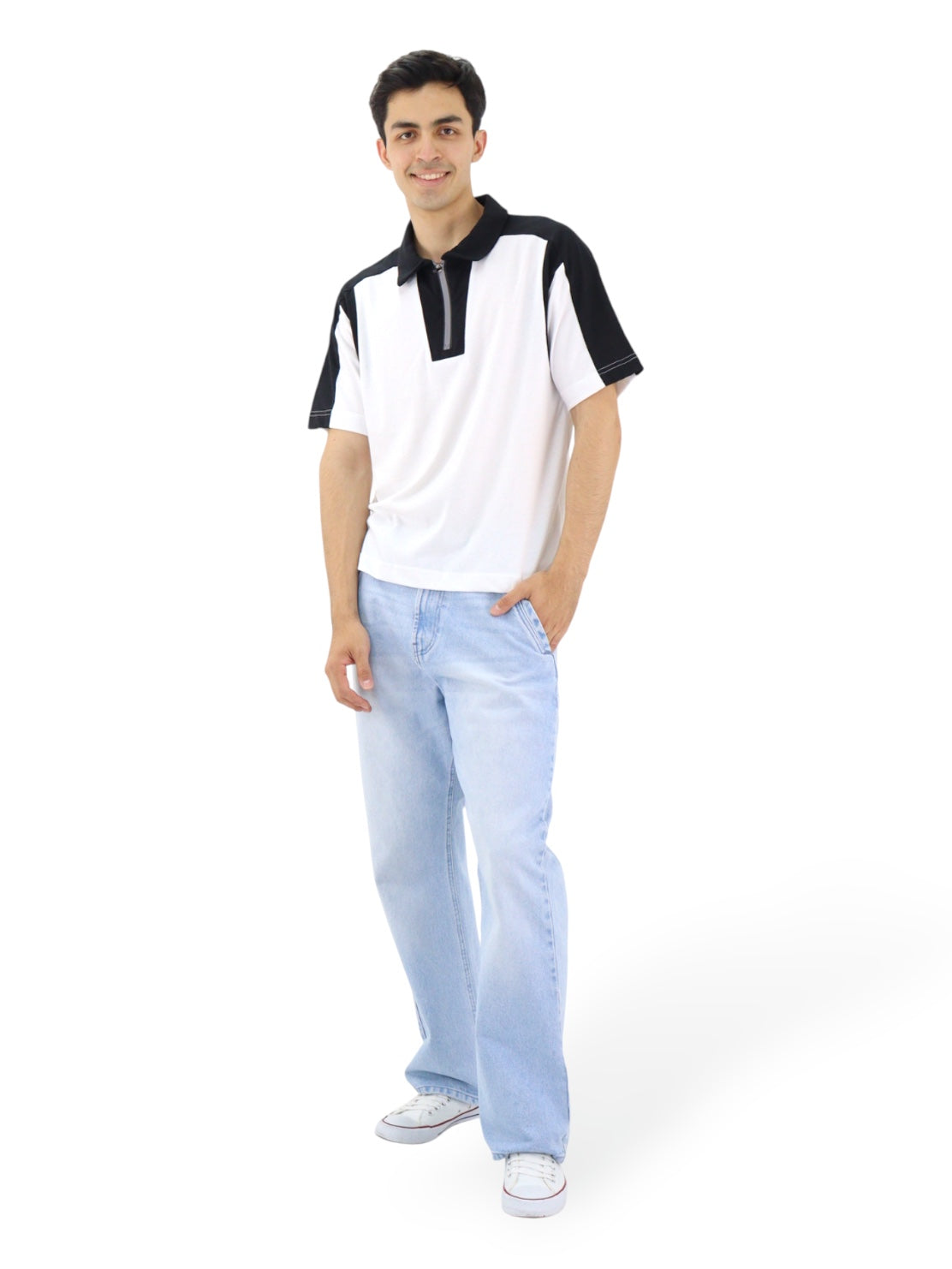 Jeans loose, lavado azul claro, ligeramente ensuciado, aspecto sucio, con cierre de botón y cremallera.