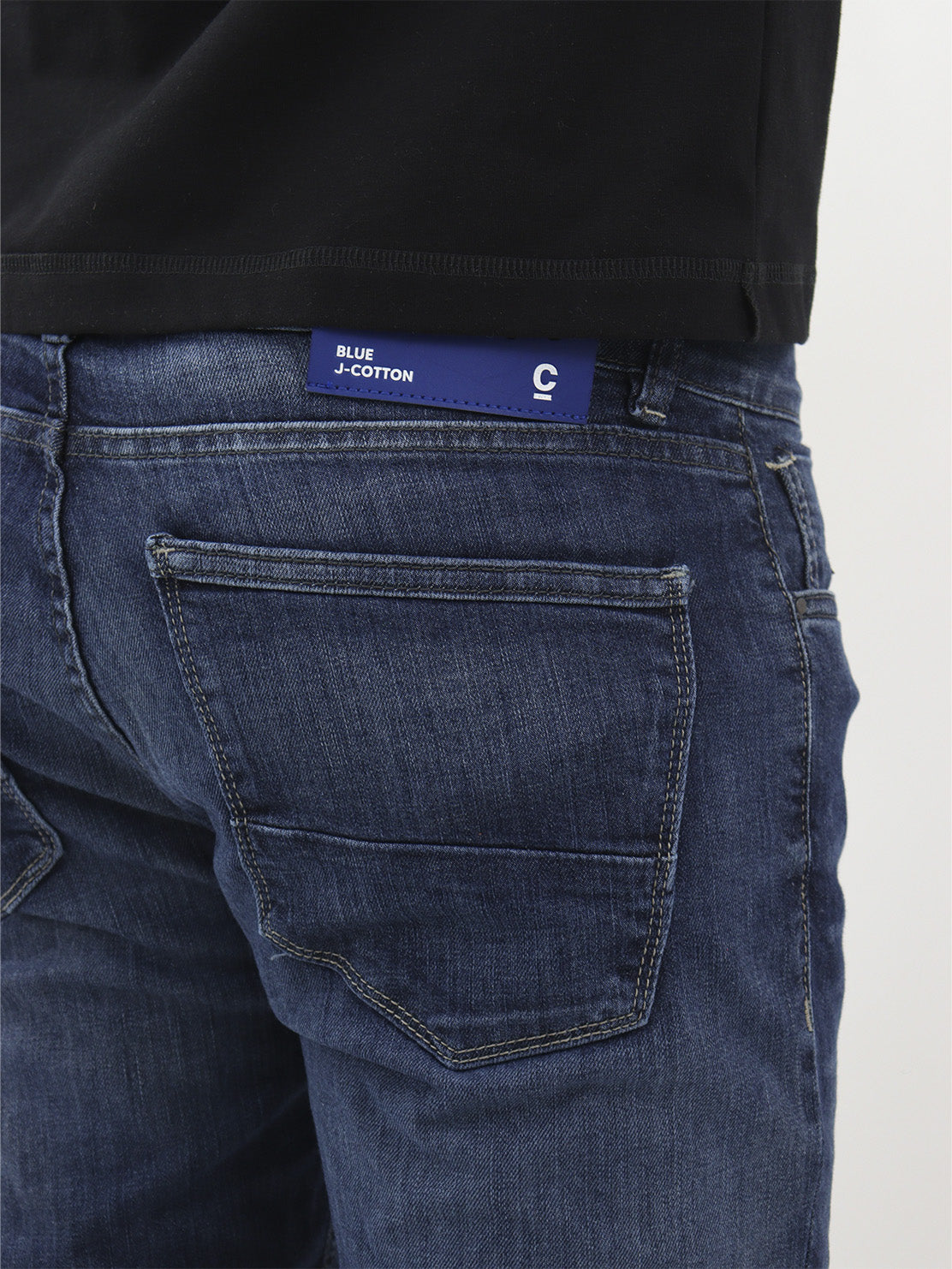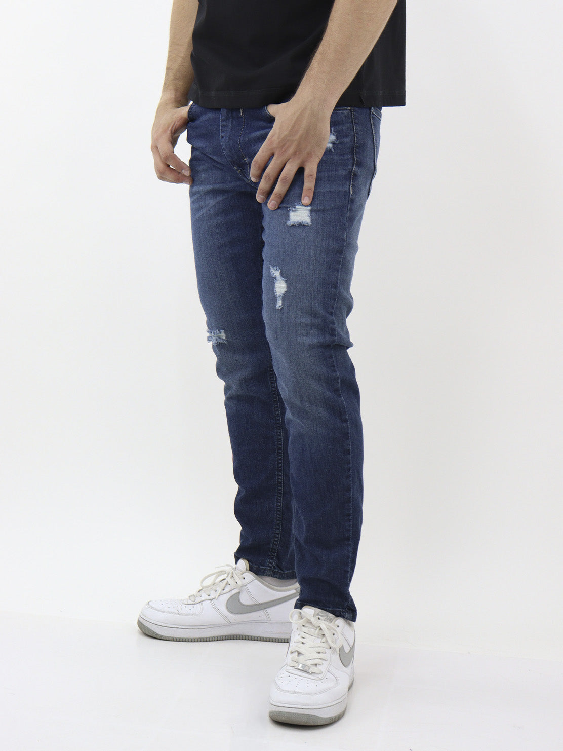 Jeans vaquero 5 bolsillos ajustado y elástico en fit skinny. Detalle de chapita en bolsillos cerillero. Lavado oscuro ligeramente ensuciado, aspecto usado, con arrugas en el frontal y destrucciones. Cierre bragueta con cremallera.
