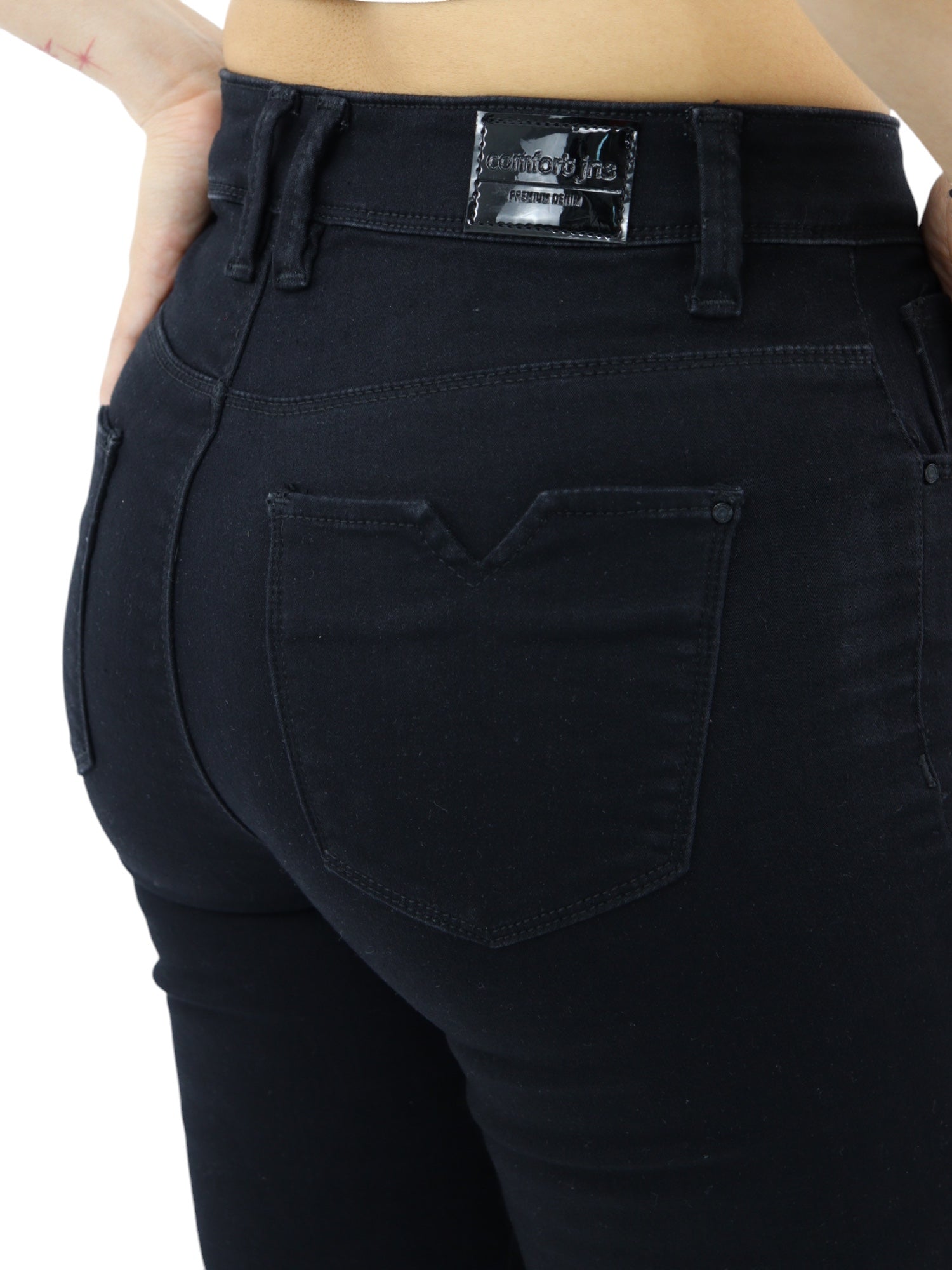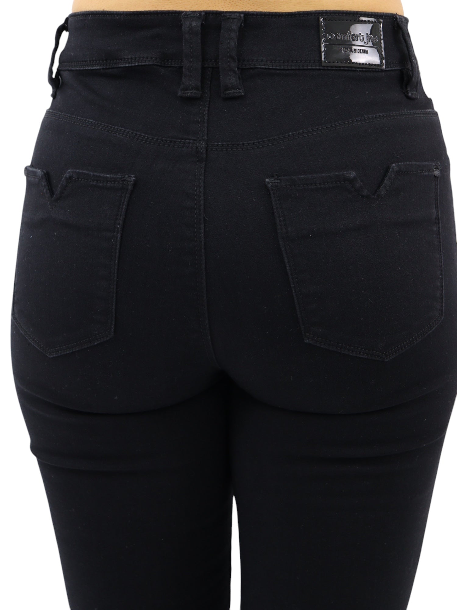 Jeans skinny tiro alto de talle alto, con bolsillos en la parte delantera y trasera, cierre de botón y cremallera, pierna ajustada. Lavado negro