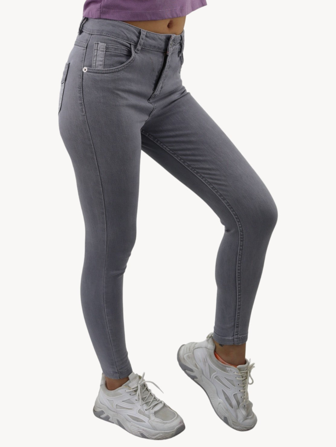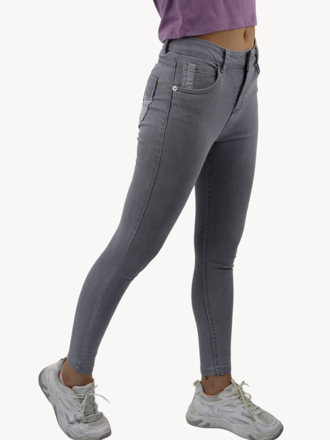 Jeans skinny tiro alto de mezclilla stretch color gris con bolsillos en forma de estrella, con bolsas delanteras/traseras. Cierre de botón y cremallera.