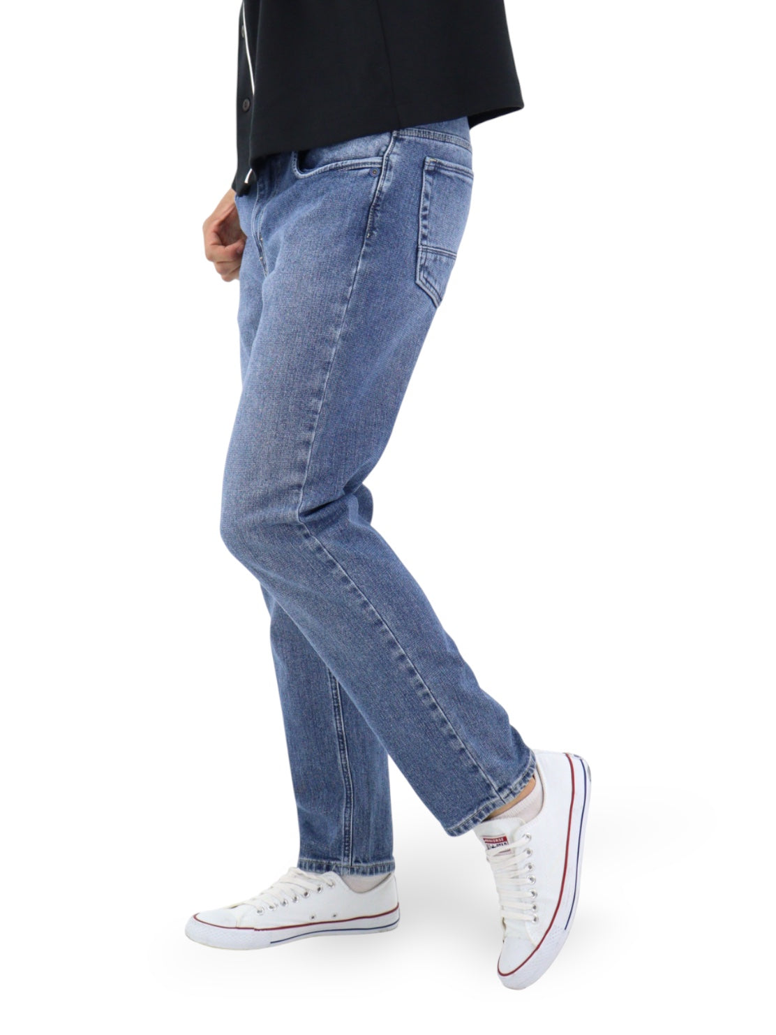 Jeans slim de talle alto, con bolsillos en la parte delantera y trasera, cierre de botón y cremallera, pierna ajustada. Lavado azul medio, aspecto sucio, ligeramente ensuciado