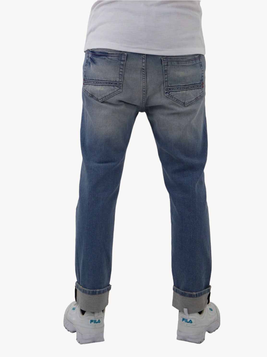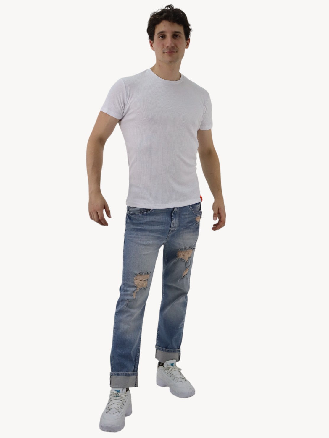 Jeans slim de color azul deslavado con destrucción, con bolsas delanteras/traseras. Cierre de botón y cremallera