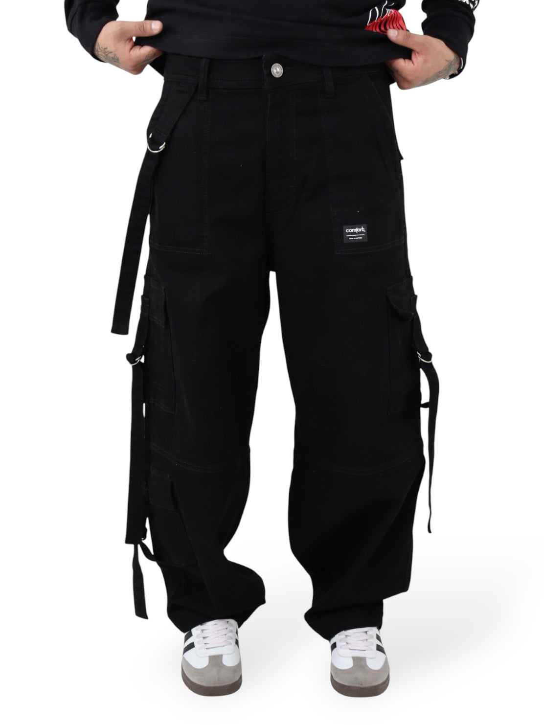 Jeans super baggy de talle alto, lavado negro, con bolsillos en la parte delantera, trasera, laterales, con pierna recta.