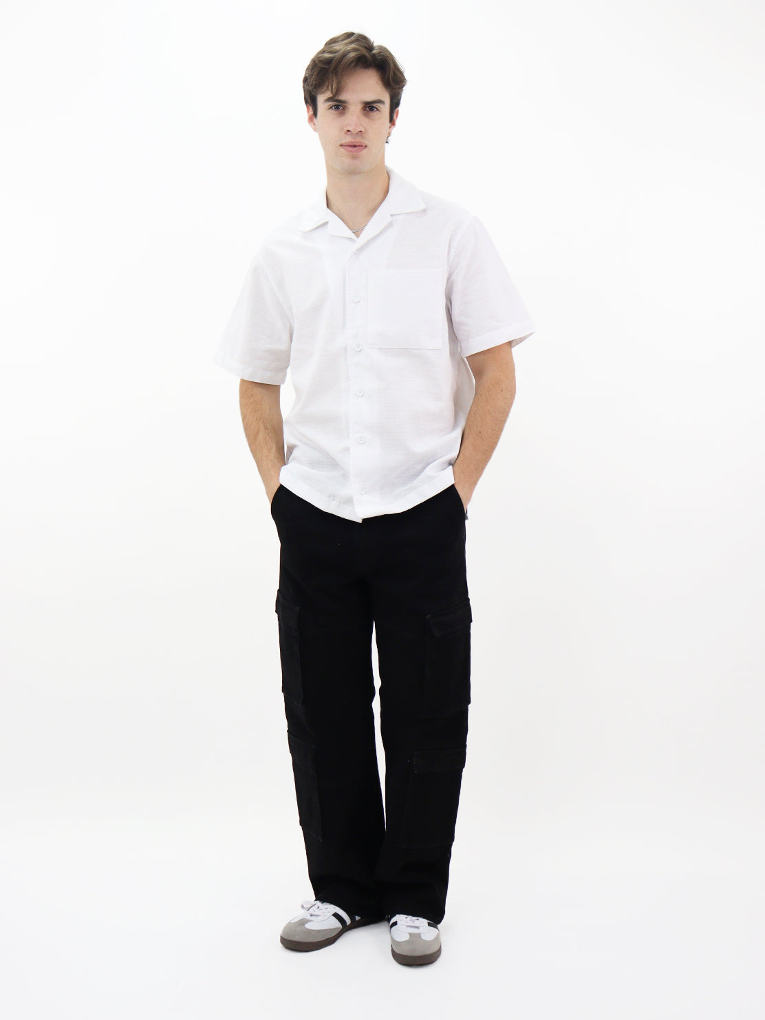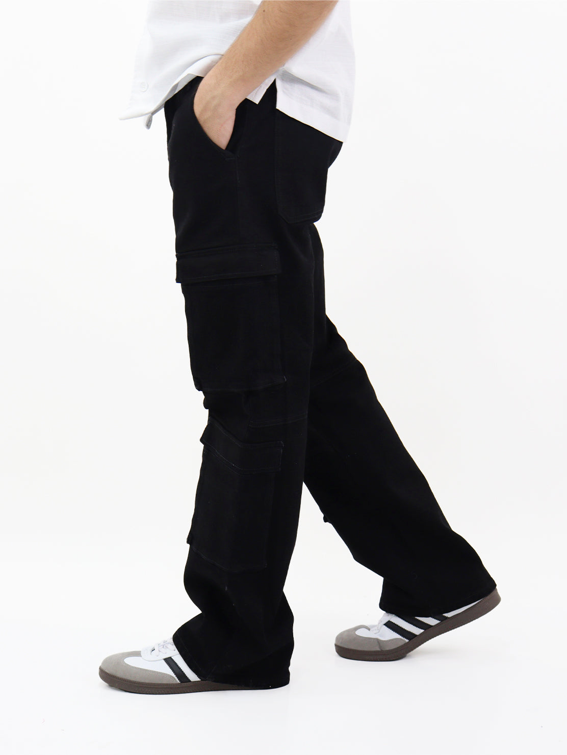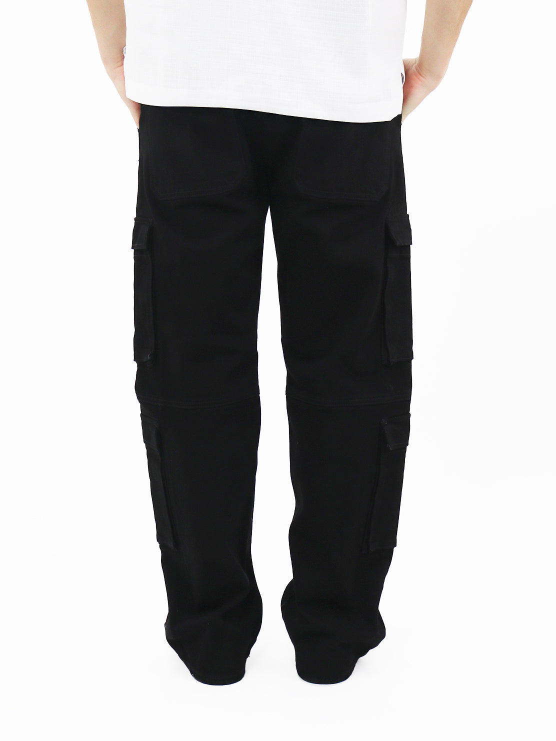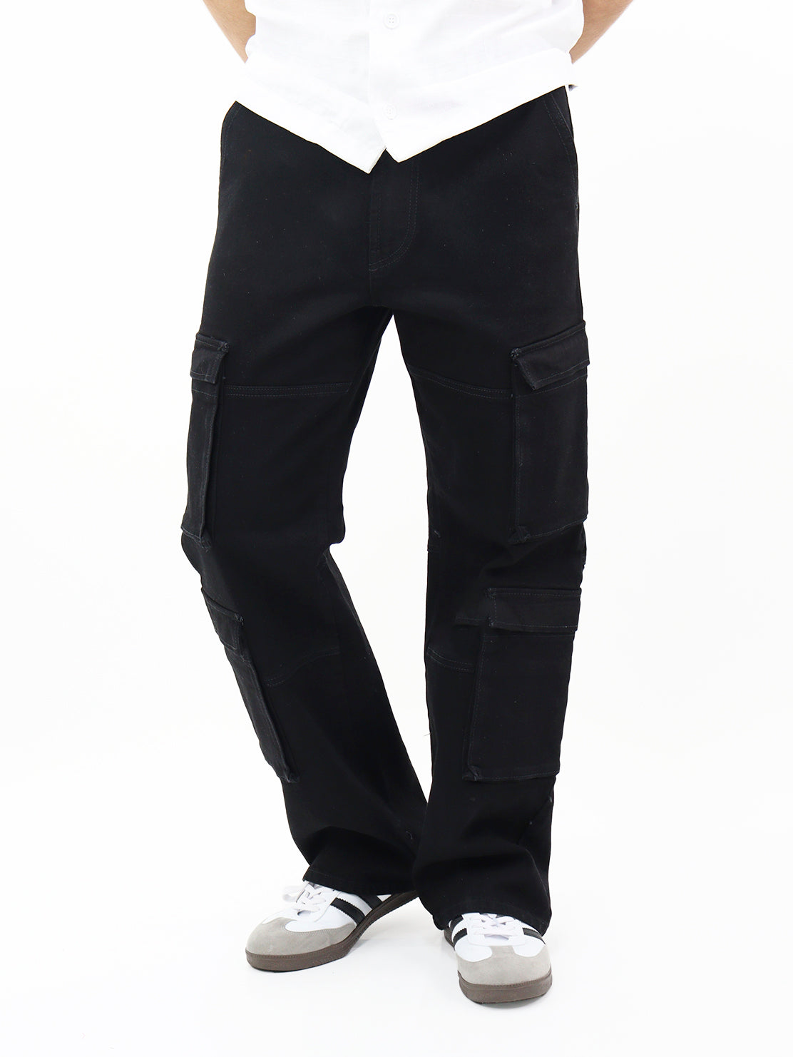 Jeans wide leg cargo de talle alto negro, con bolsillos en la parte delantera y trasera, cierre de botón y cremallera y pierna recta.