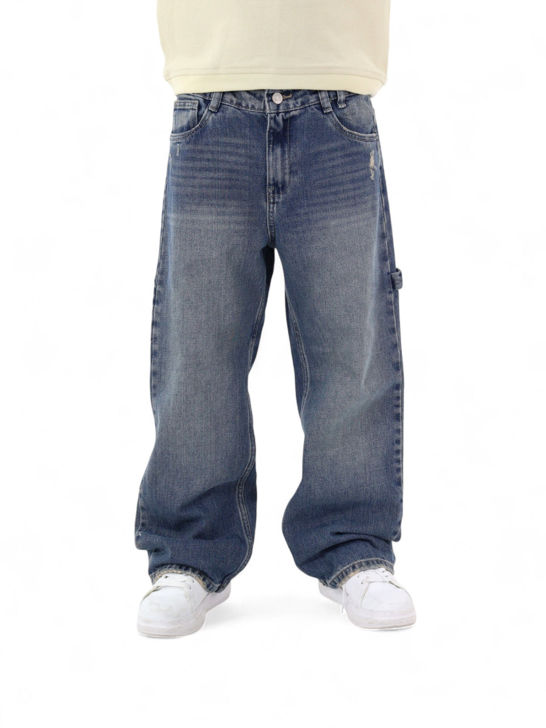 Jeans wide leg carpintero, ligeramente ensuciado, aspecto sucio, con bolsillos en la parte delantera y trasera, cierre de botón y cremallera y pierna recta. Lavado azul con tinta