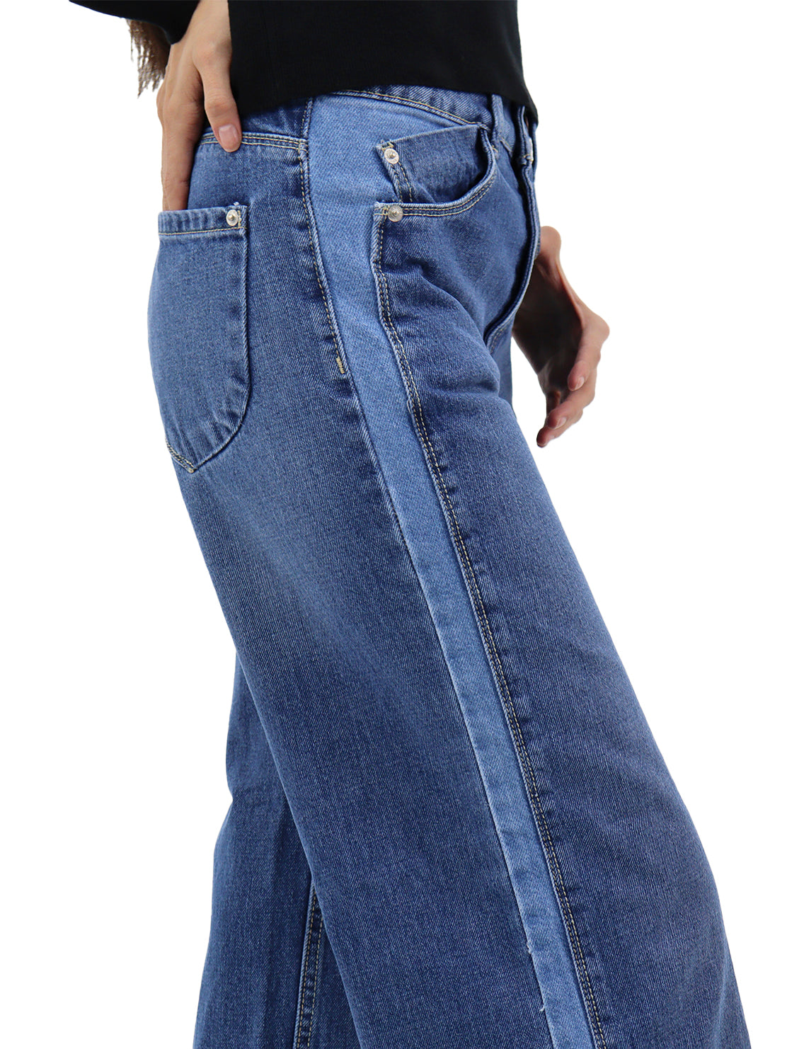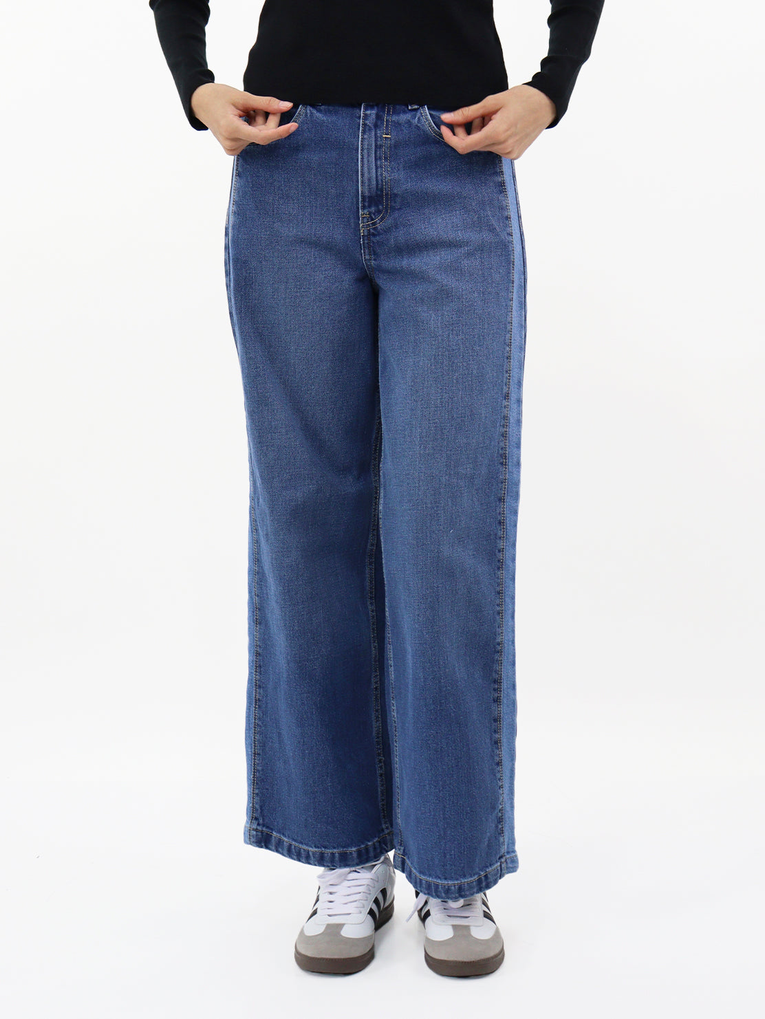 Jeans wide de talle alto, lavado azul medio, con bolsillos en la parte delantera y trasera, cierre de botón y cremallera y pierna recta.