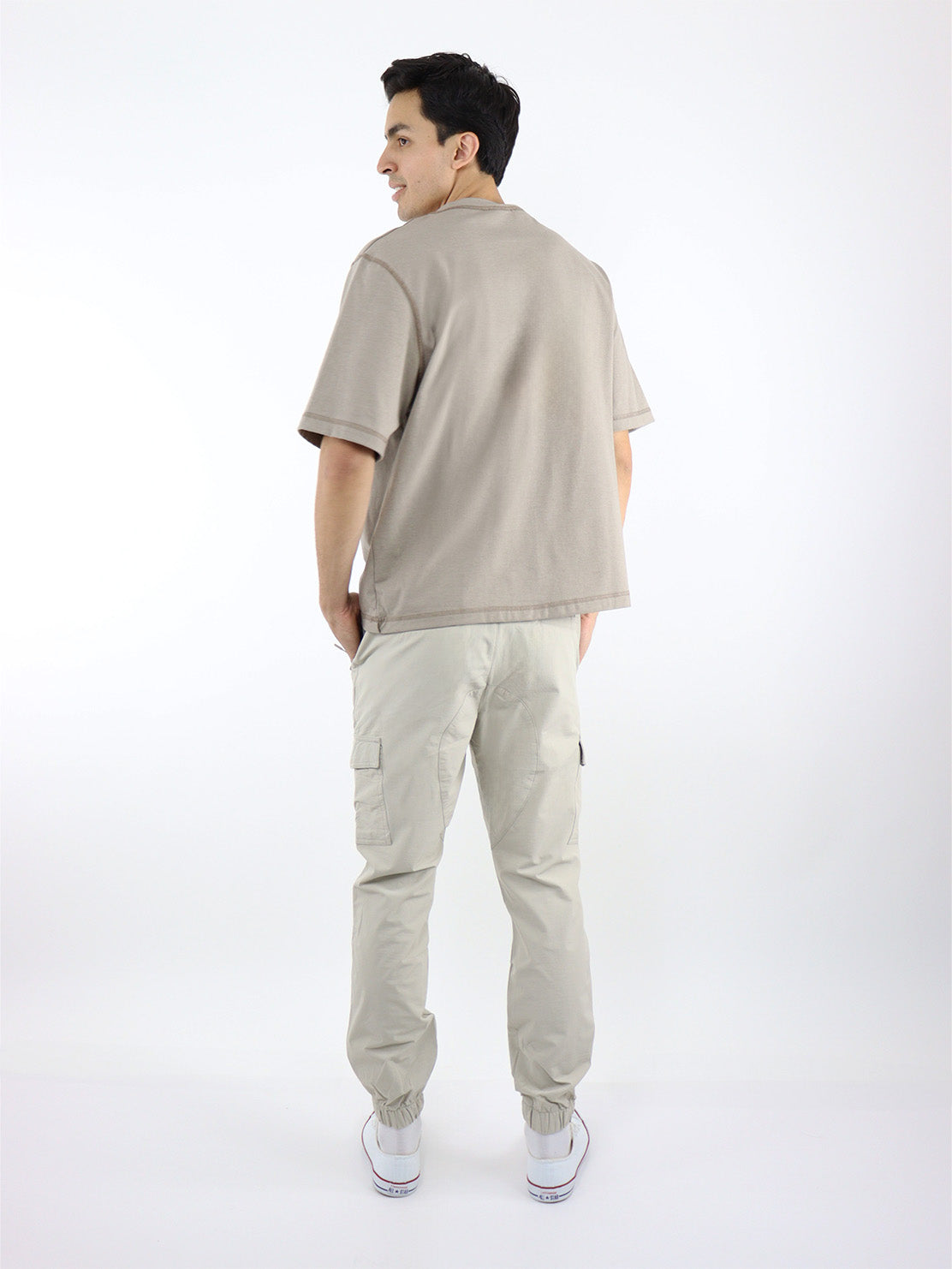 Jogger cargo color arena, con cinturilla elástica y cordón para ajustar. Detalle de bolsillos en la espalda.