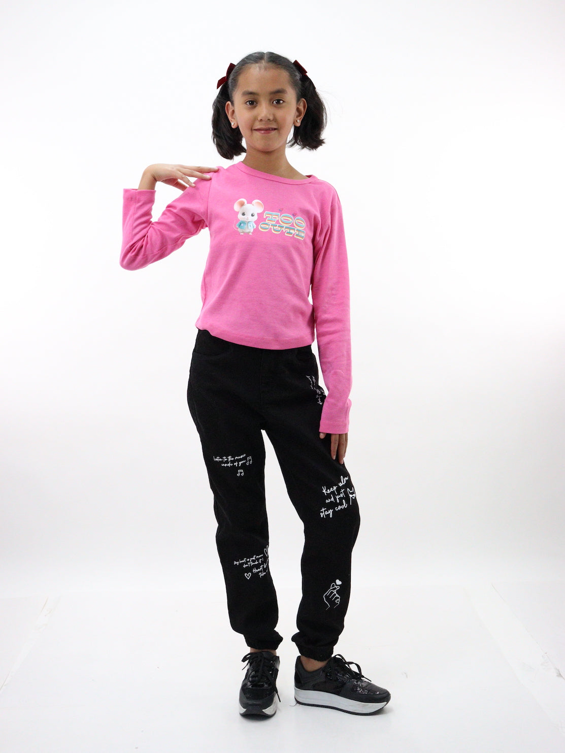 Jogger denim de color negro con estampado, con bolsas delanteras/traseras. Cierre de botón y cremallera