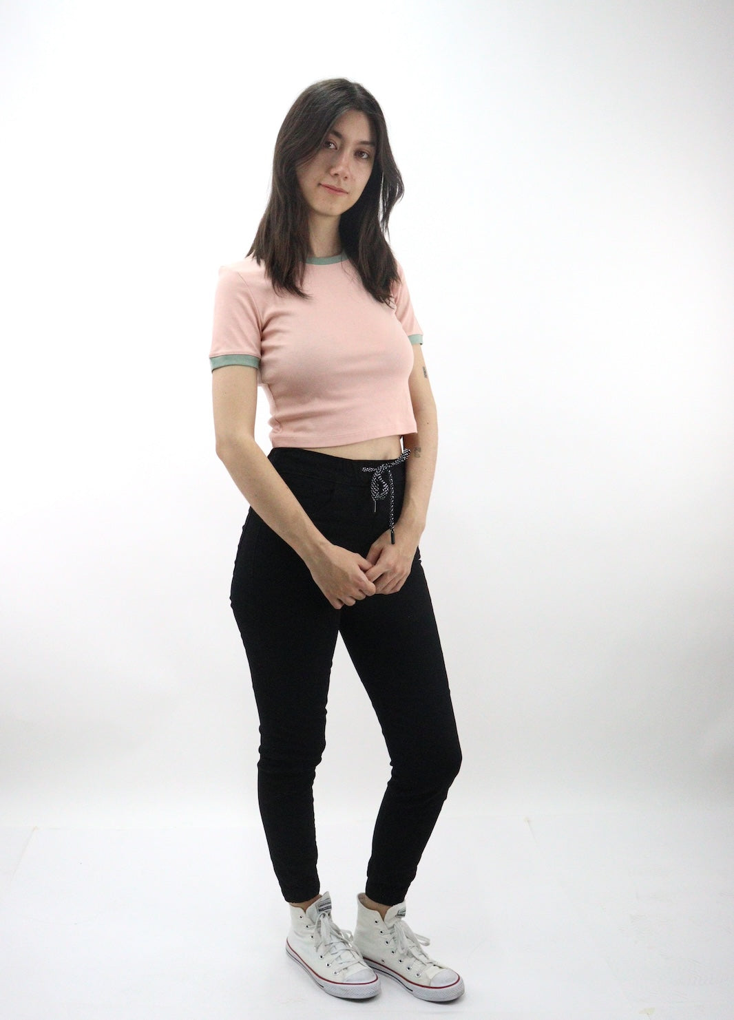Jogger con resorte elástico de color negro, con bolsas delanteras/traseras. Cierre de botón y cremallera.