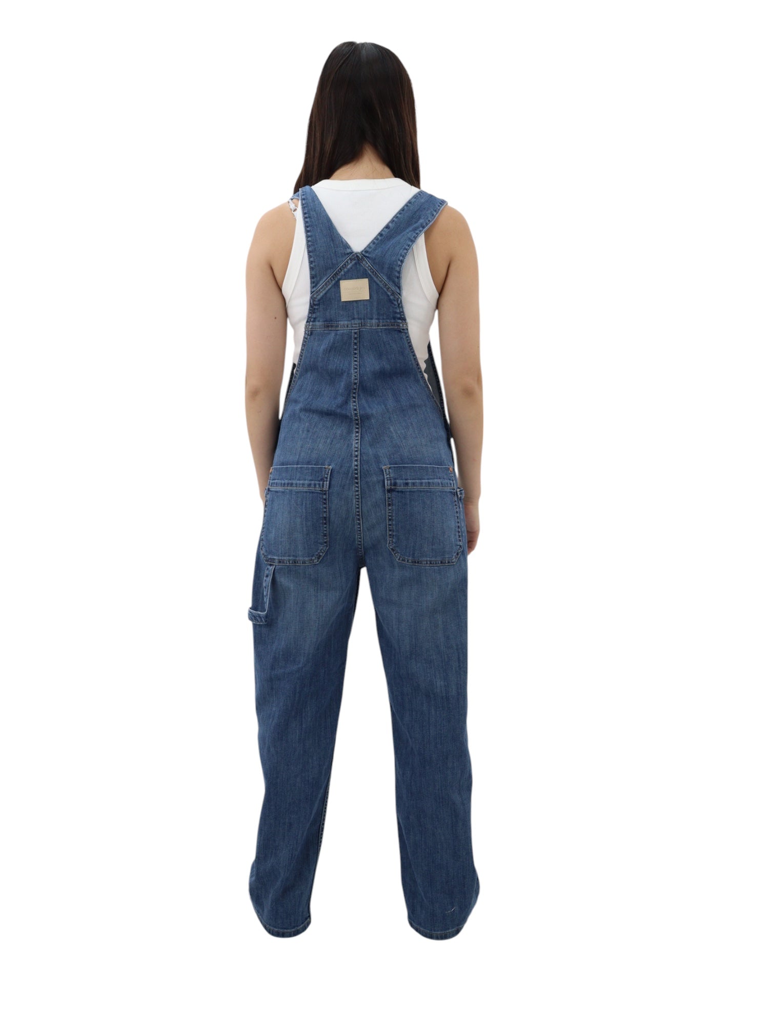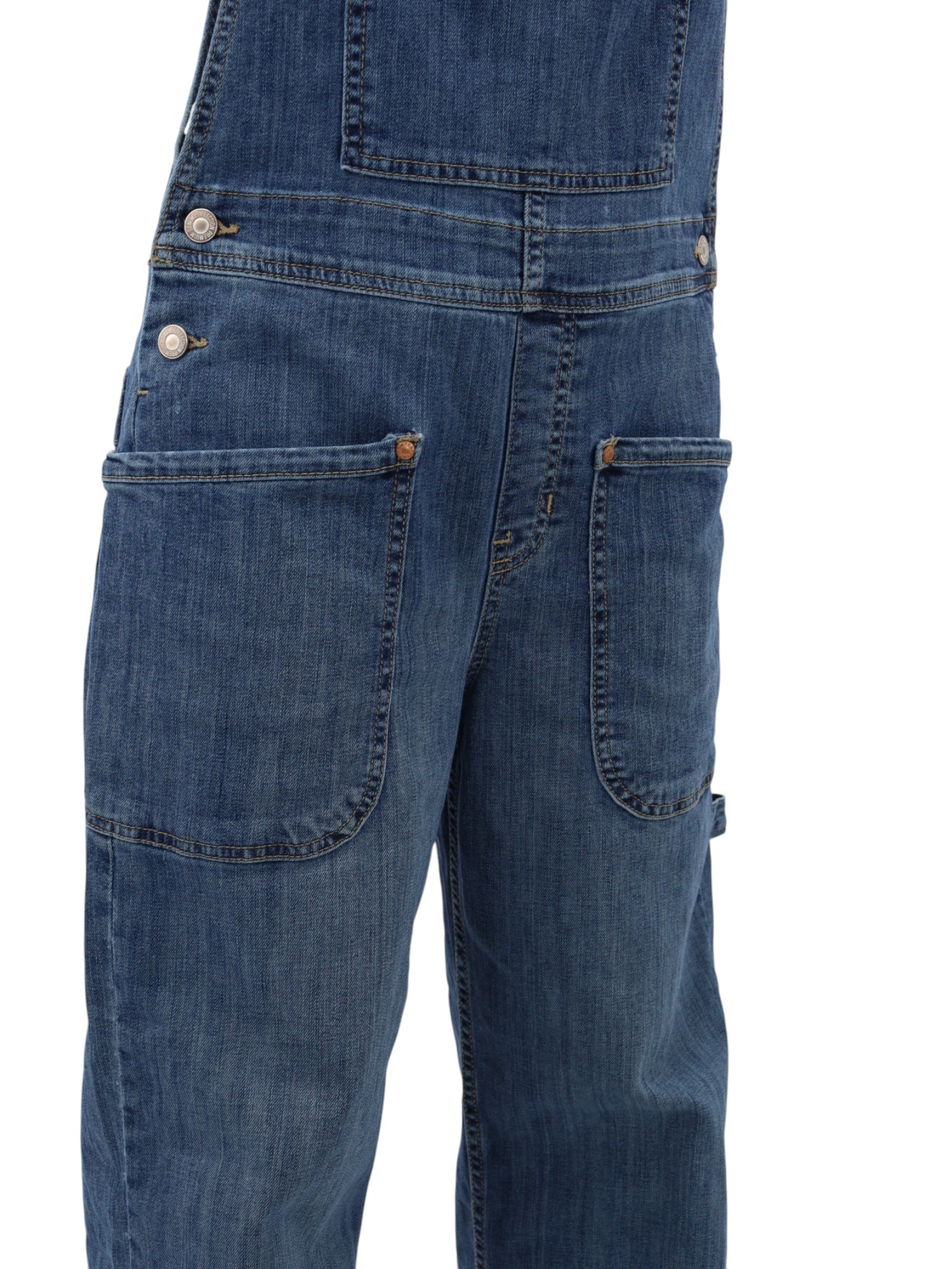 Overol baggy de mezclilla, lavado azul oscuro, ligeramente ensuciado, aspecto sucio con cierre de botón