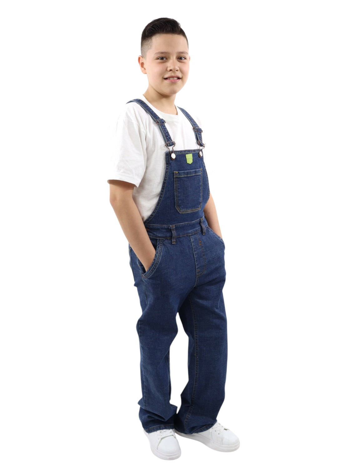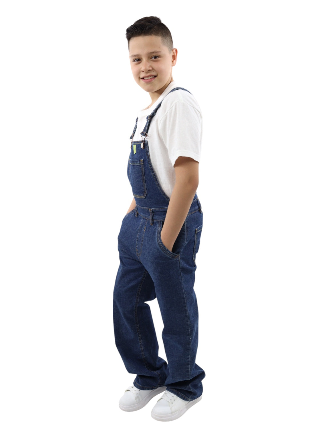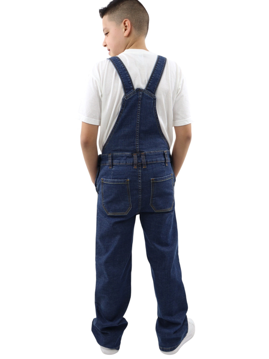 Overol baggy de mezclilla, lavado azul oscuro, ligeramente ensuciado, aspecto sucio con cierre de botón