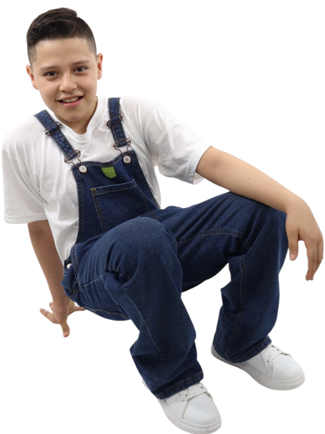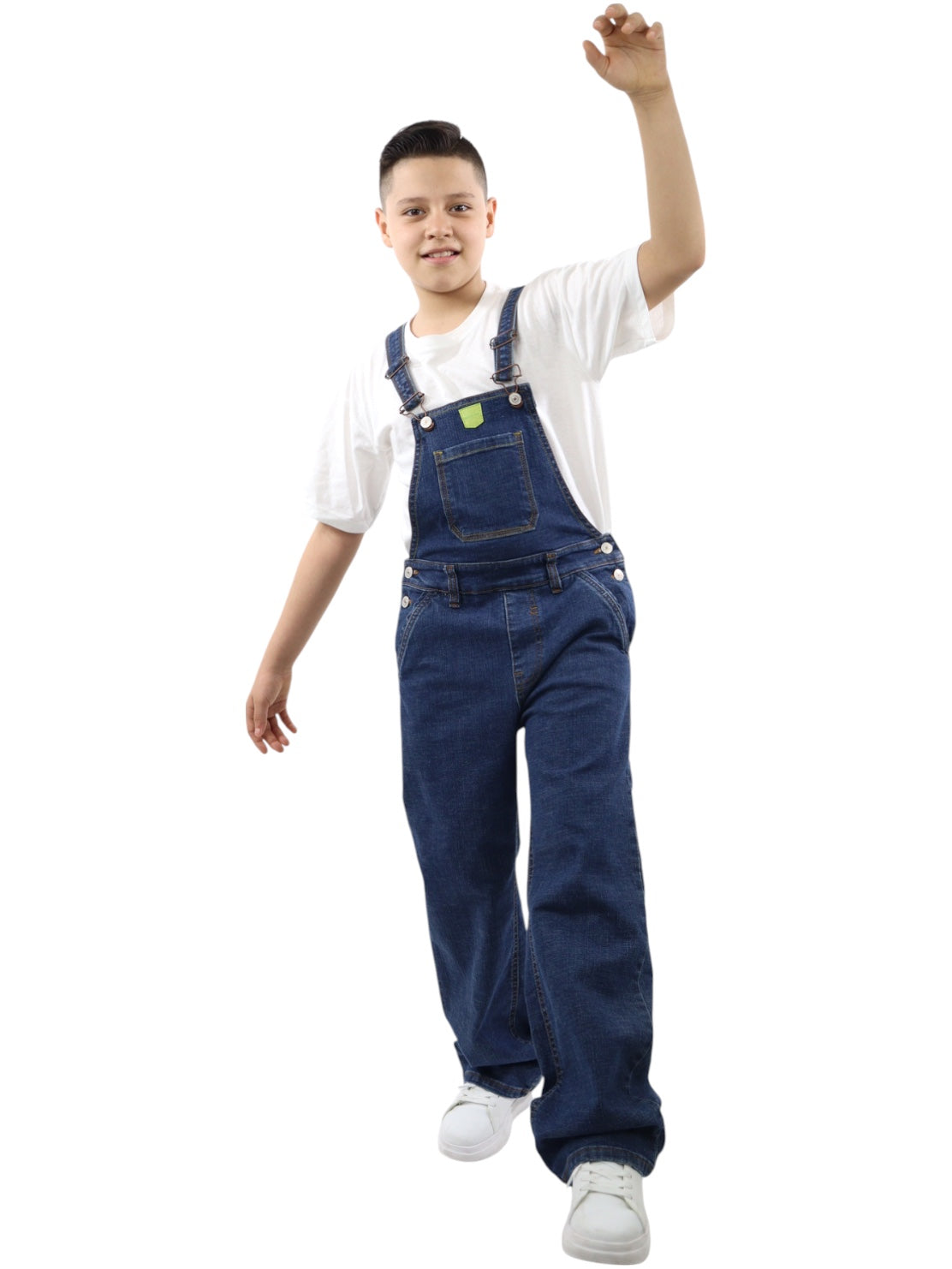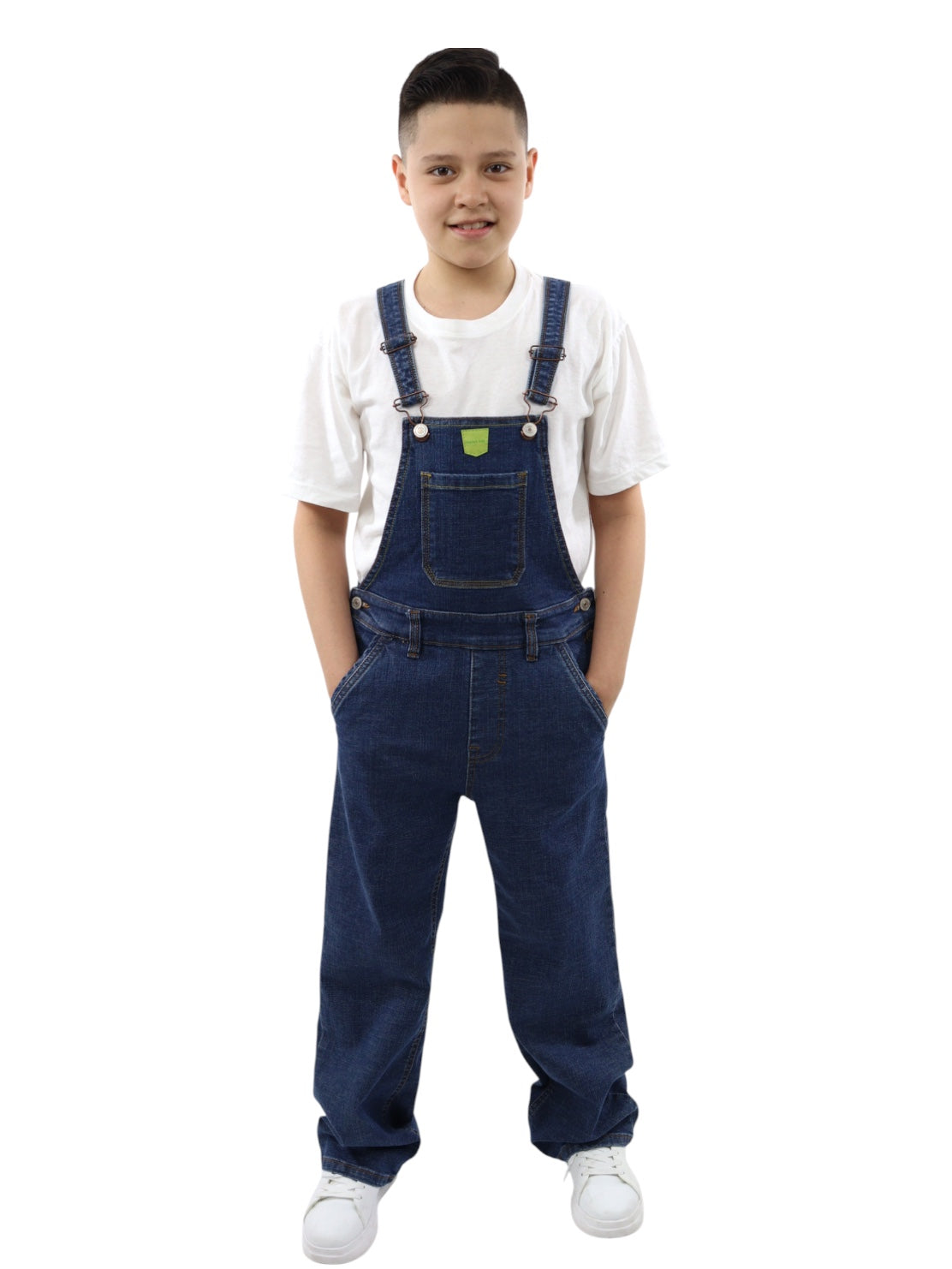Overol baggy de mezclilla, lavado azul oscuro, ligeramente ensuciado, aspecto sucio con cierre de botón