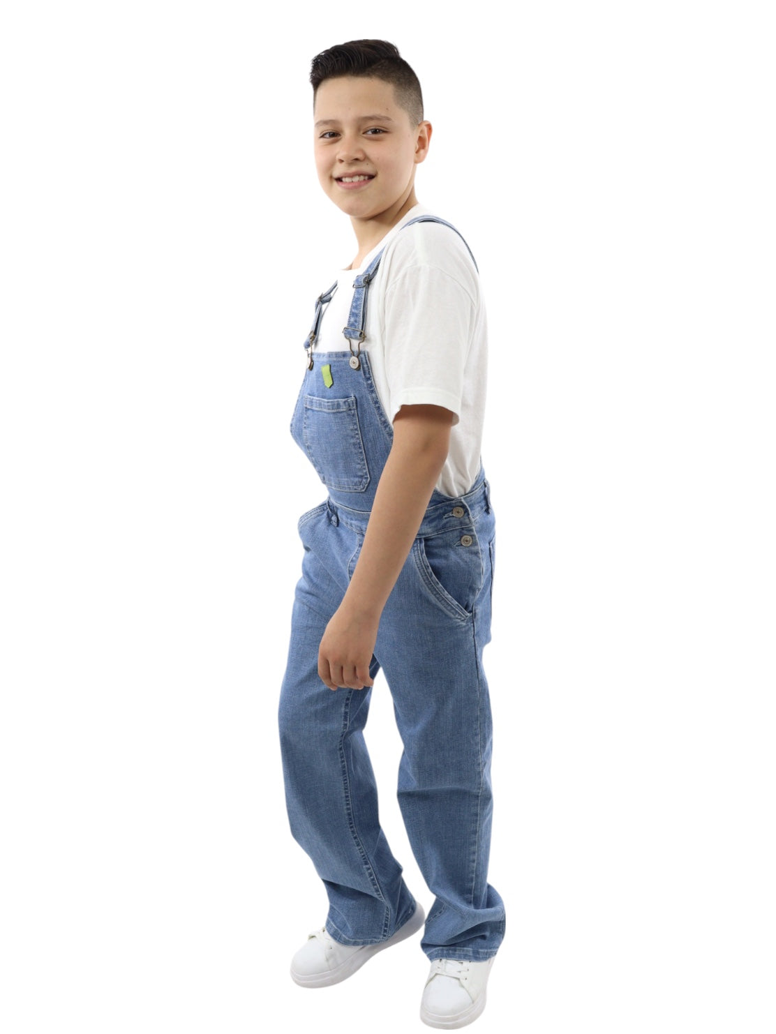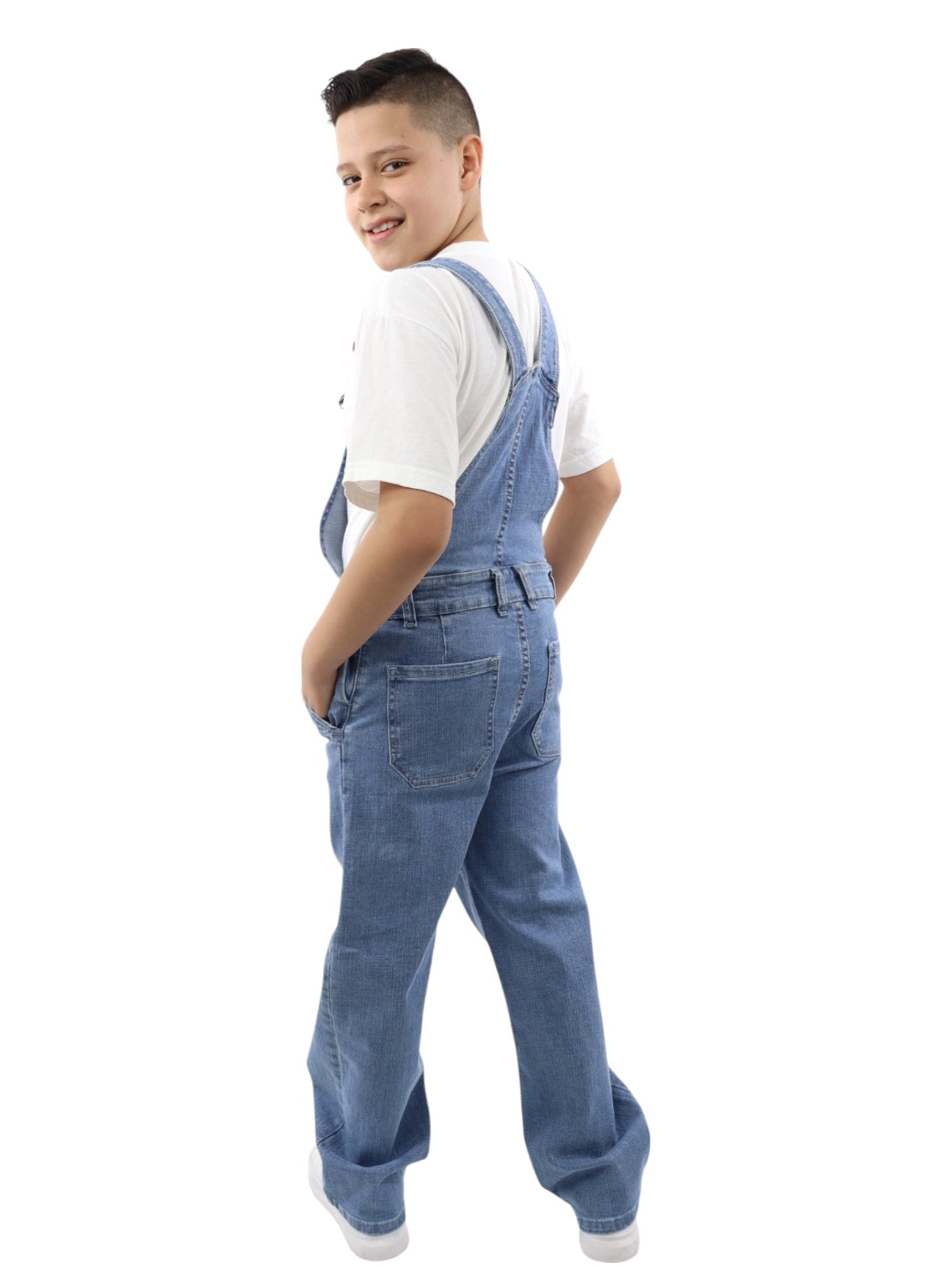 Overol baggy de mezclilla, lavado azul claro, ligeramente ensuciado, aspecto sucio con cierre de botón