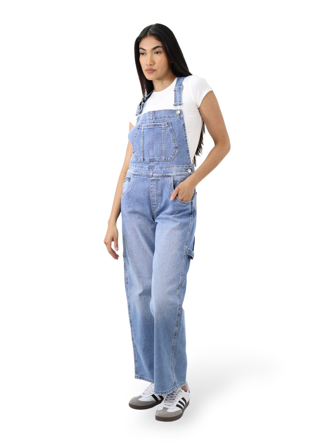 Overol baggy, lavado azul medio, ligeramente ensuciado, aspecto sucio