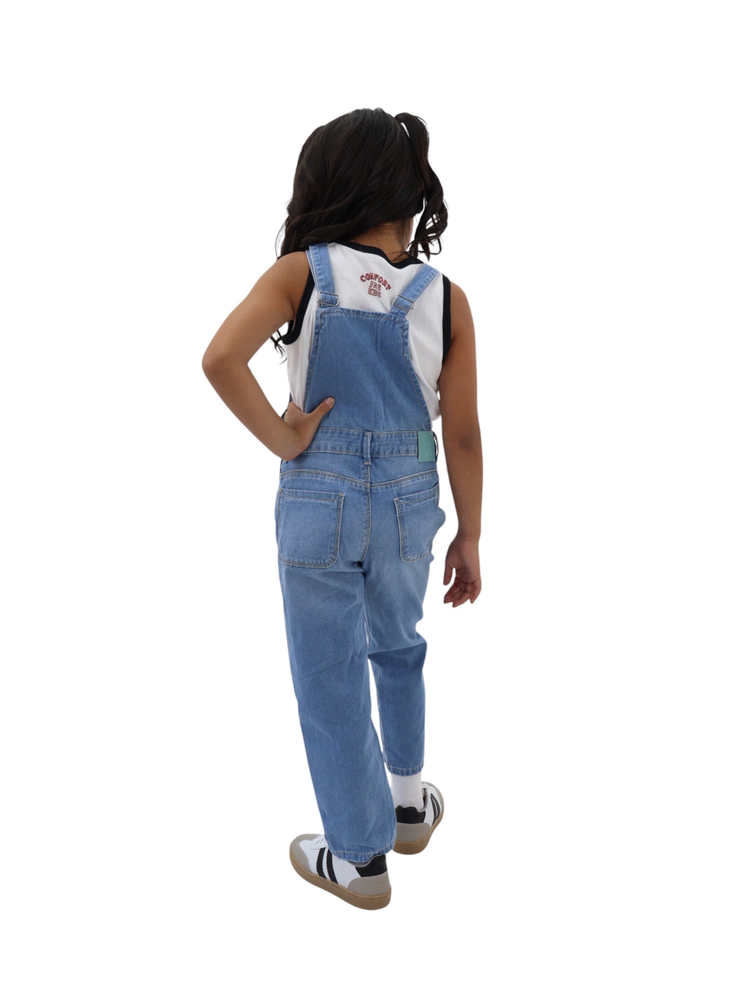 Overol de mezclilla con tirantes ajustables, moño decorativo en bolsa.