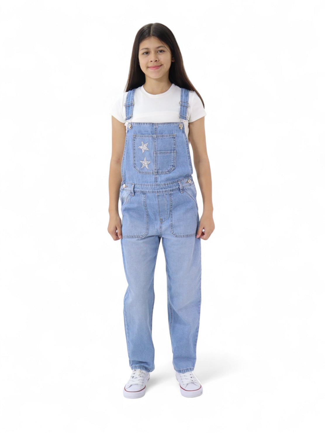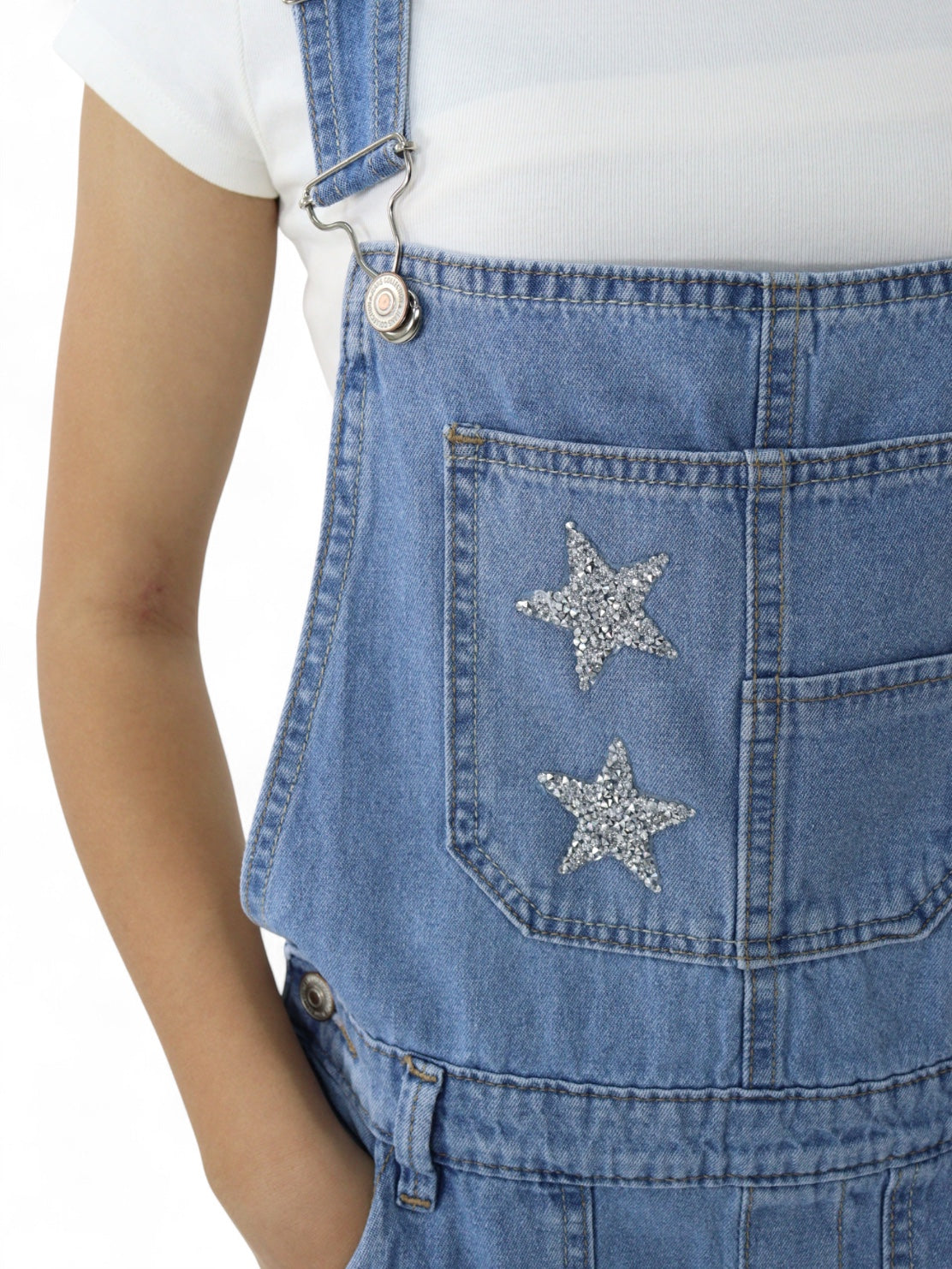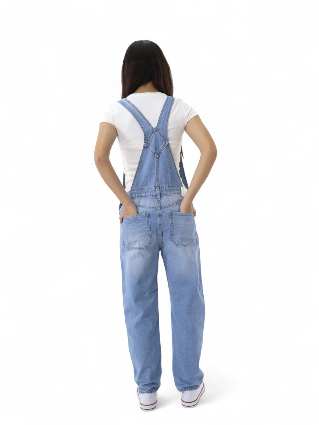 Overol mom, lavado azul medio, ligeramente ensuciado, aspecto sucio