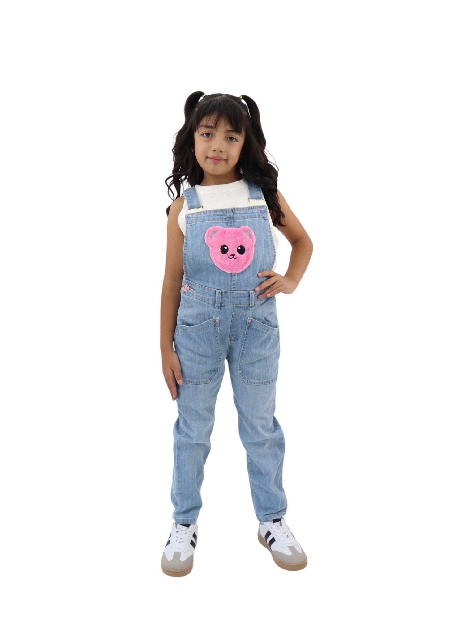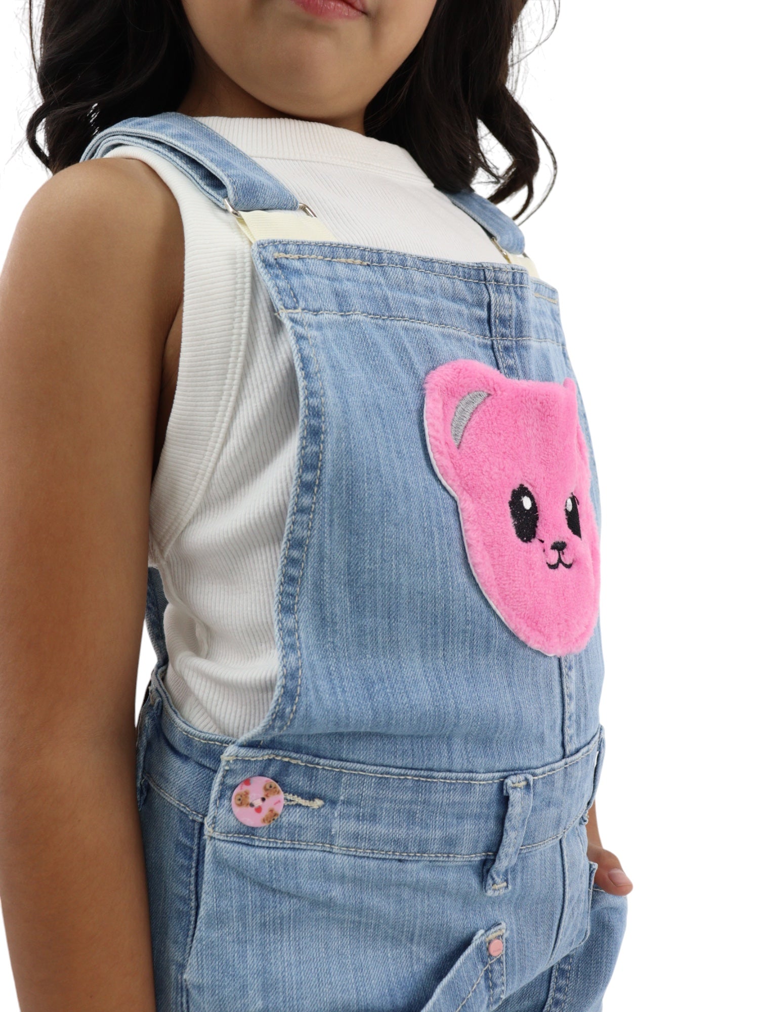 Overol de mezclilla con tirantes ajustables, lavado claro ligeramente ensuciado, aspecto usado, bolsas delanteras, traseras y cierre de botón.