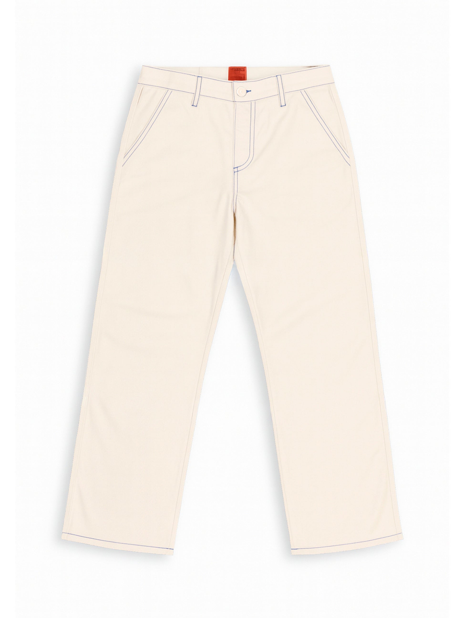 Pantalón baggy de gabardina, tono beige claro, con cierre de botón y cremallera.
