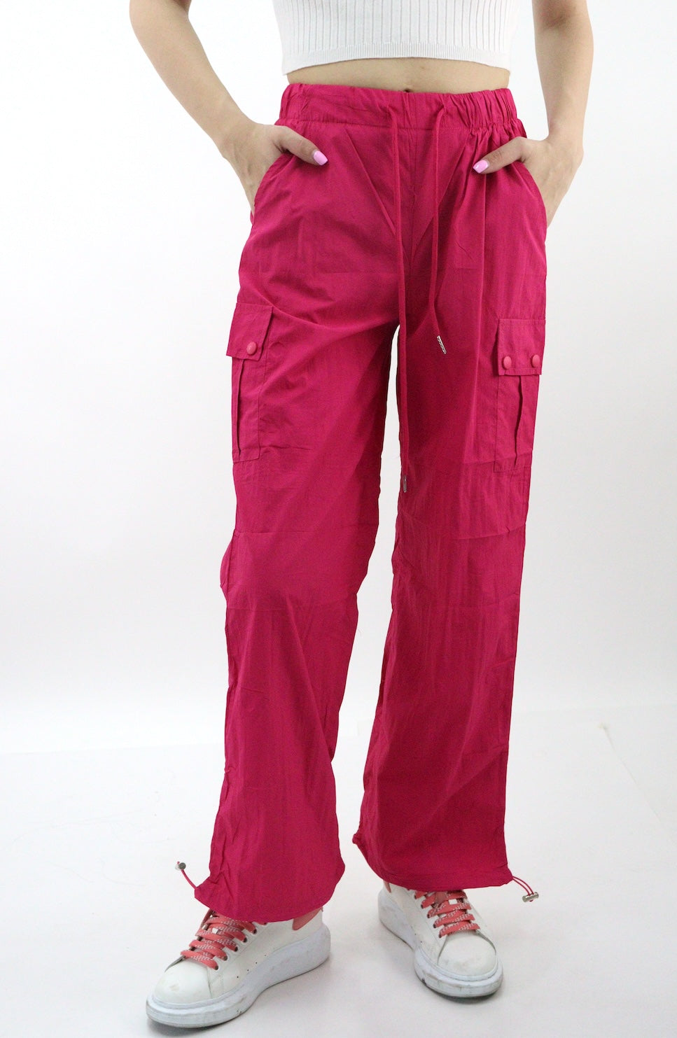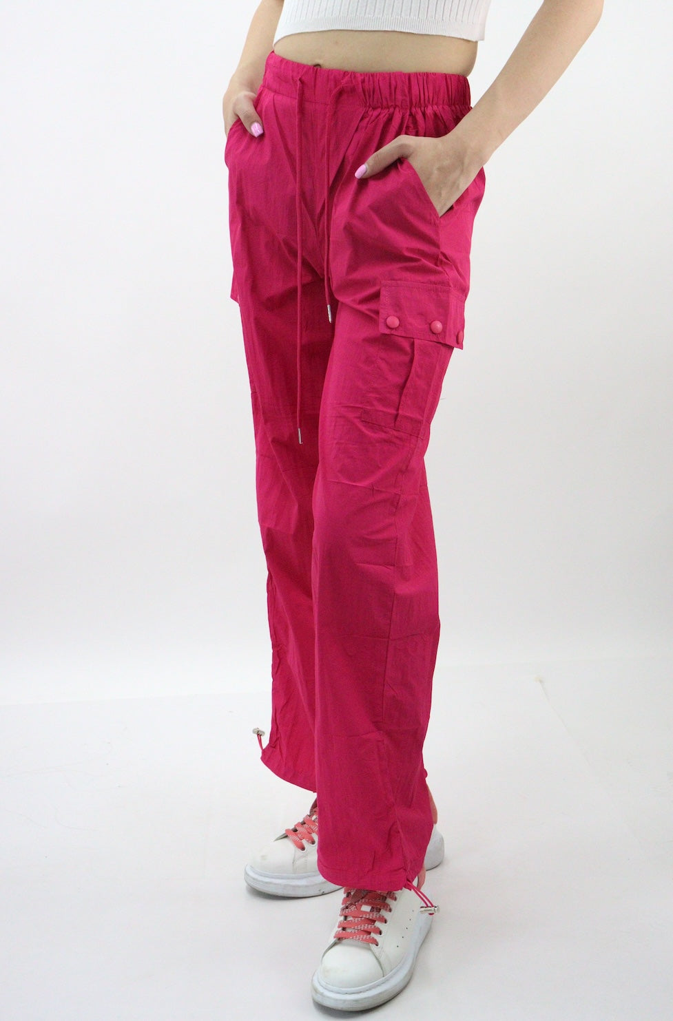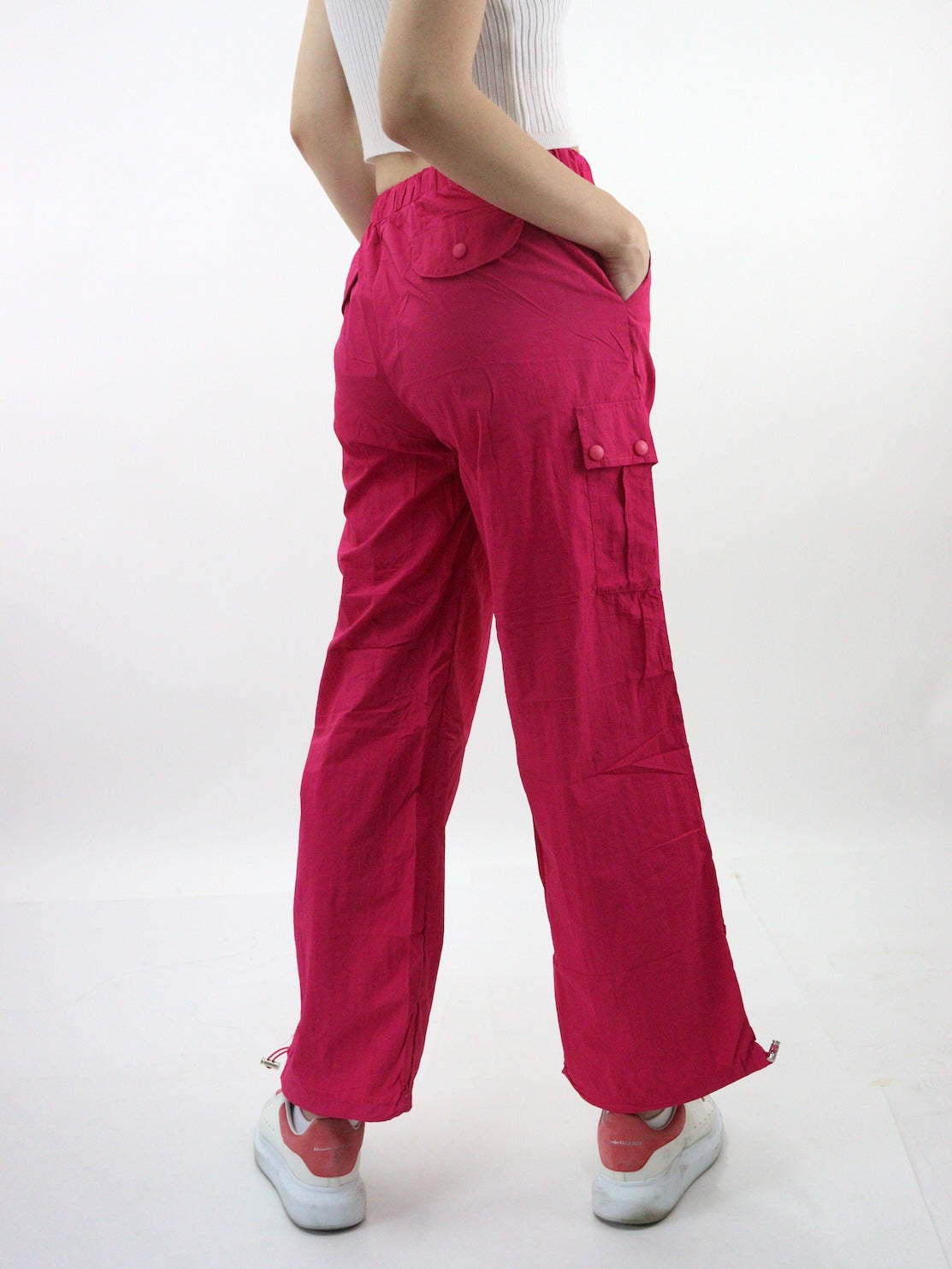 Pantalón cargo parachute de color fucsia con resorte elástico y jareta ajustadora
