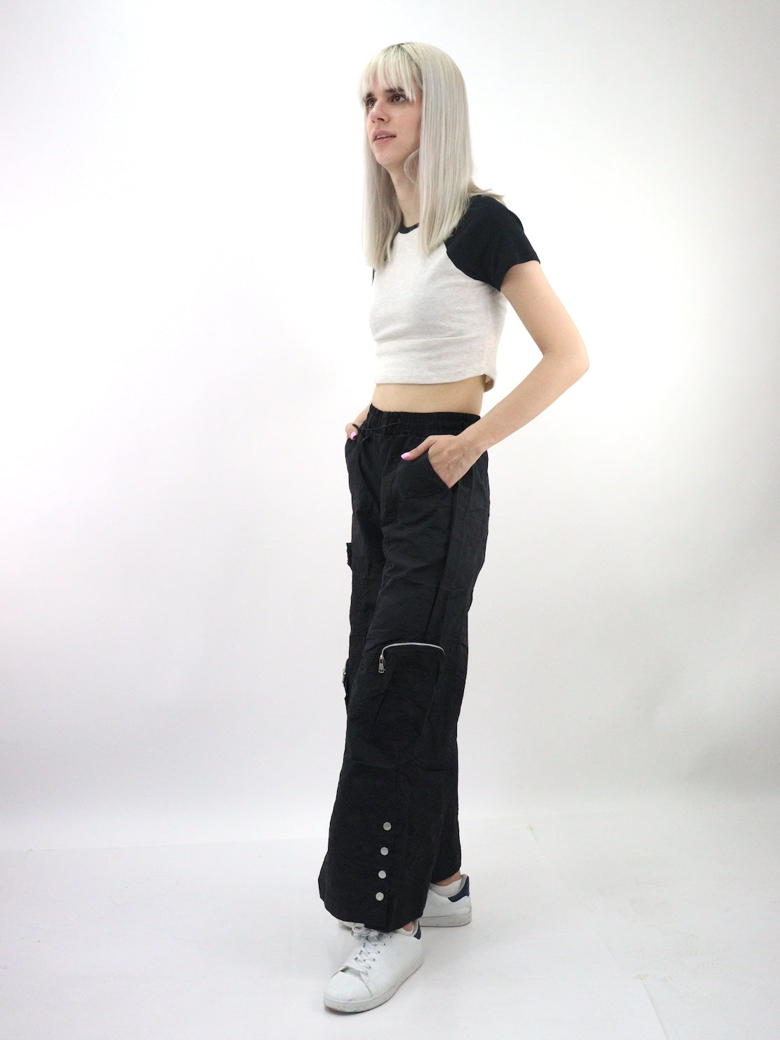 Pantalón cargo parachute color negro con broches y resorte elástico en cintura