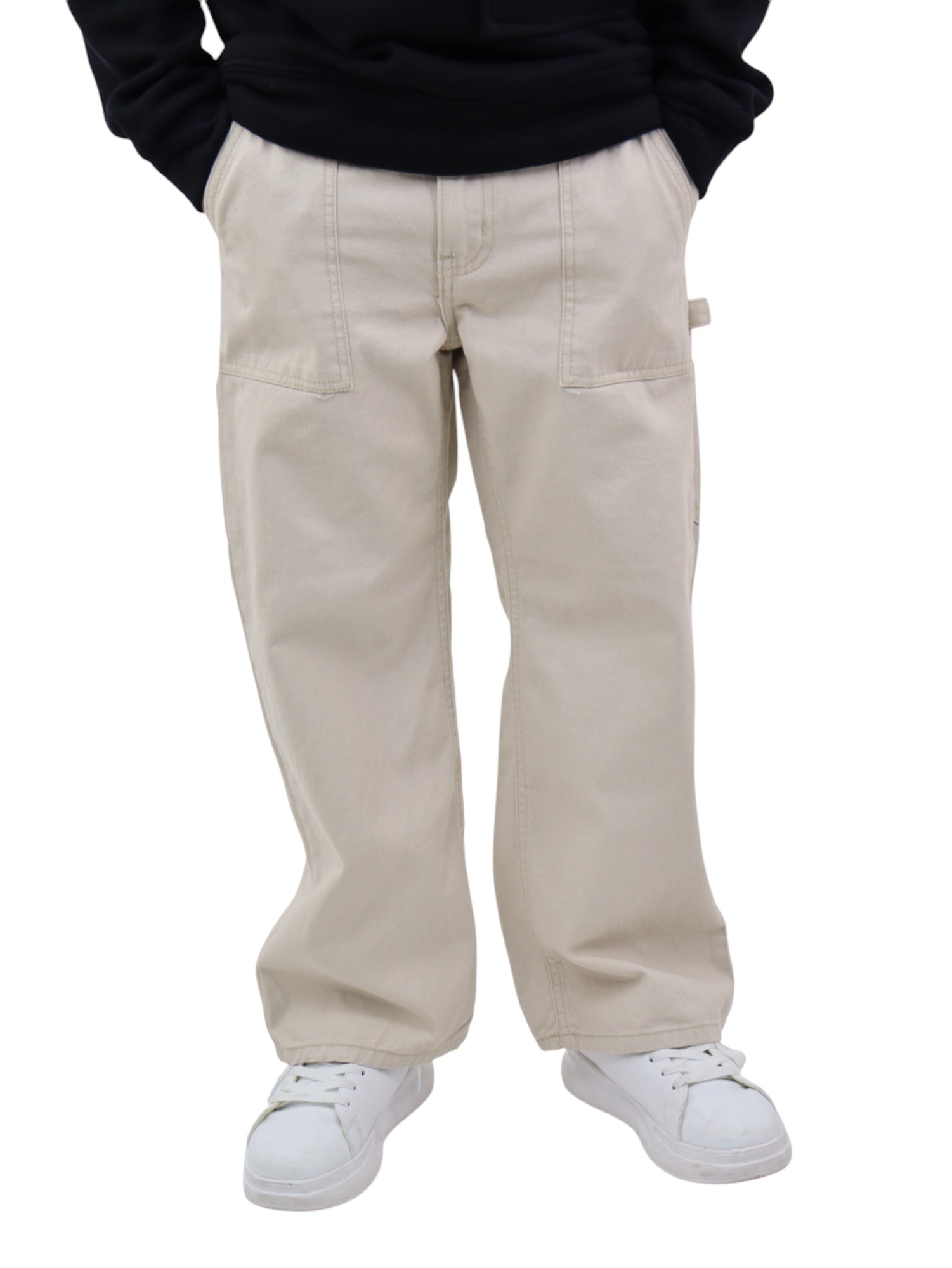 Pantalón baggy carpintero de gabardina talle alto, con bolsillos en la parte delantera y trasera, cierre de botón y cremallera. Lavado beige claro