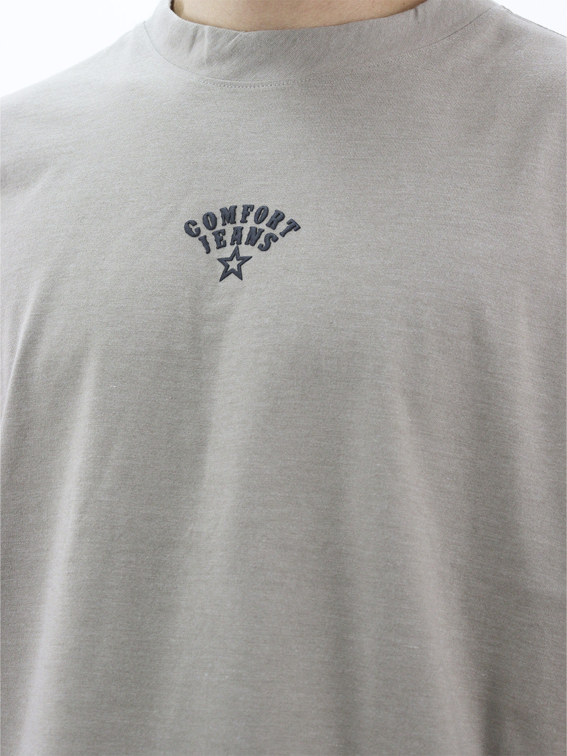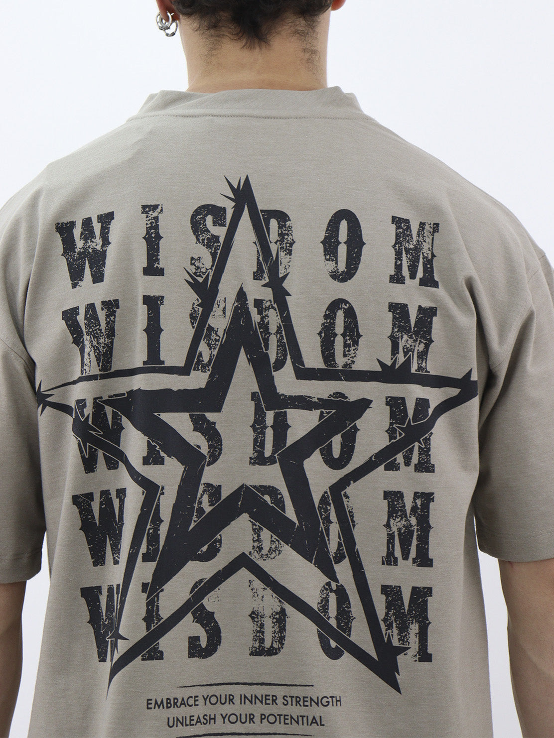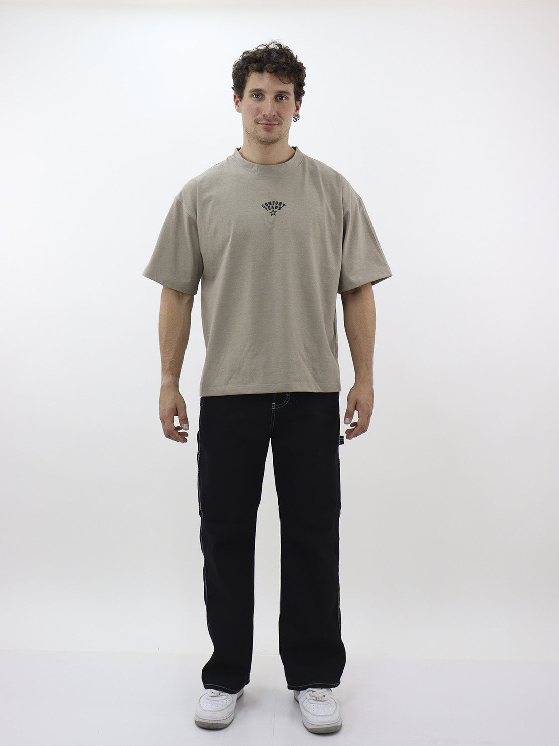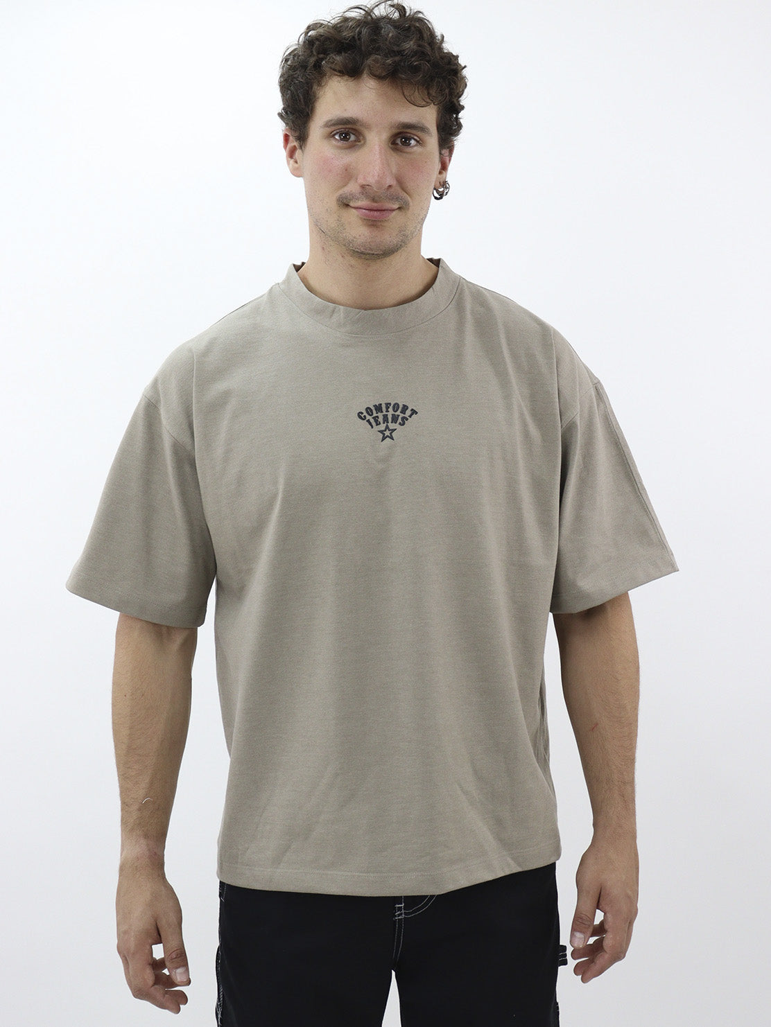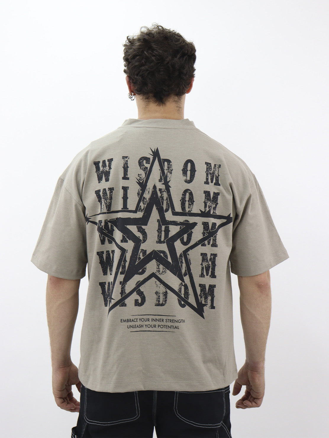 Playera box fit de color camel con gráfico y texto en la espalda y en la parte delantera, de manga corta, con cuello redondo.