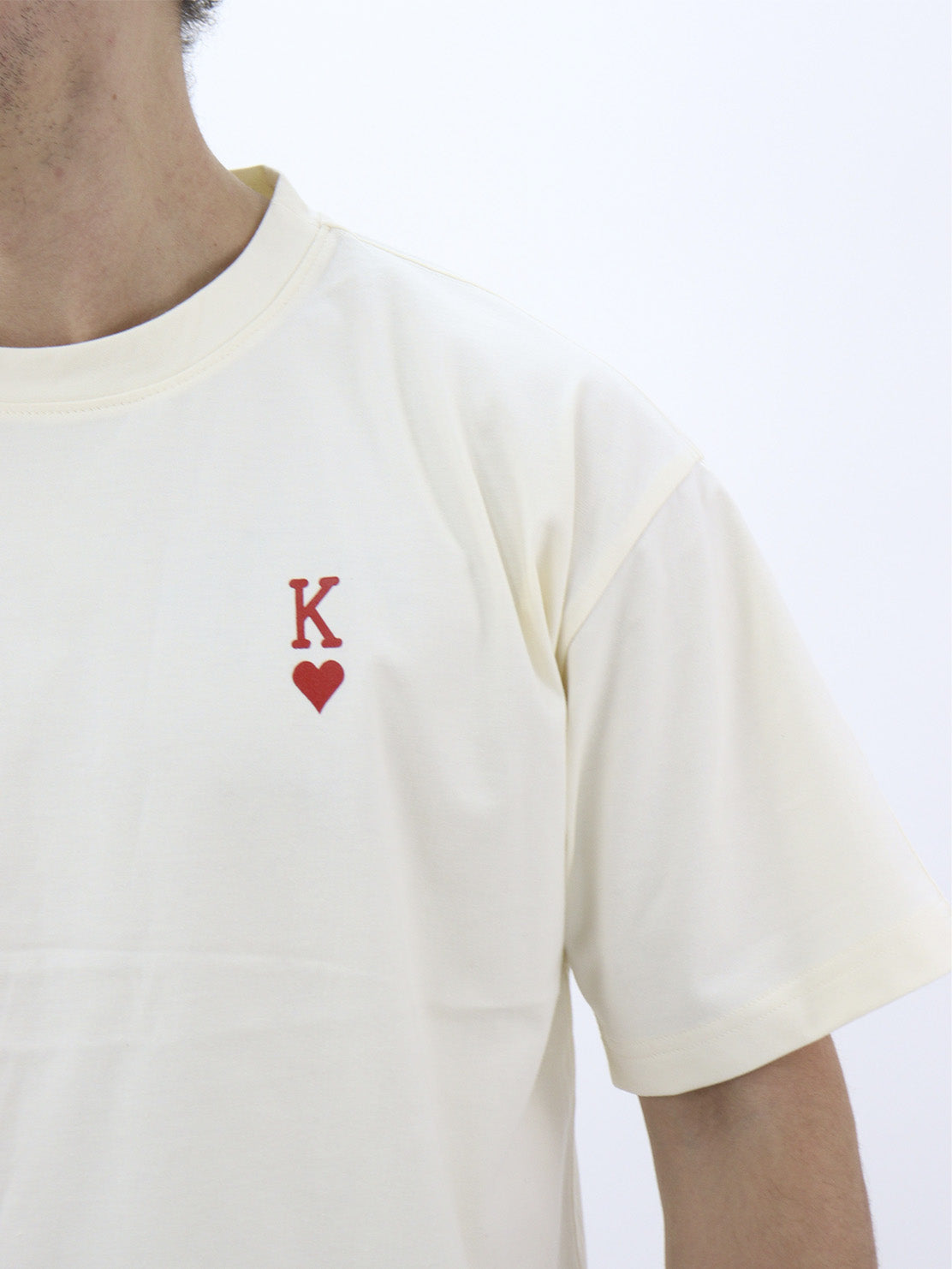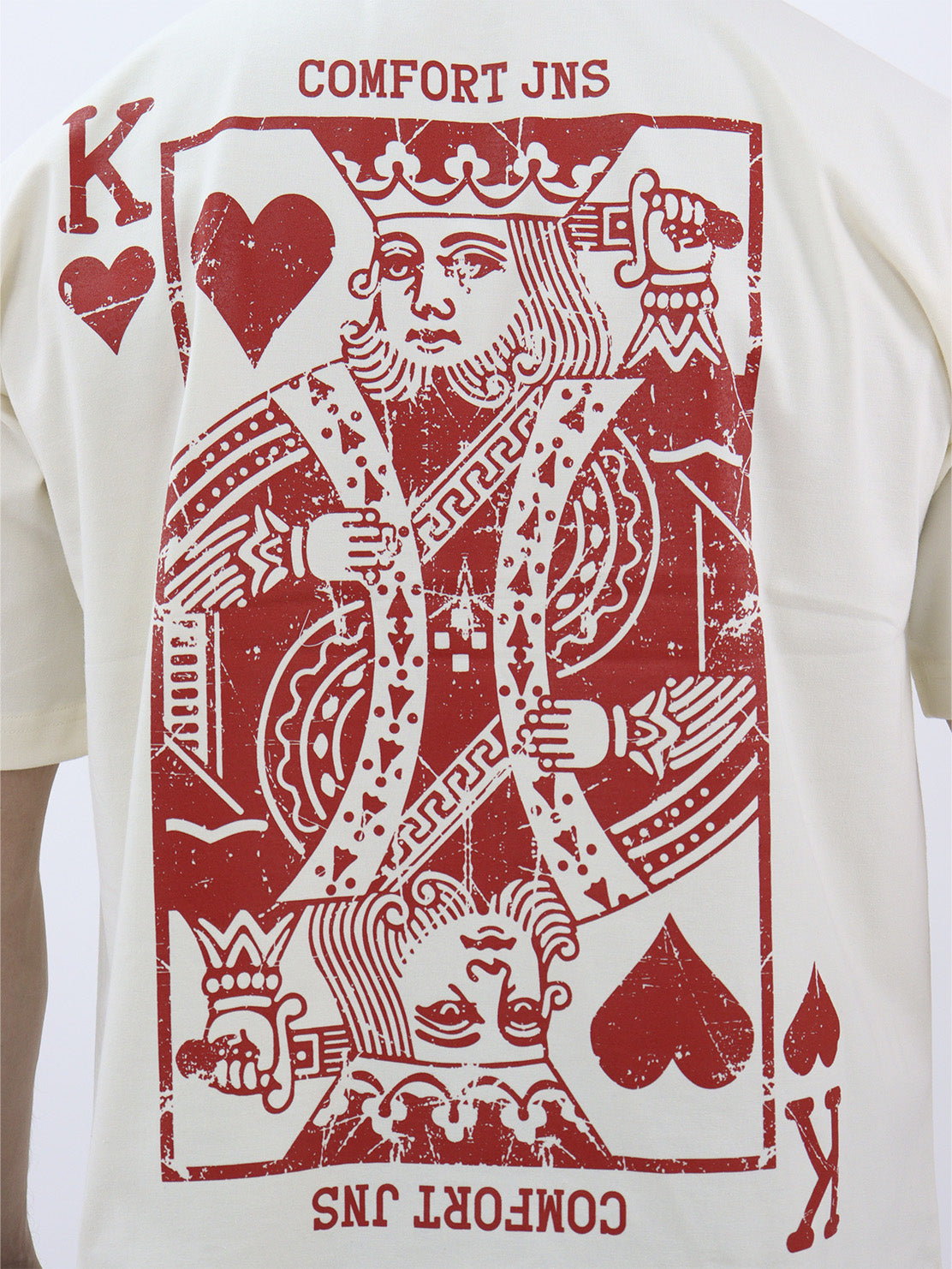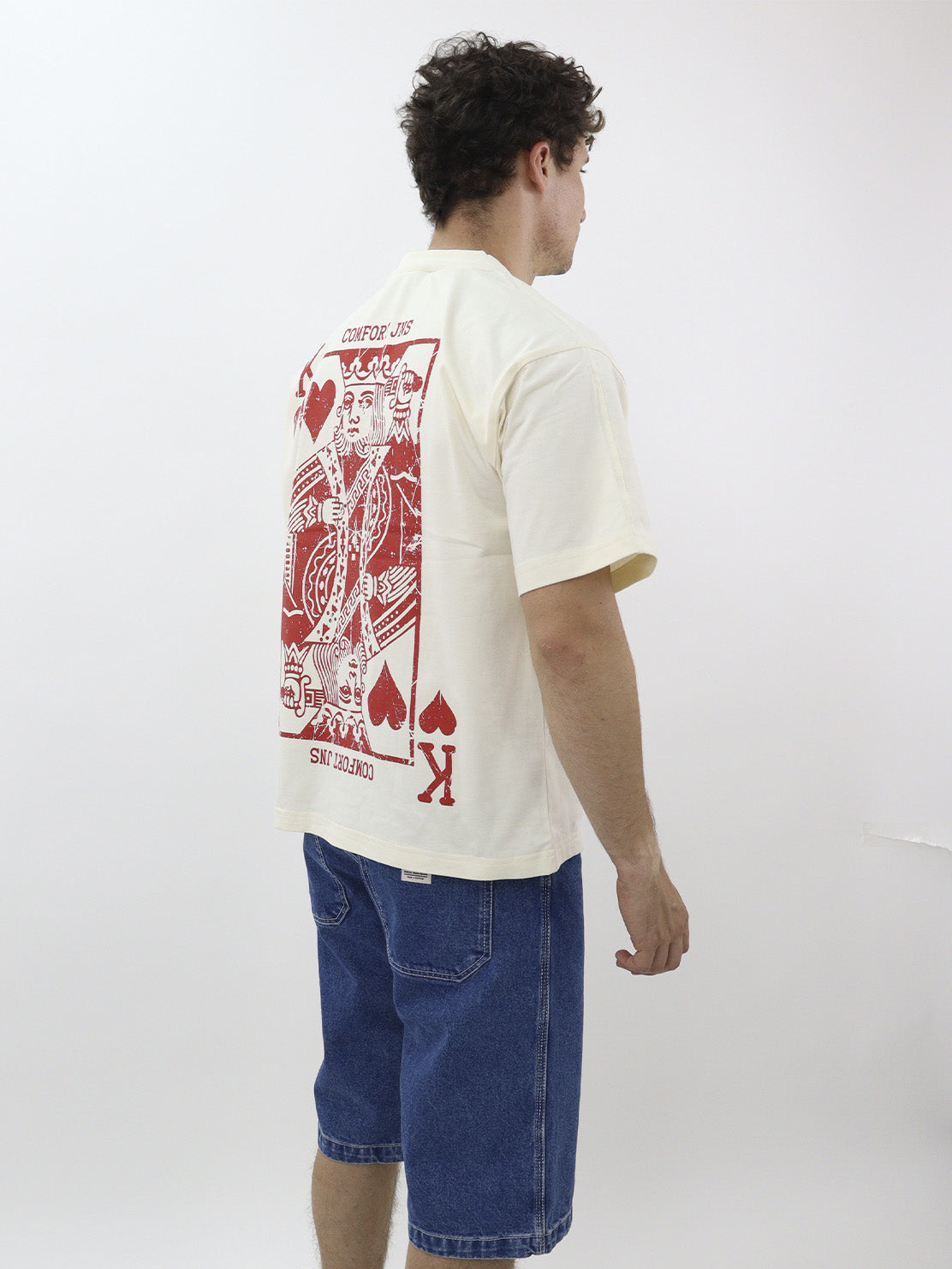 Playera box fit de color beige con gráfico y texto en la espalda y en la parte delantera, de manga corta, con cuello redondo.