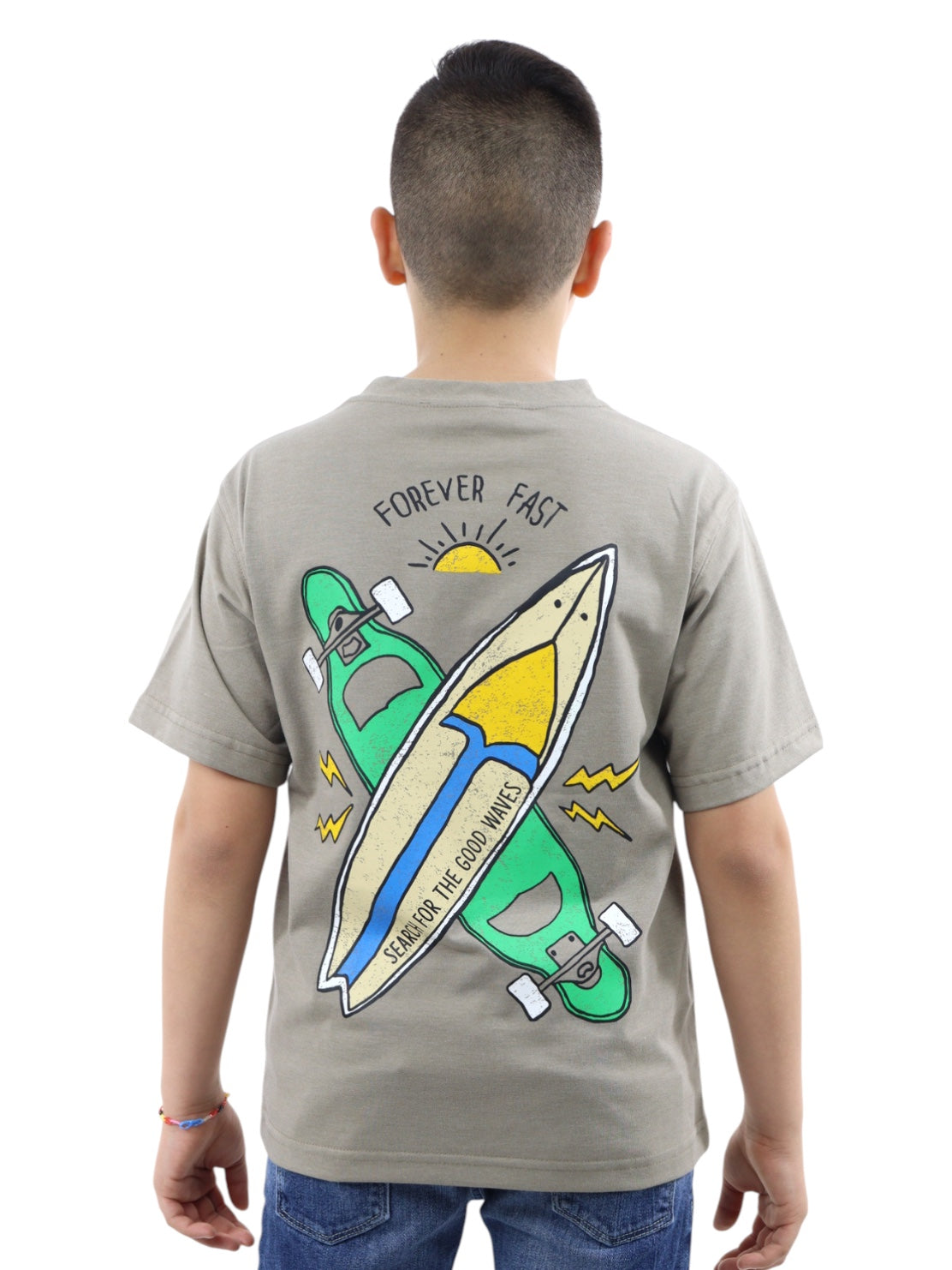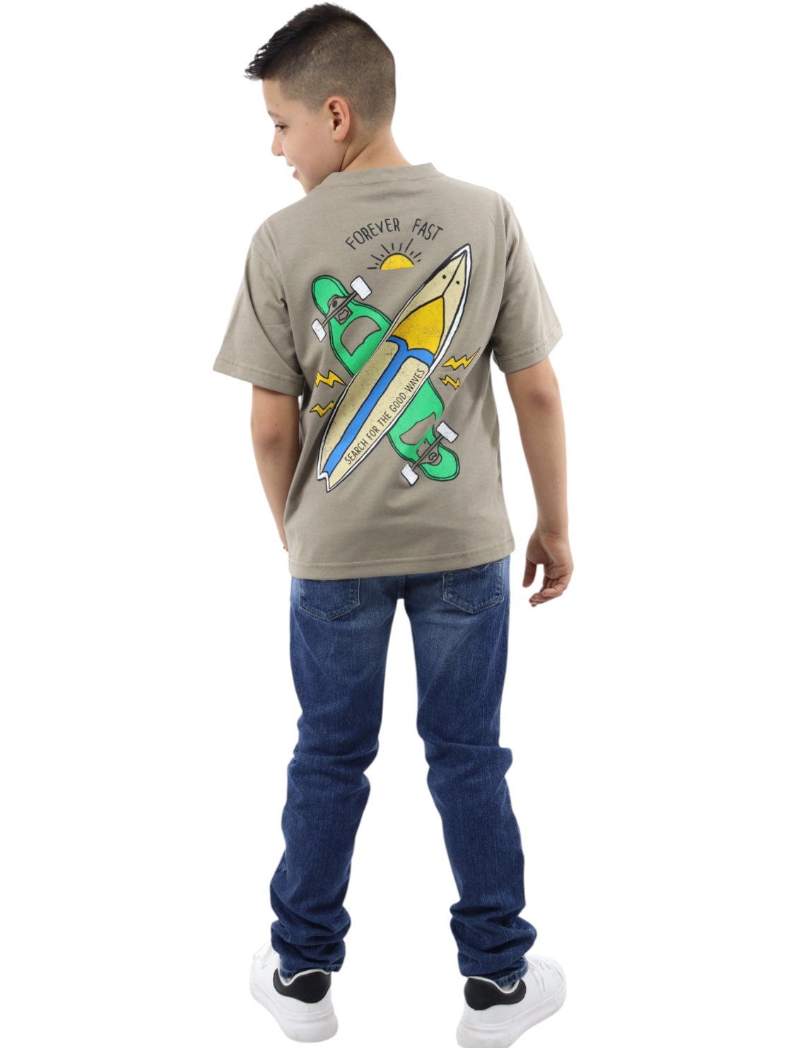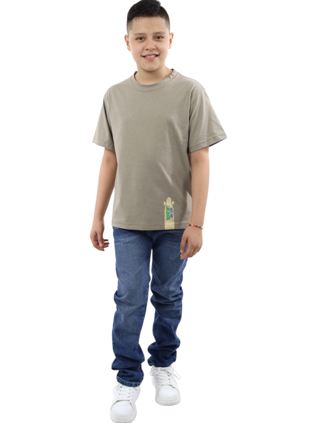 Playera box fit de color camel con gráfico skateboard, cuello redondo