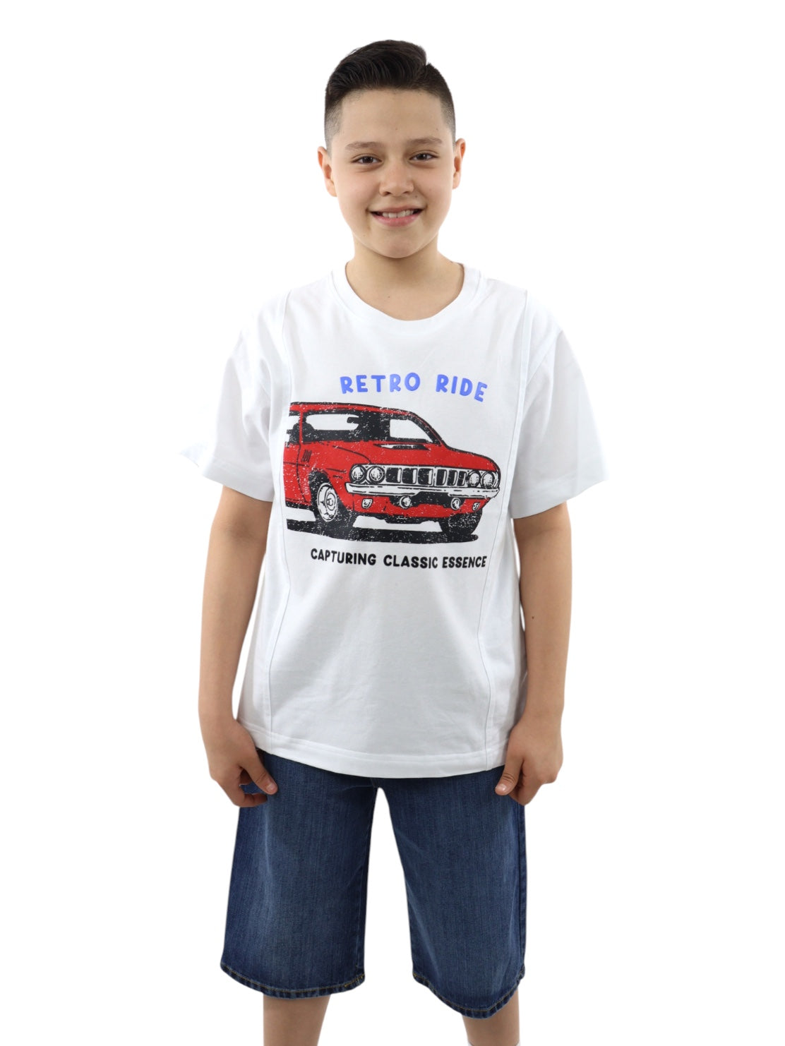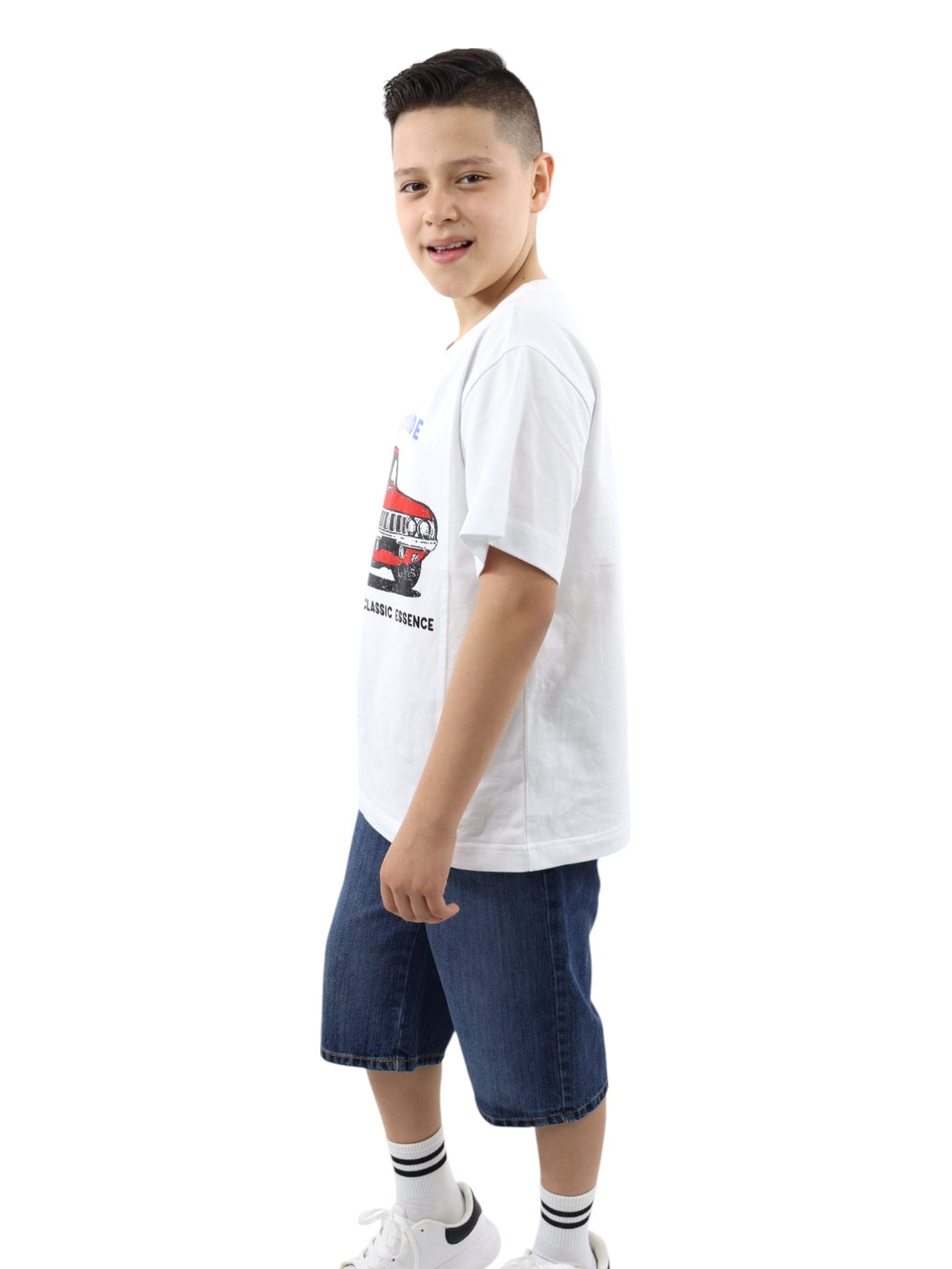 Playera boxy fit de color blanco con gráfico de auto clásico, cuello redondo