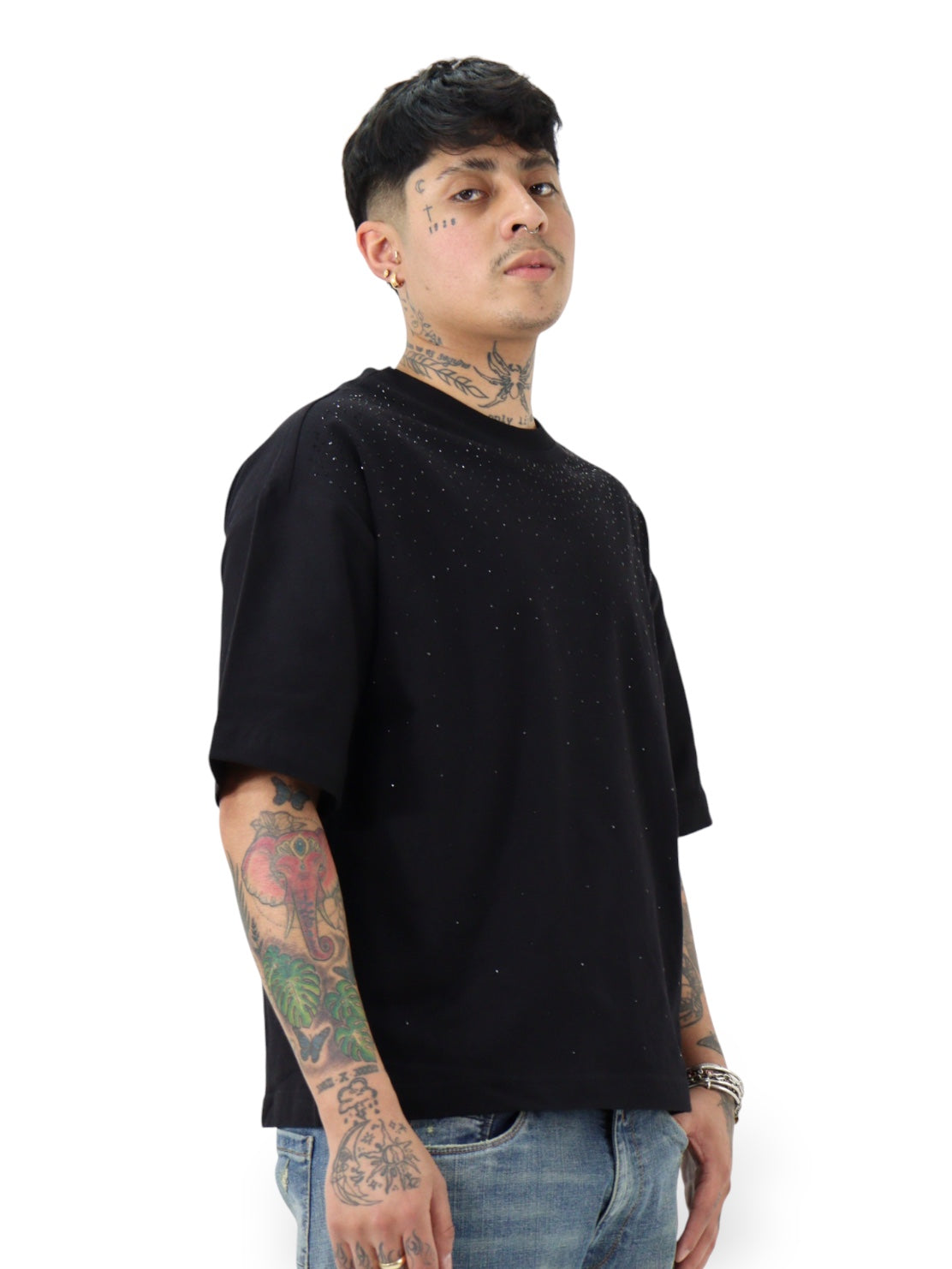 Playera boxy fit manga corta de color negro con brillos