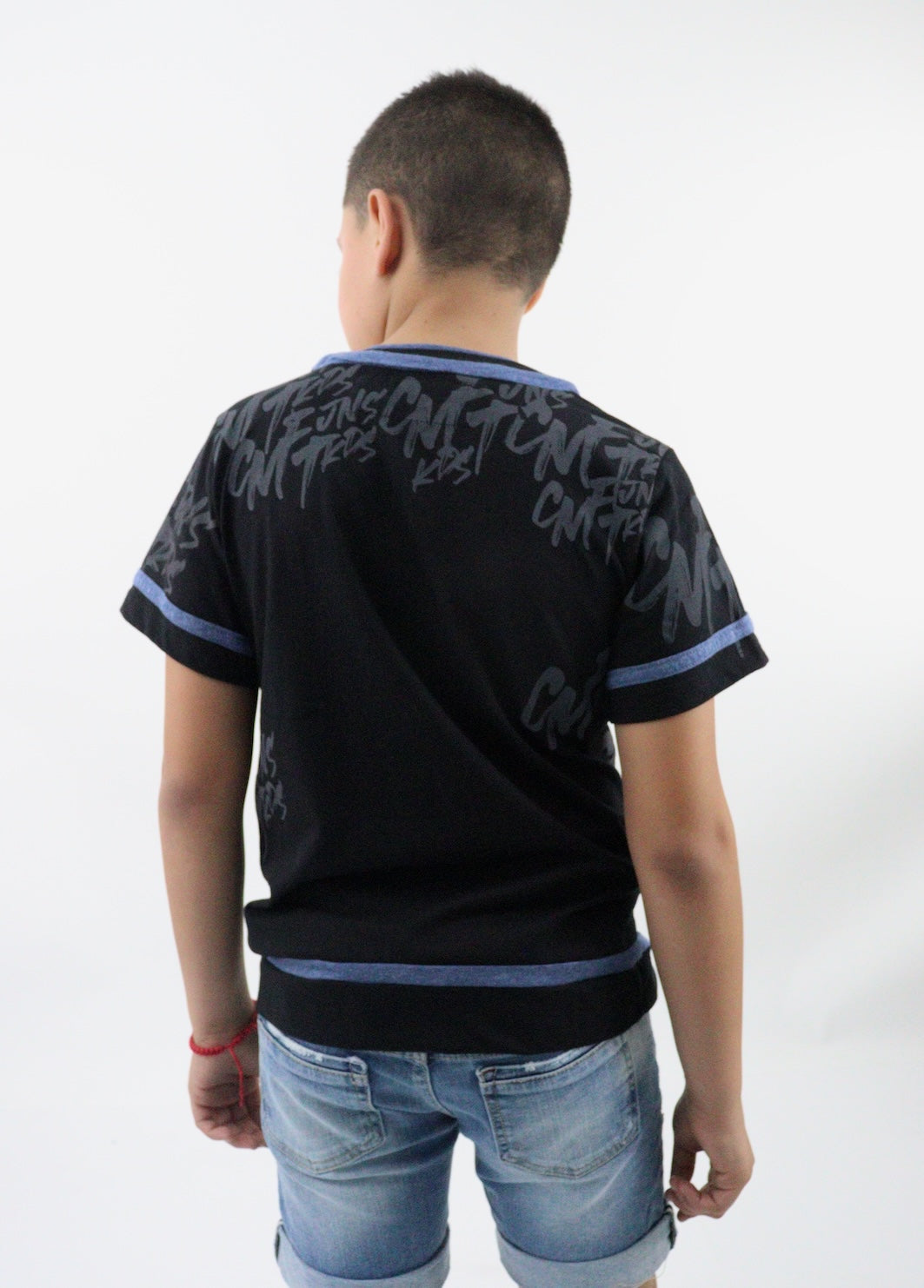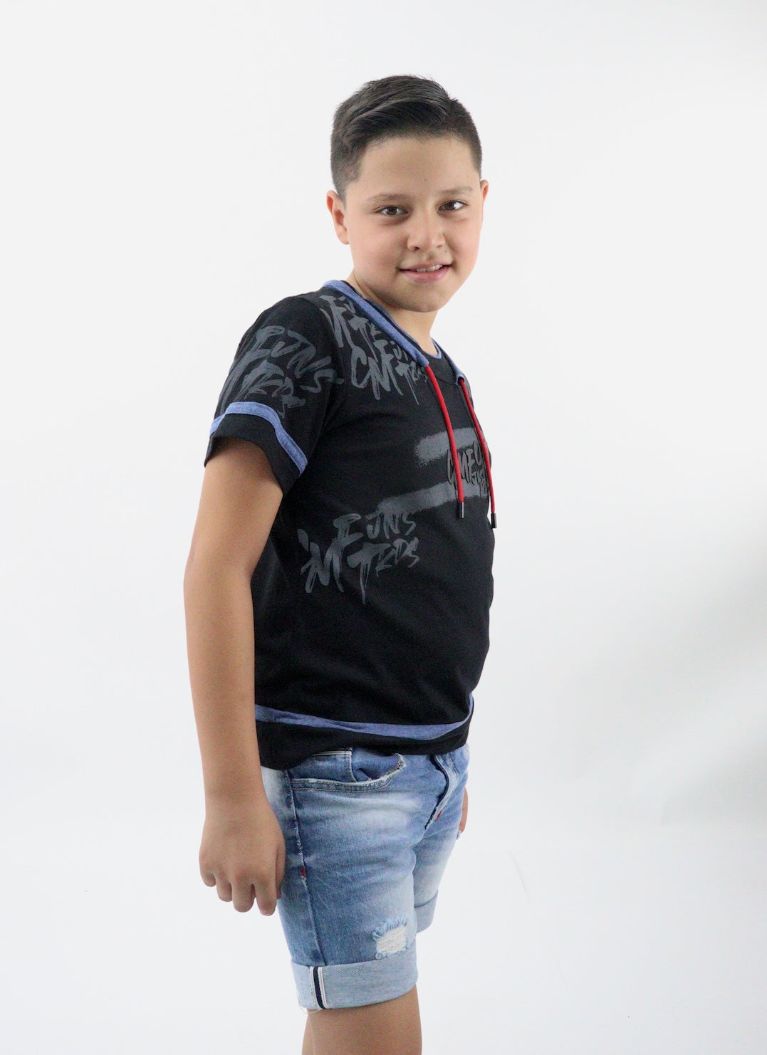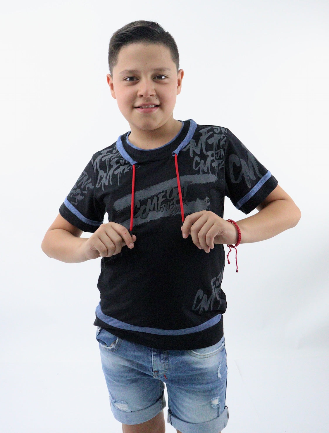 Playera manga corta de color negro con estampado y jareta ajustadora en cuello