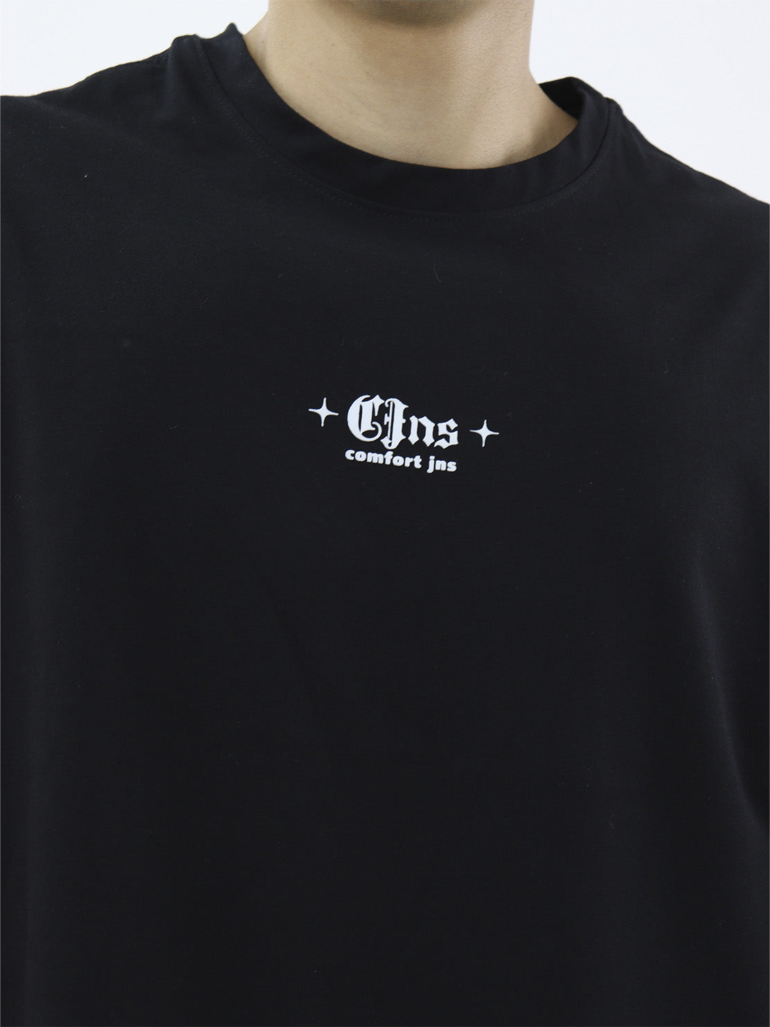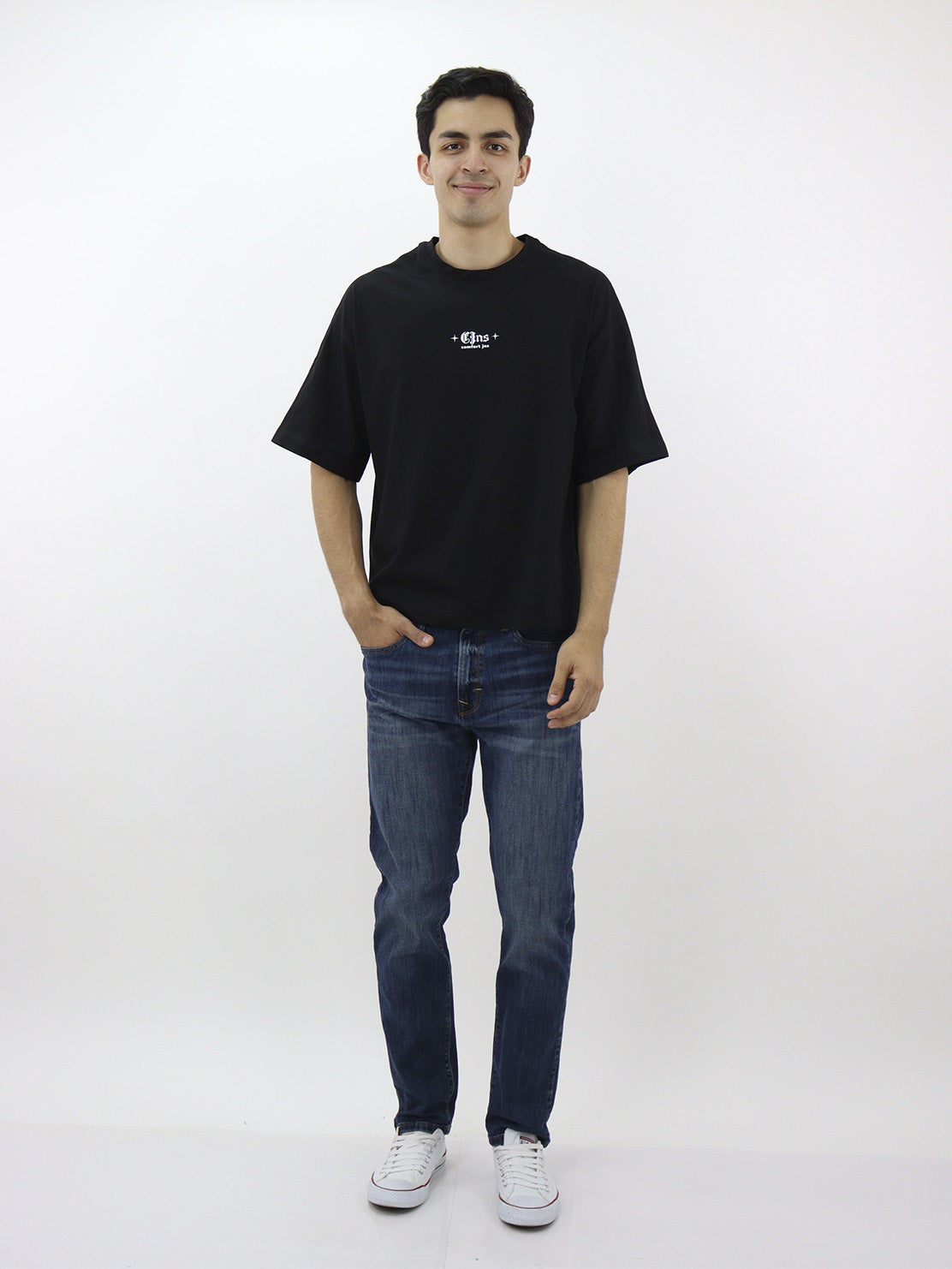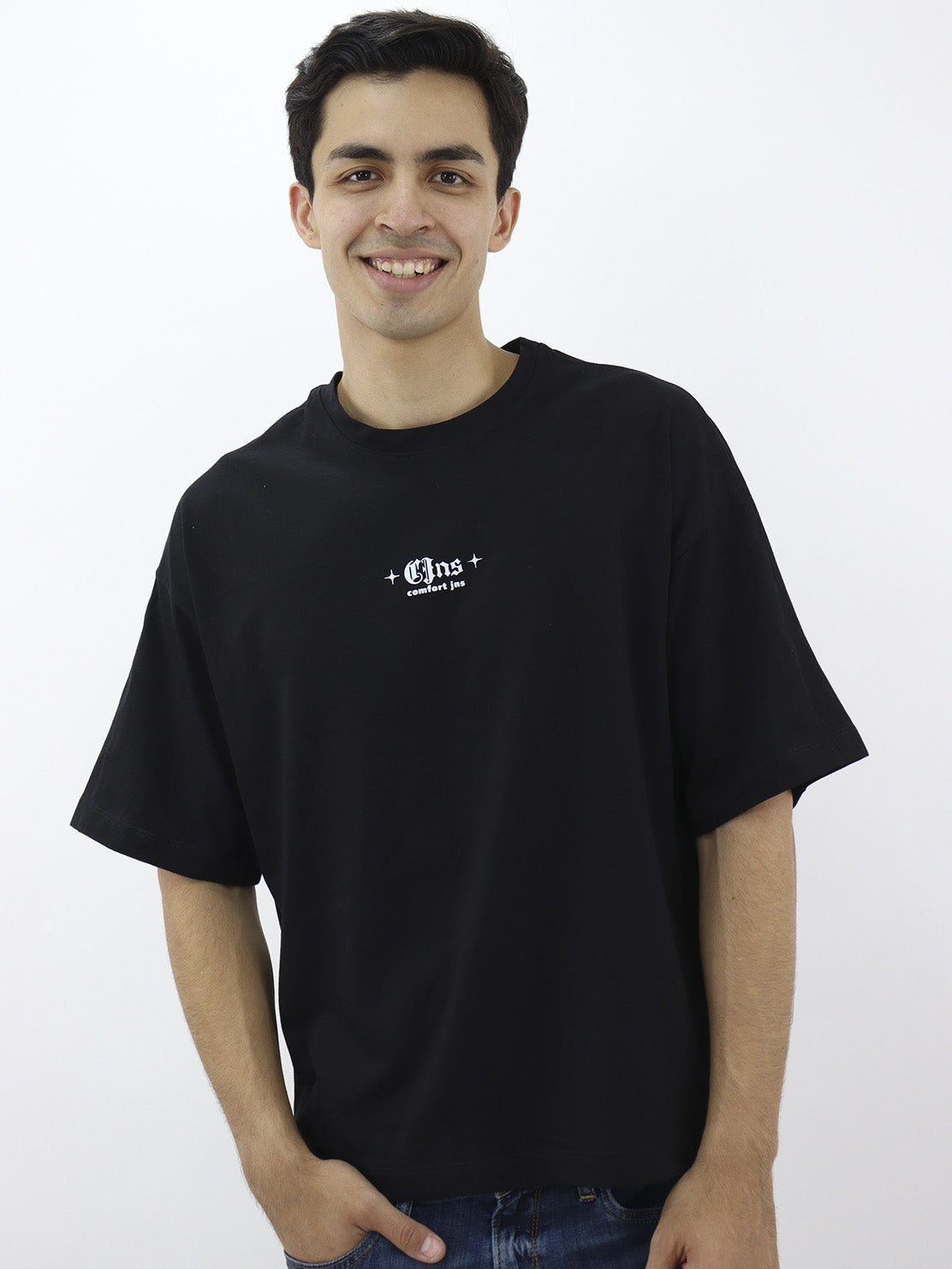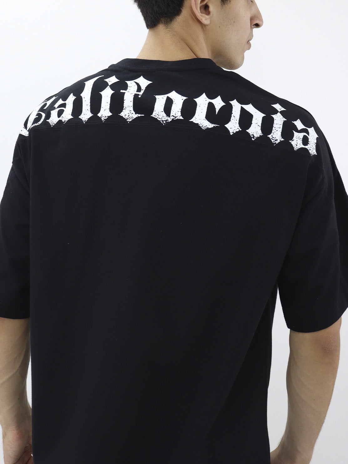 Playera oversize de color negro con gráfico y texto en la espalda y en la parte delantera, de manga corta, con cuello redondo.