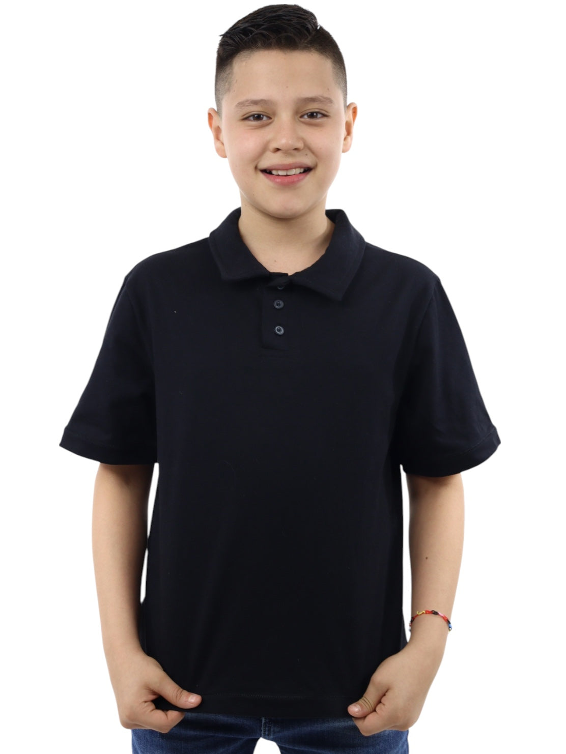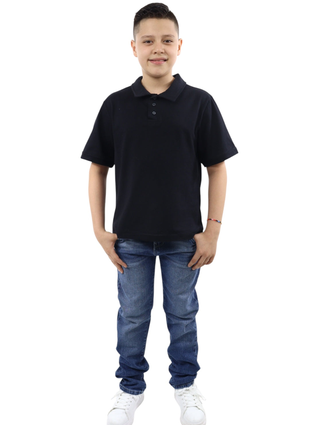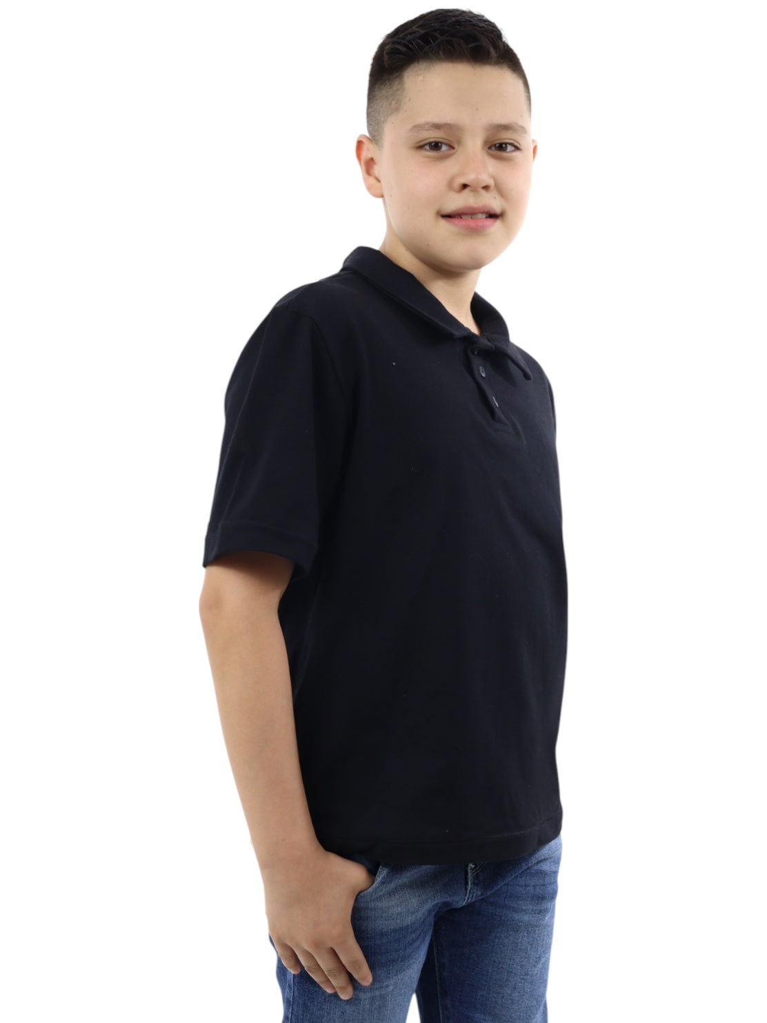 Playera polo con botones, cuello de camisa, manga corta, tono negro.