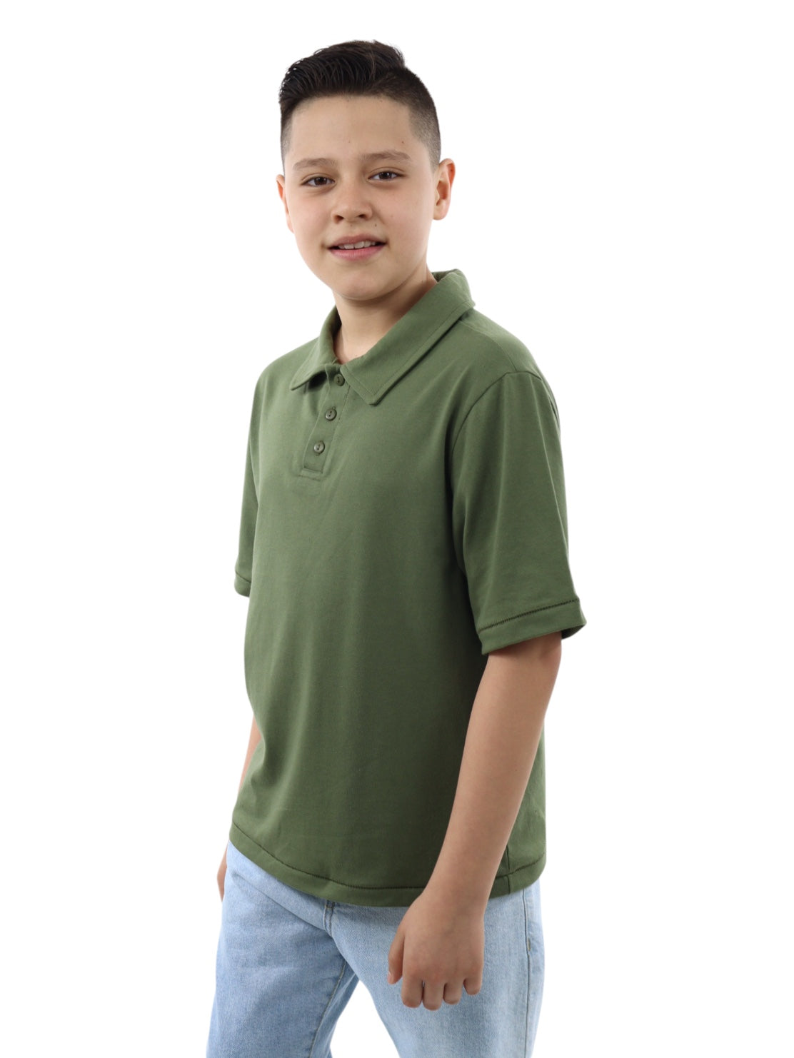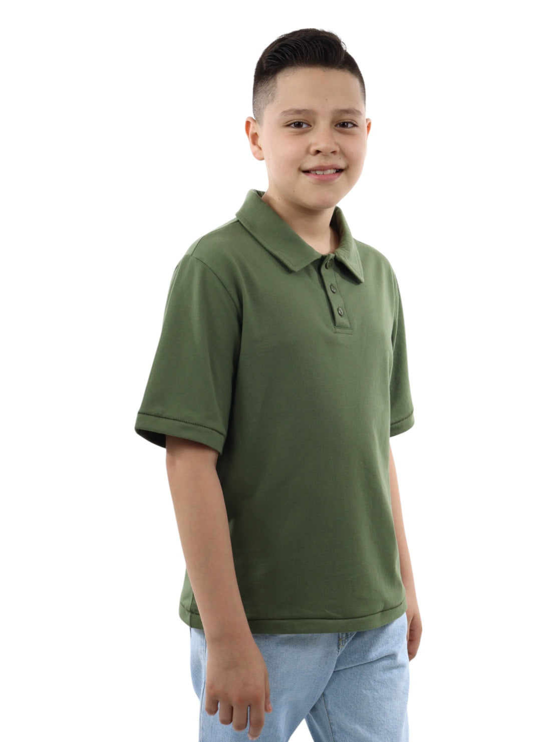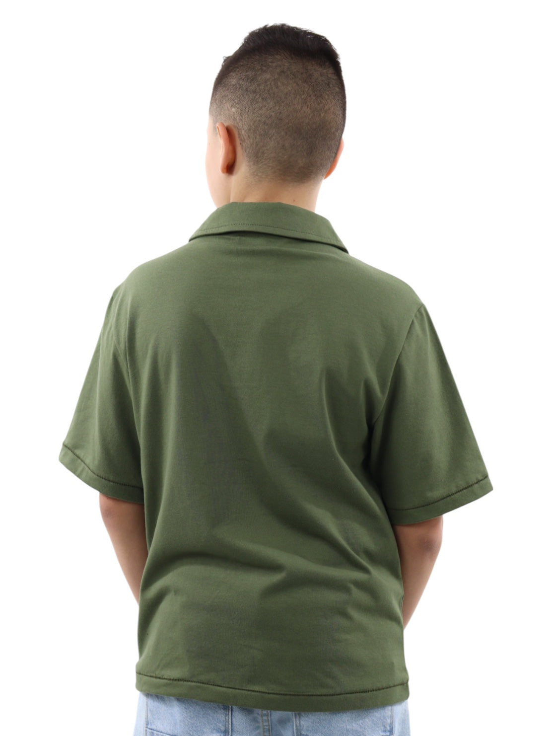 Playera polo con botones, cuello de camisa, manga corta, tono verde militar.