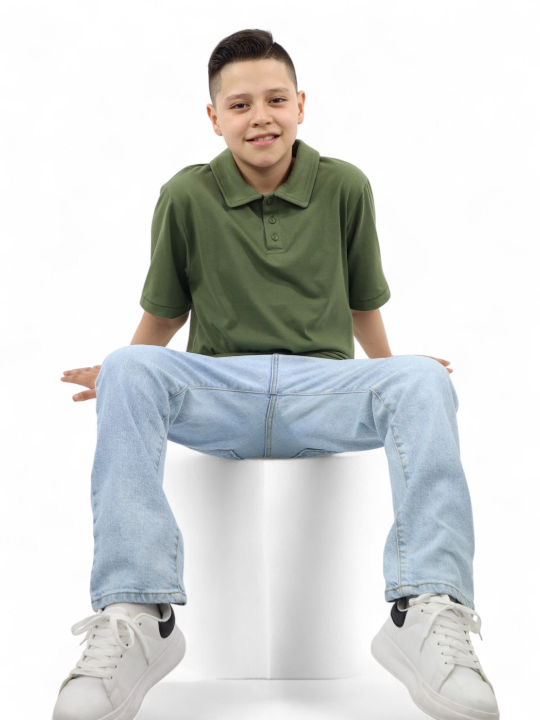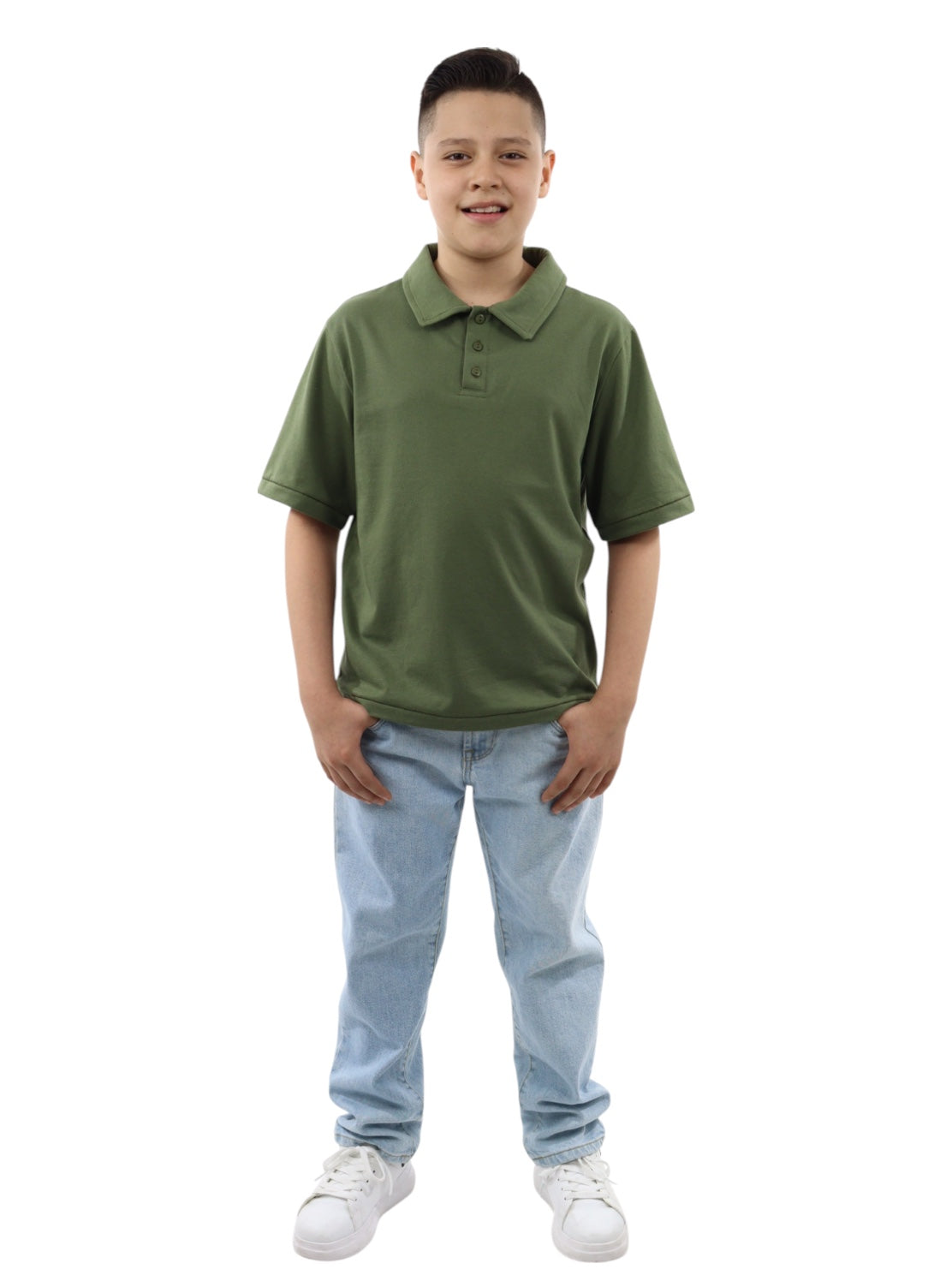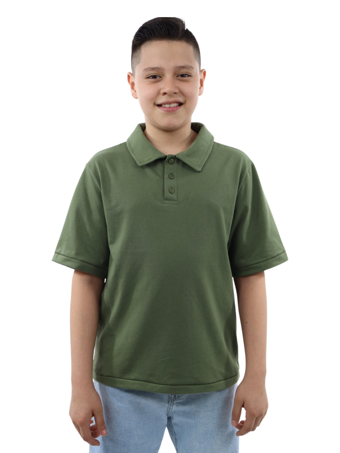 Playera polo con botones, cuello de camisa, manga corta, tono verde militar.