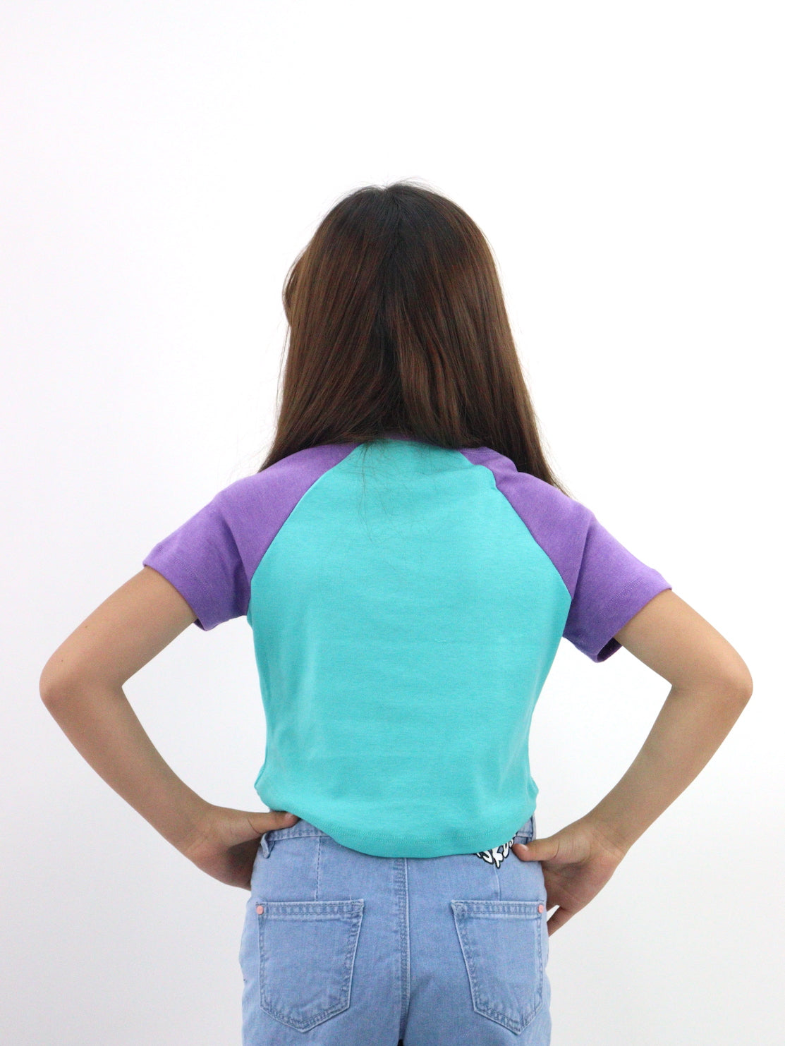 Playera raglán manga corta de color morado/verde turquesa, con bordado floral